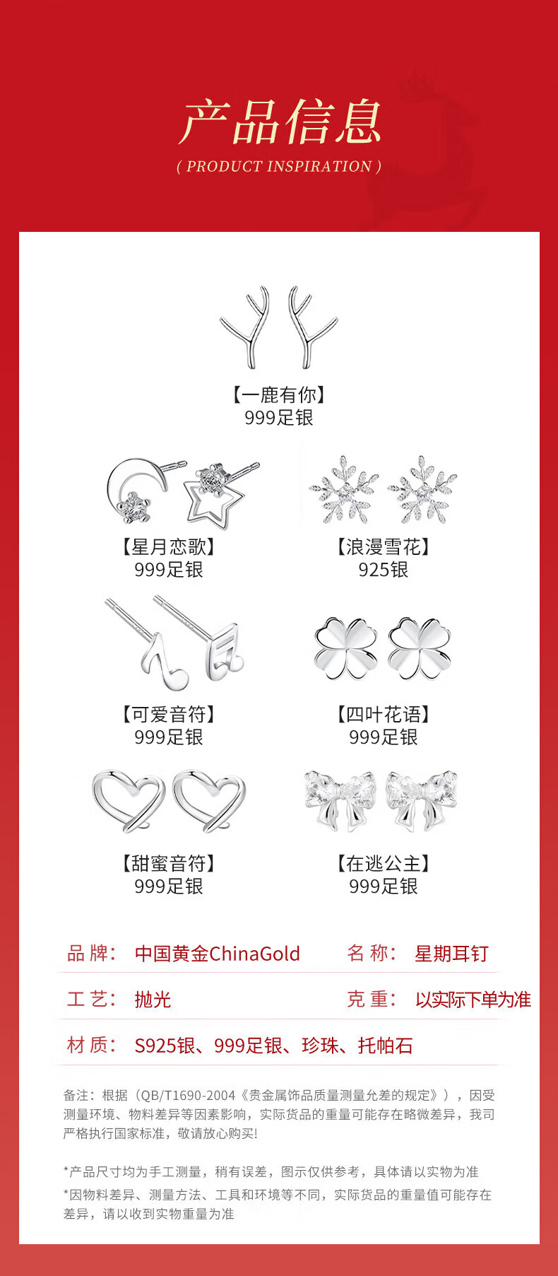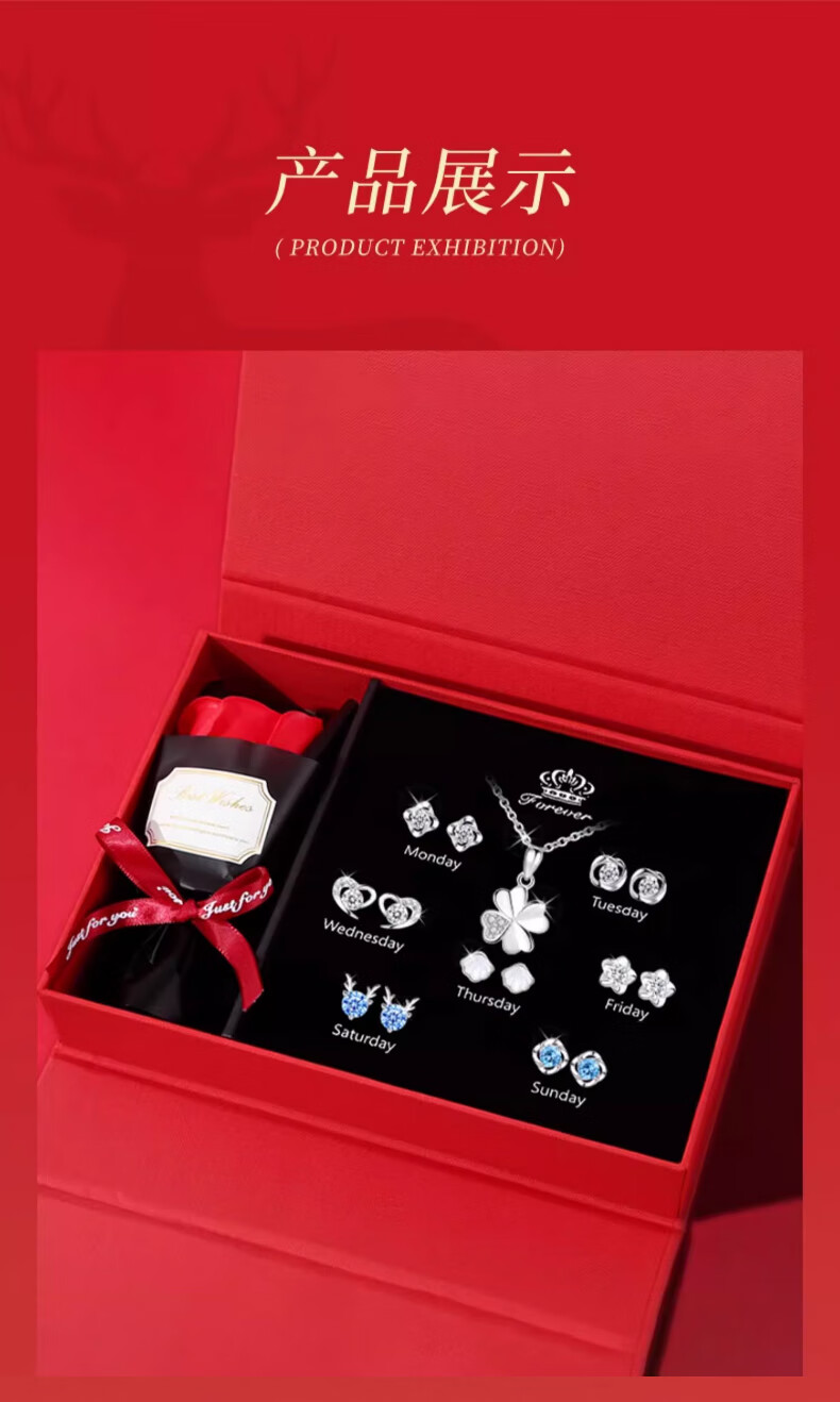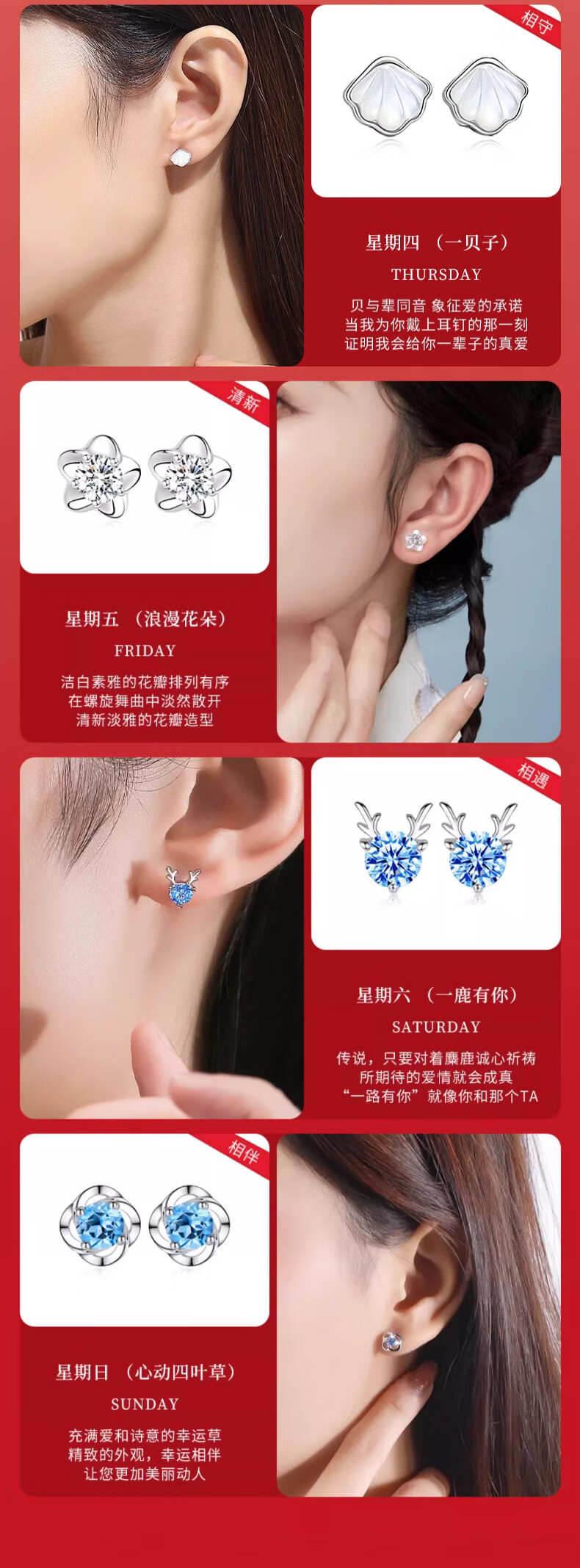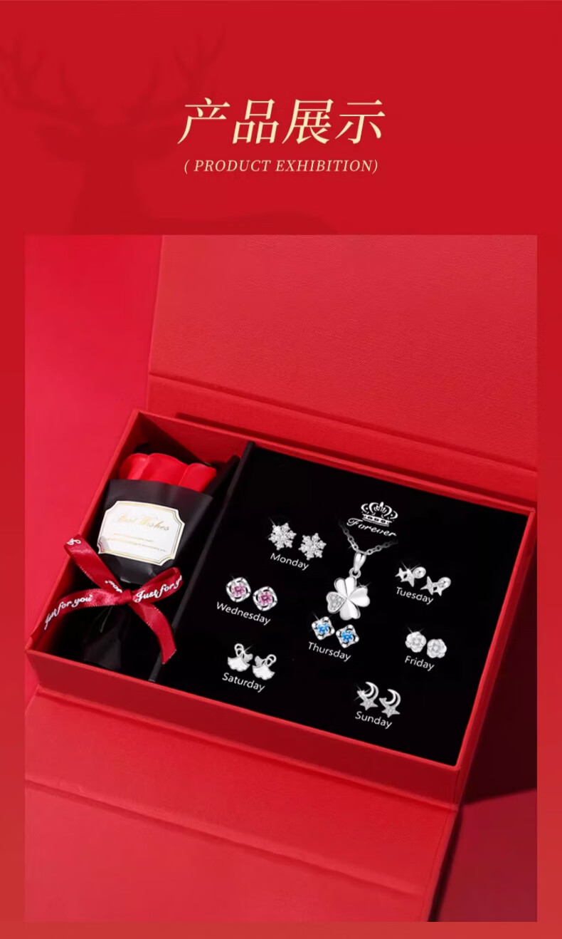 CHINA GOLD Pure Silver One Week Earrings Women's Earrings Gift Box Set Earrings Practical Heartfelt Commemorative Valentine's Day Practical Birthday Gift Gift for Girlfriend * One Week Earrings * Seven Pairs Premium Rose Gift Box