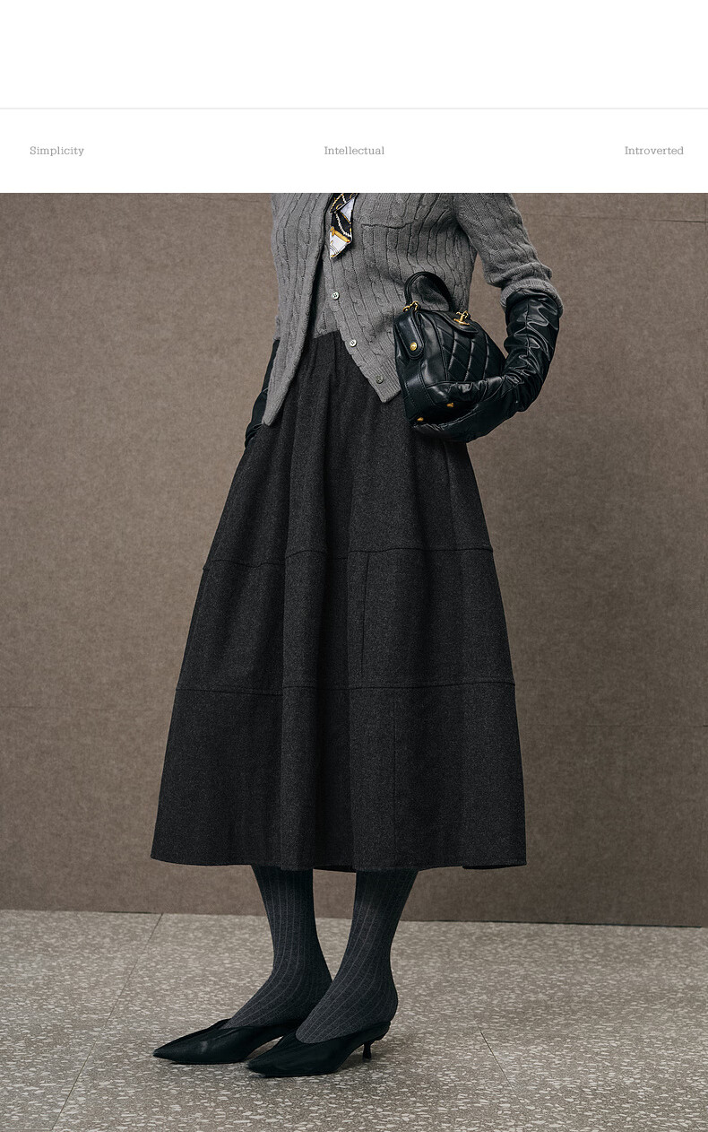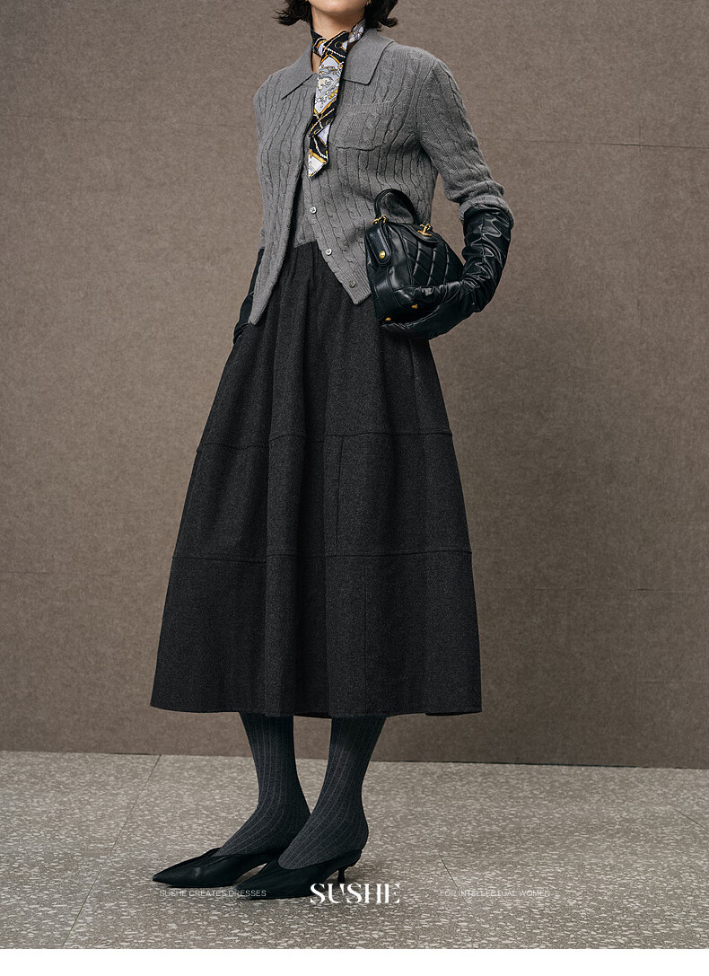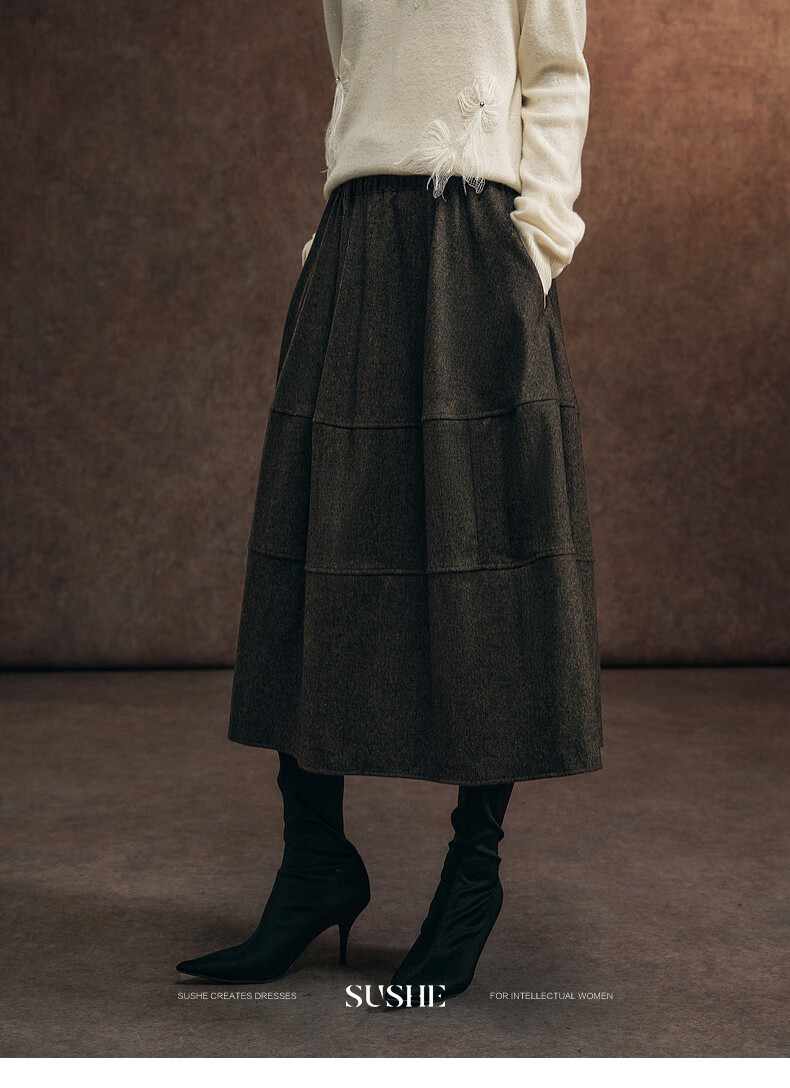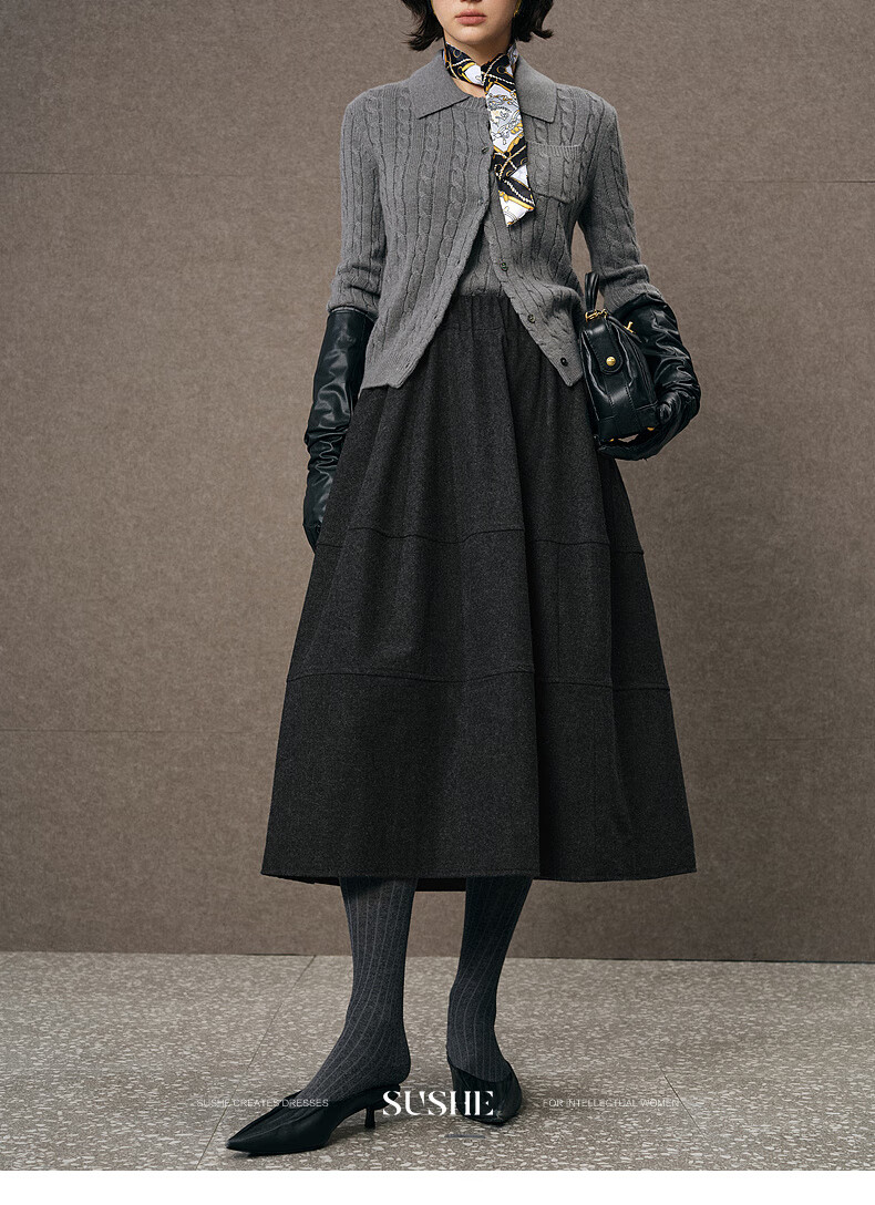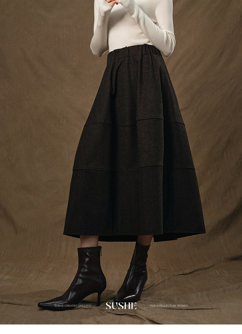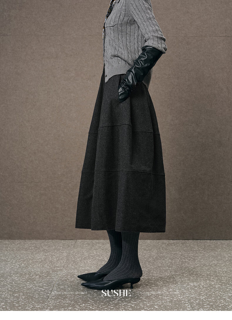 SUSHE Variations Hepburn Style Heavy Wool Structured Skirt Elastic Waist Swing Umbrella Skirt Women Dark Gray M
