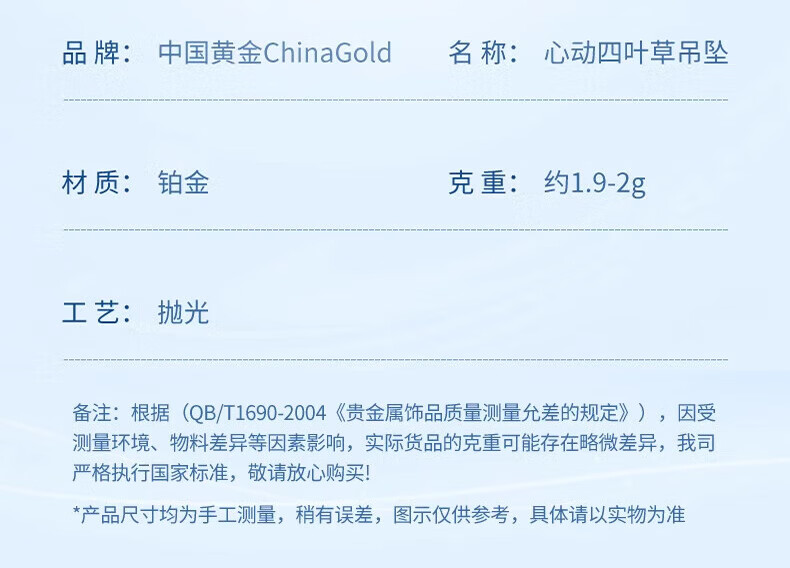 China Gold (CHINA GOLD) Four-leaf clover platinum pendant for women PT950 platinum necklace platinum clavicle chain wedding birthday gift for girlfriend Jingsuda platinum four-leaf clover pendant about 1.9g free silver chain