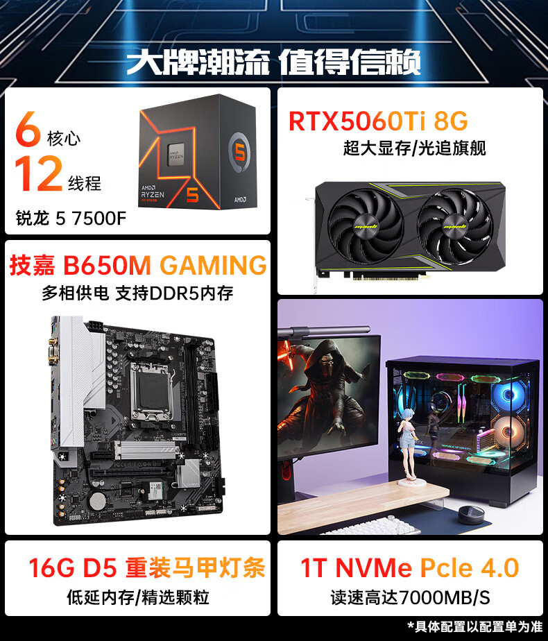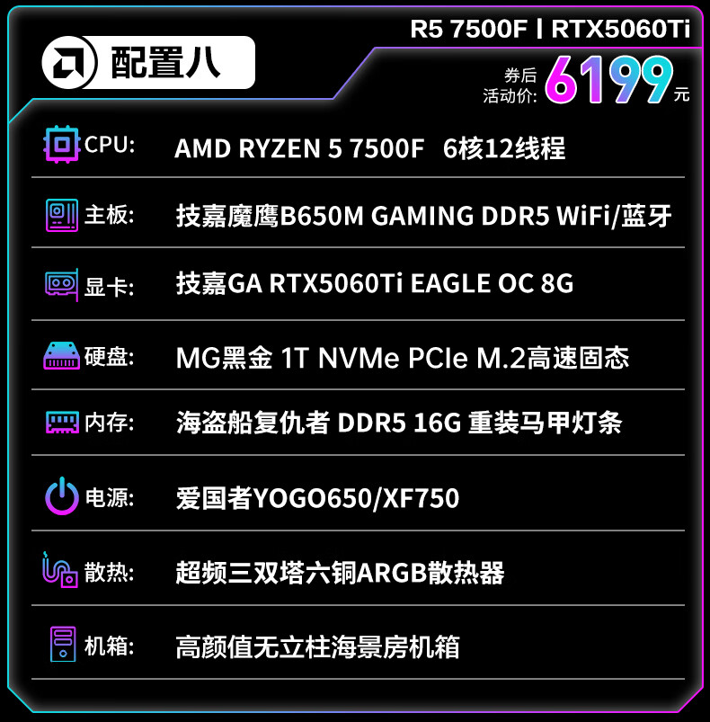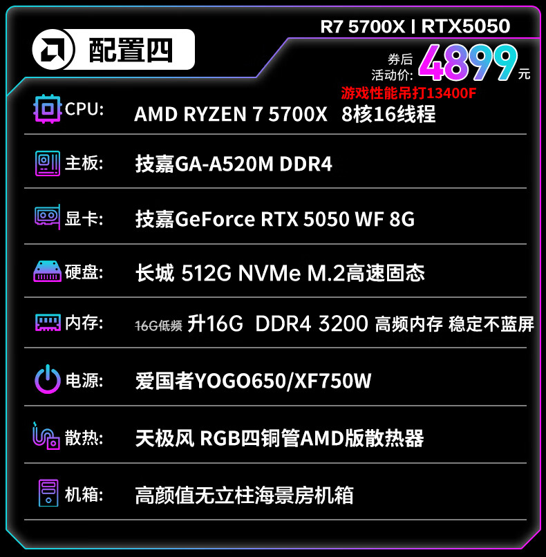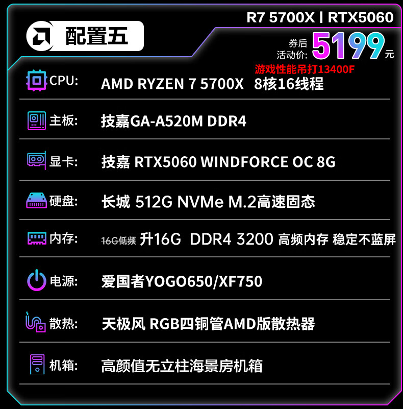 Gigabyte AMD Ryzen R7 5700X/R5 7500F assembled computer RTX4060/5060/Ti graphics card live e-sports game design desktop computer host DIY assembly machine configuration five R7 5700X丨RTX5060