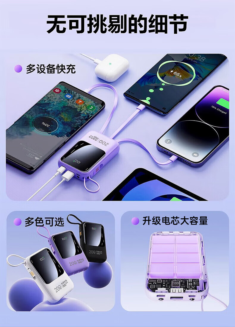 Epcbook direct sales national standard 3C certified 20000 mAh power bank with built-in cable for fast charging, can be used on airplanes, large-capacity mobile power supply, ultra-thin, compact and portable, suitable for Xiaomi, Apple and Huawei flagship version, four-wire fast charging | compact and portable | 666% faster; national 3C certification | can be used on airplanes; 1 million+ large mAh sold