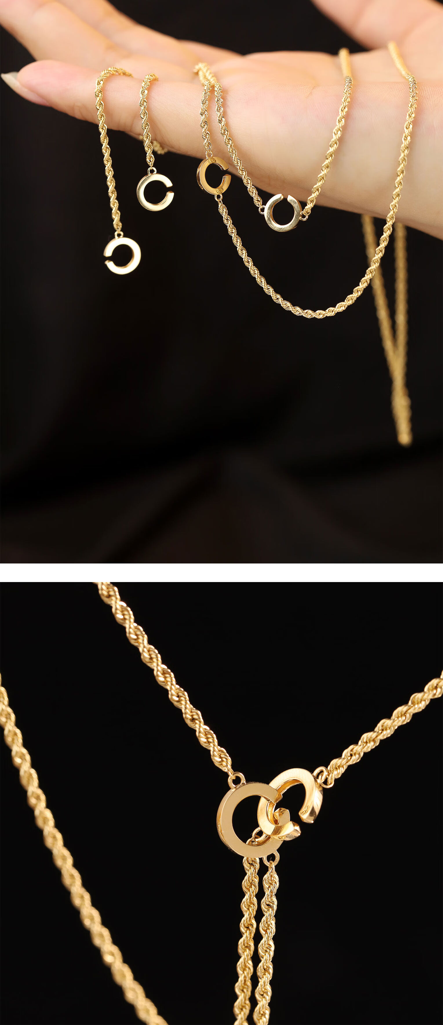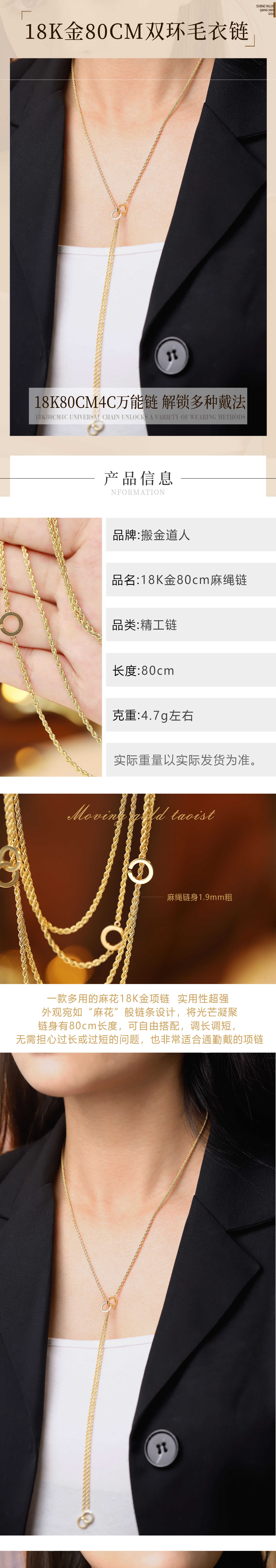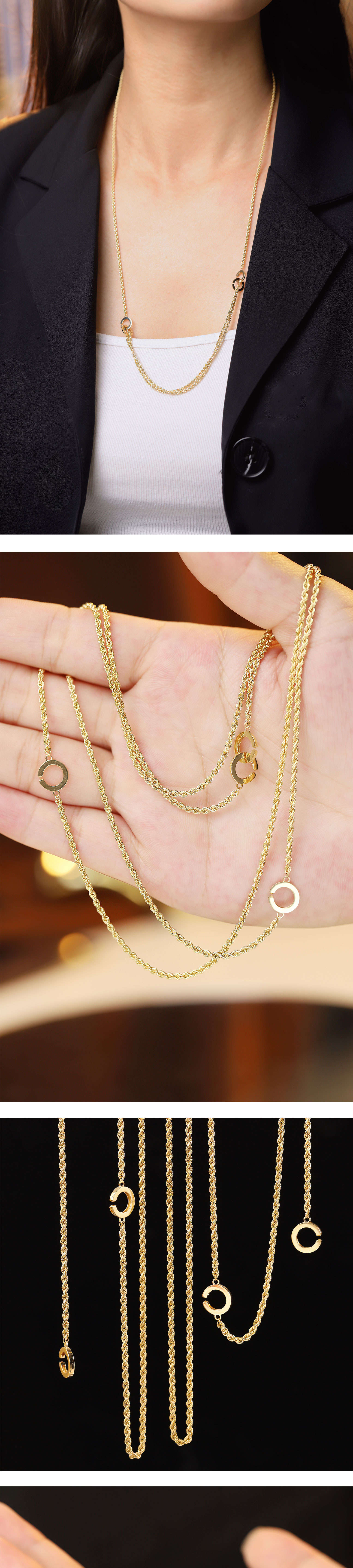 Bao Zha Jin Taoist 18K gold double ring hemp rope chain multi-purpose multi-wear braided twist sweater clavicle necklace for women 18K gold 80cm double ring hemp rope