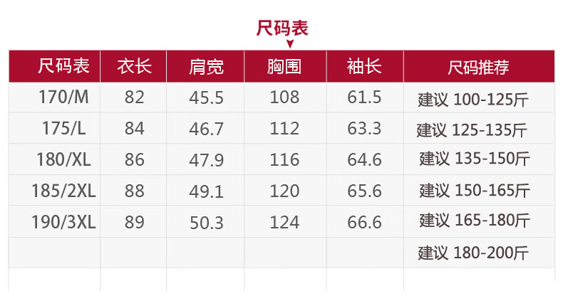 China (cm) 165 / 88-90 170 / 96-98 175 / 108-110 180 / 118-122 185 / 126-130