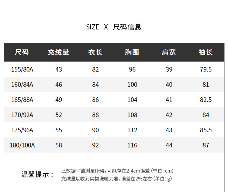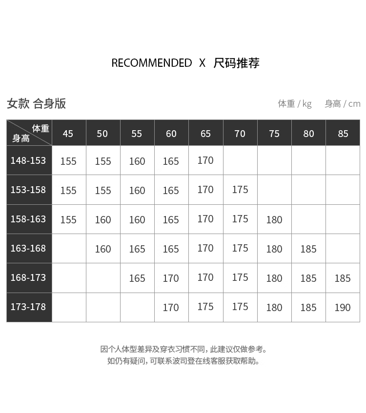 China (cm) 160-165/84-86 165-170 / 88-90 167-172 / 92-96 168-173 / 98-102 170-176 / 106-110