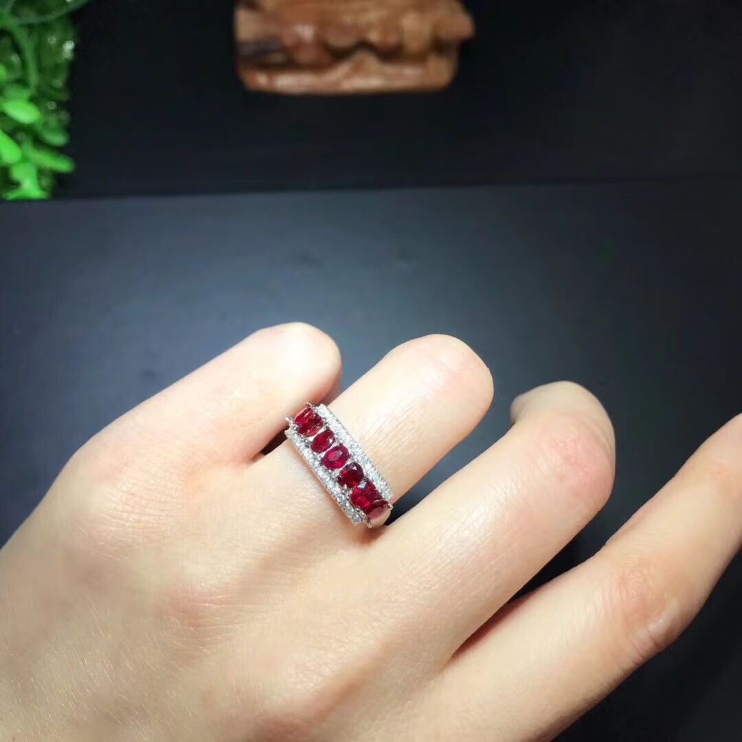 Baozha silver inlaid natural ruby ring stone size 3*4MM pigeon blood red ruby row ring live female ring