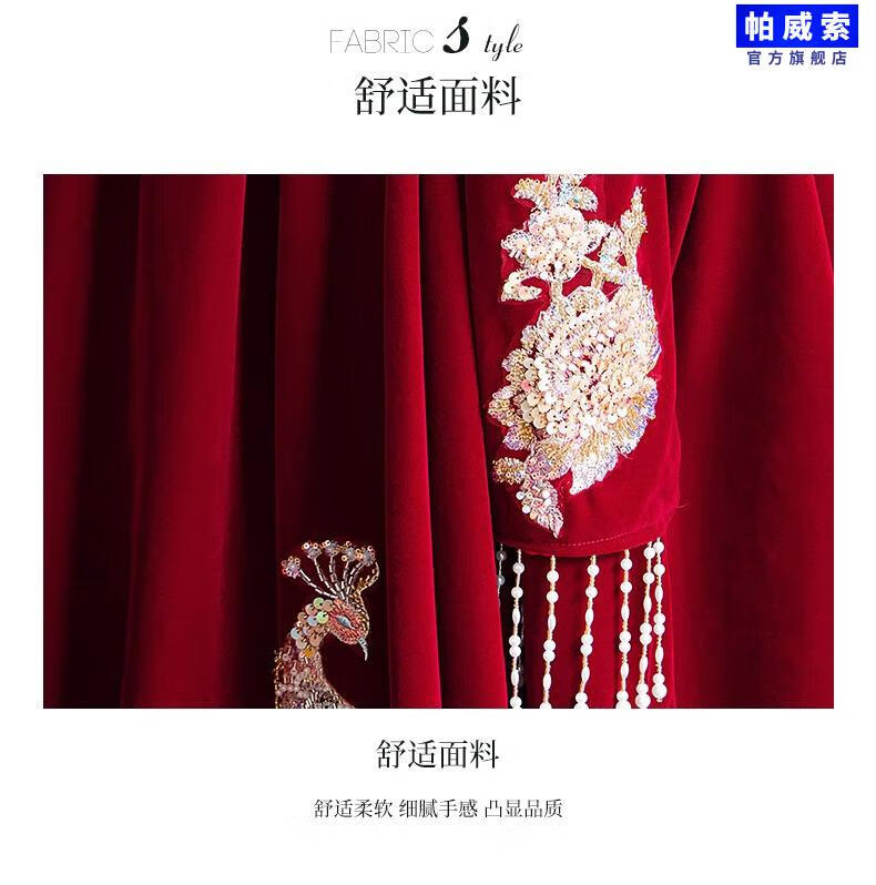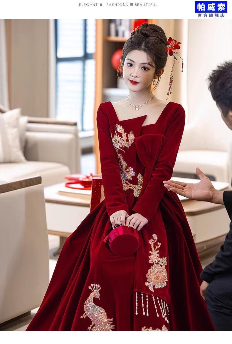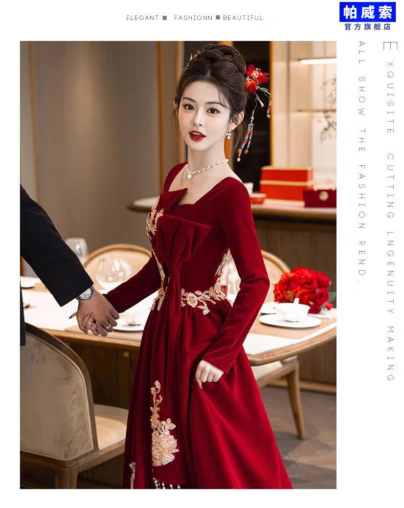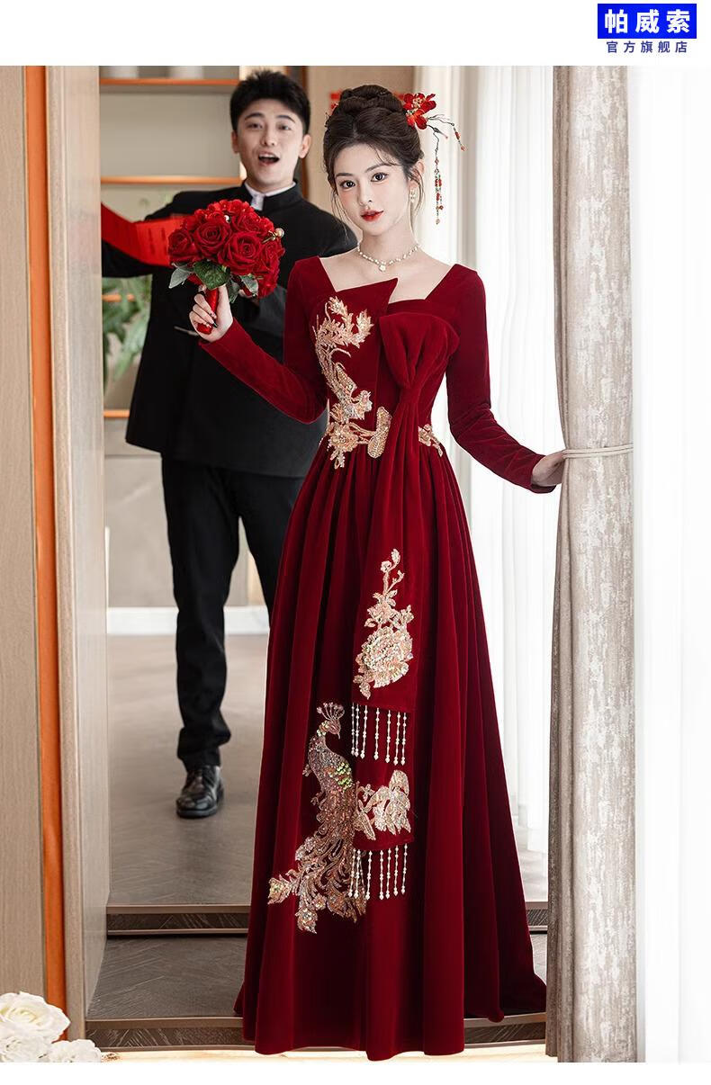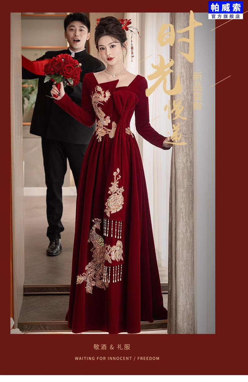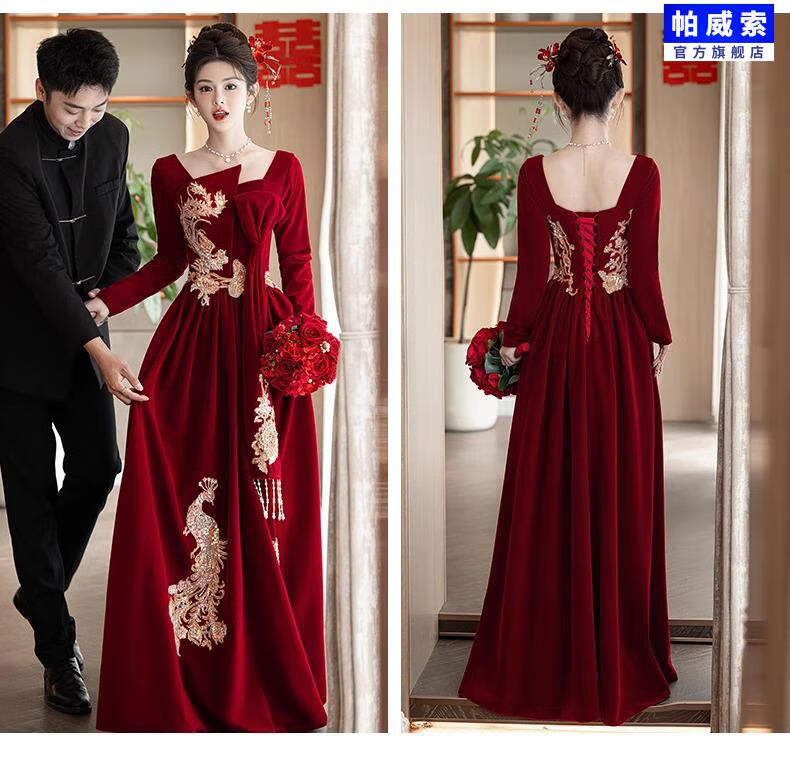 Paviso Toast Wear Bridal Autumn and Winter Red Wedding Casual Return Engagement Dress New Chinese Style Long Sleeve Temperament TX2442 Burgundy Velvet Style Pierre Cardin L (170)