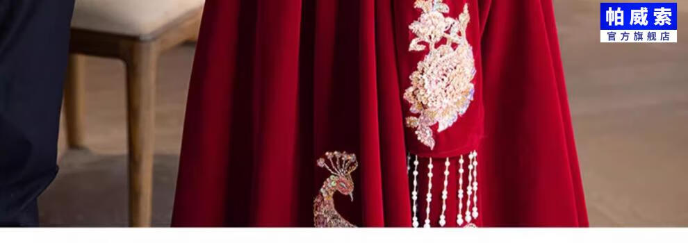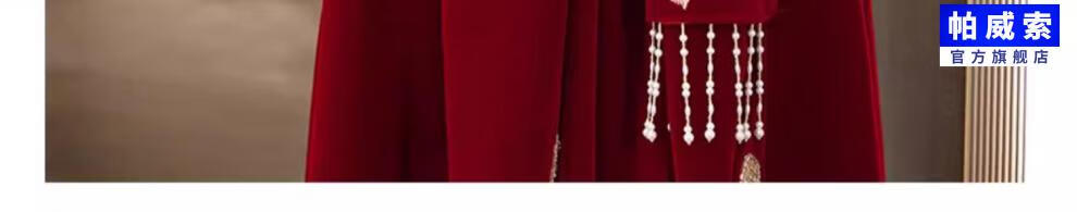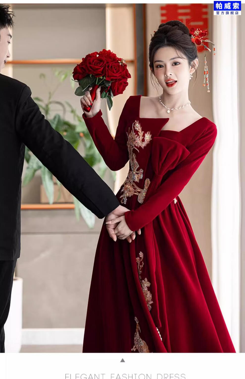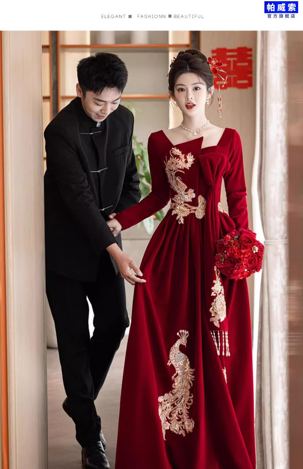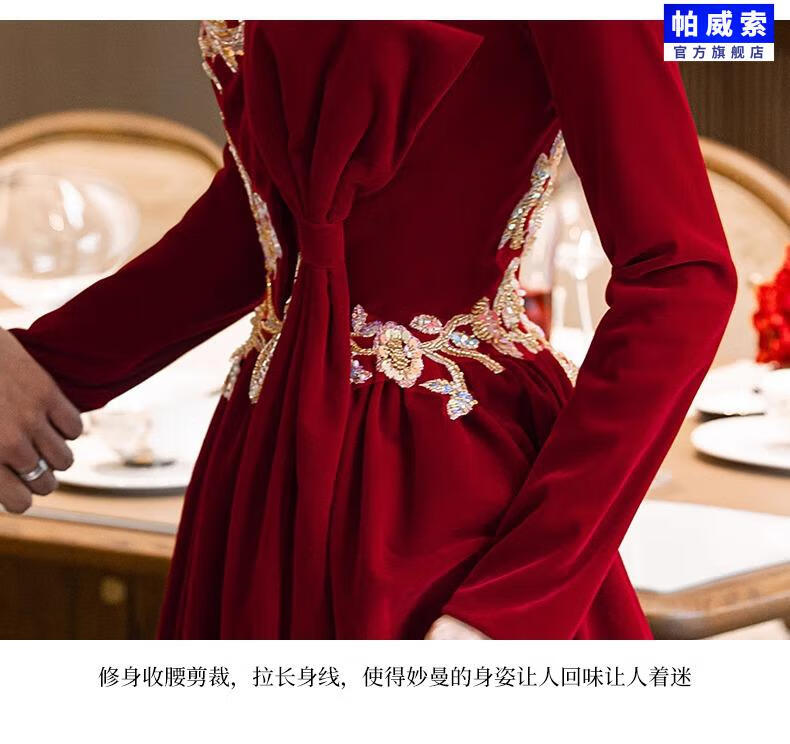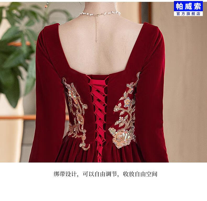 Paviso Toast Wear Bridal Autumn and Winter Red Wedding Casual Return Engagement Dress New Chinese Style Long Sleeve Temperament TX2442 Burgundy Velvet Style Pierre Cardin L (170)