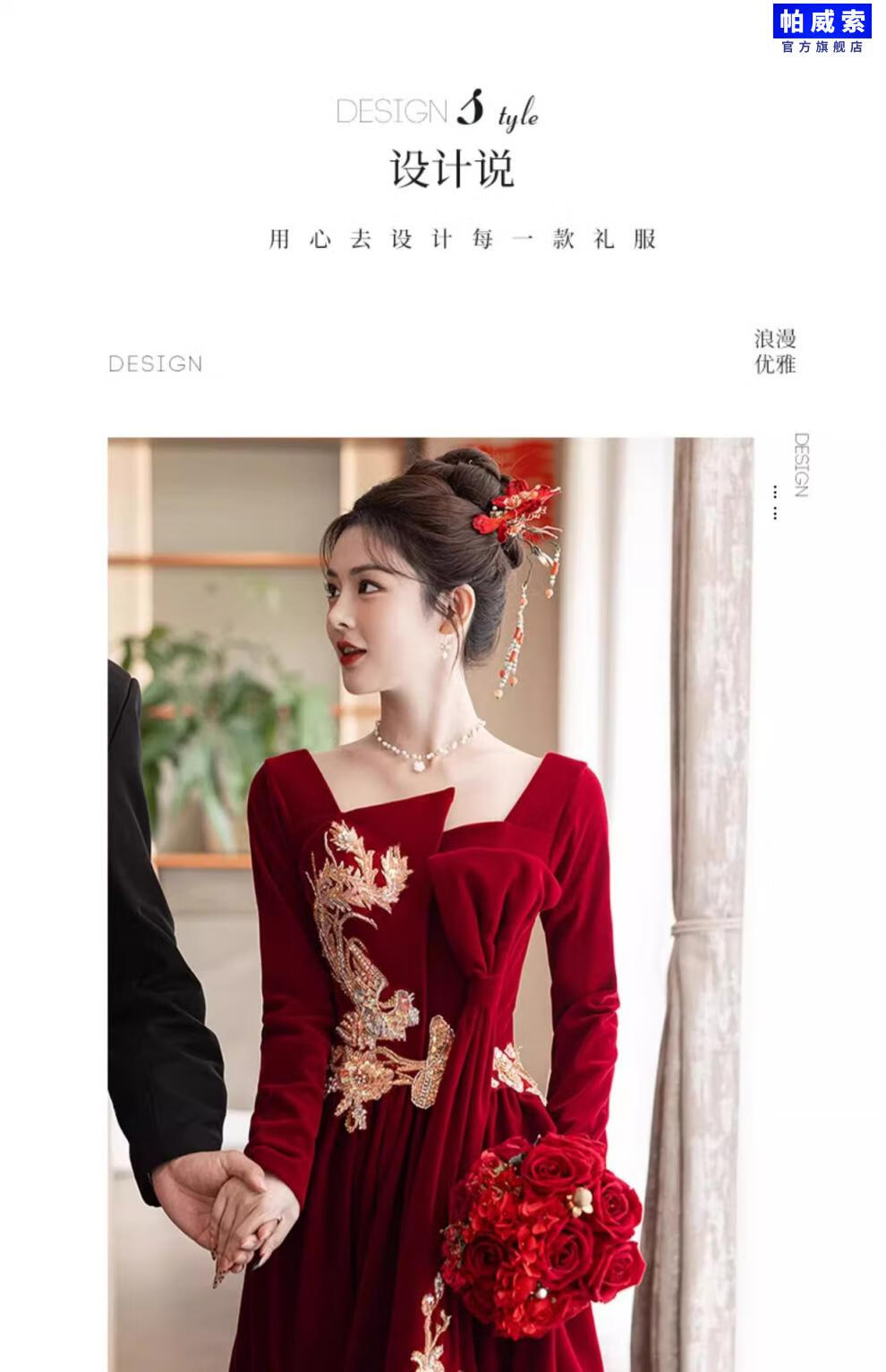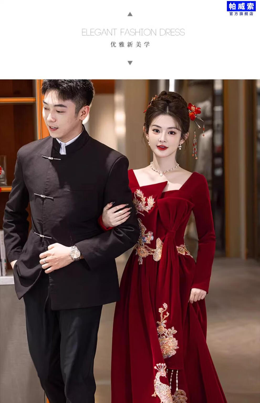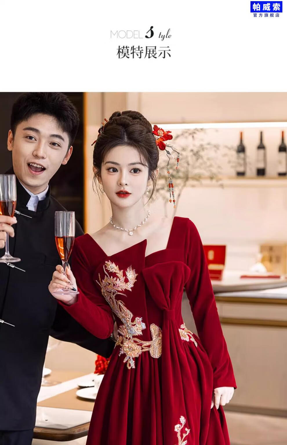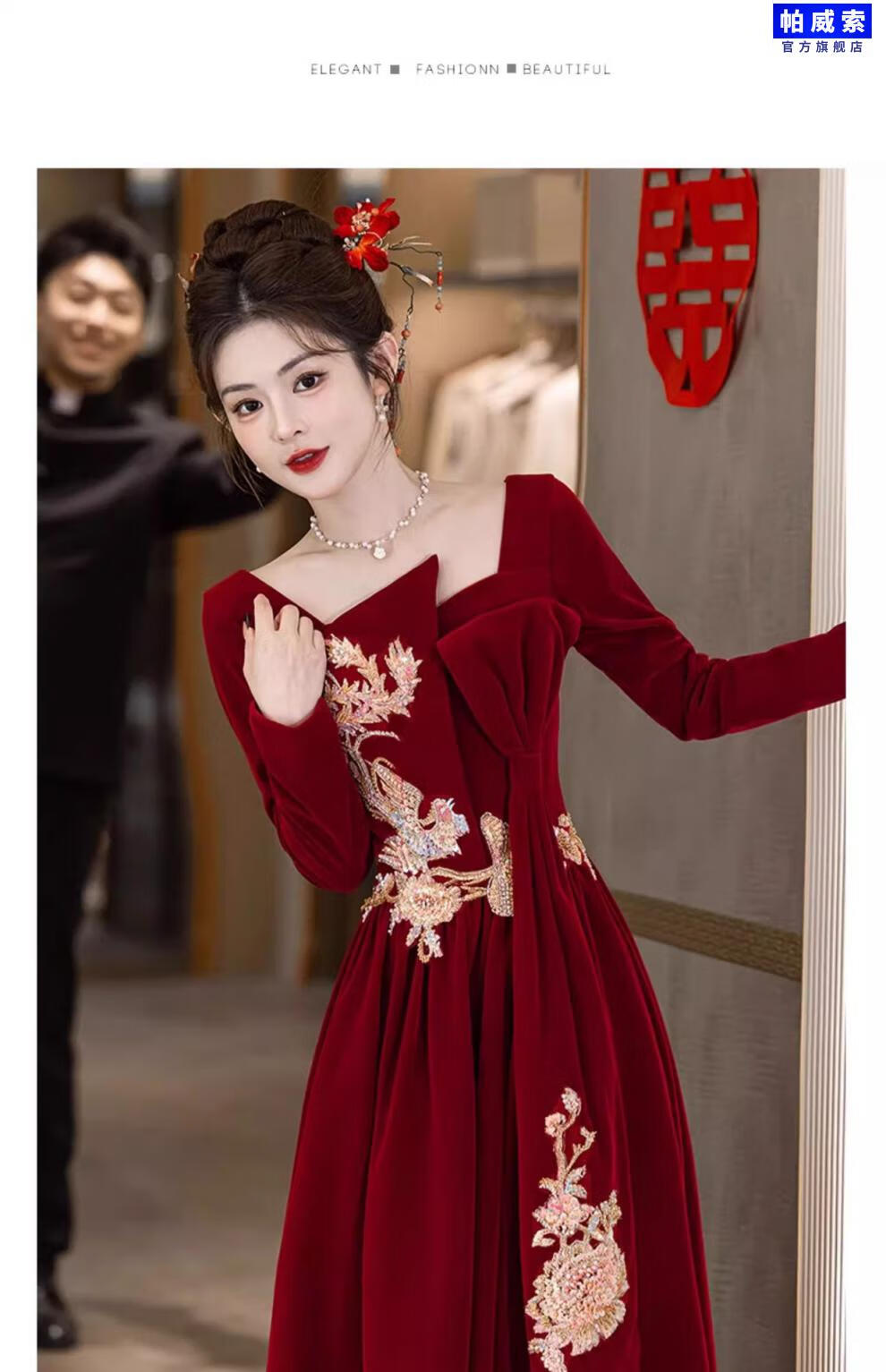 Paviso Toast Wear Bridal Autumn and Winter Red Wedding Casual Return Engagement Dress New Chinese Style Long Sleeve Temperament TX2442 Burgundy Velvet Style Pierre Cardin L (170)