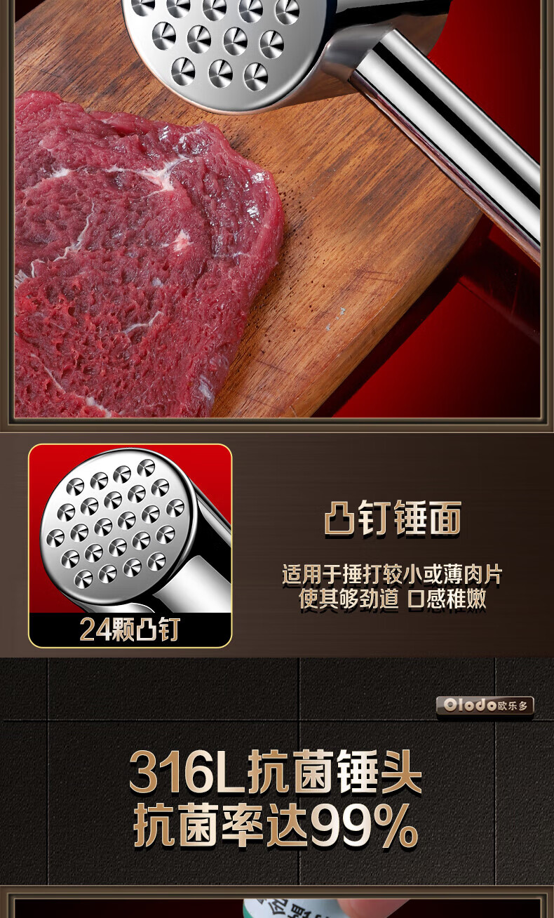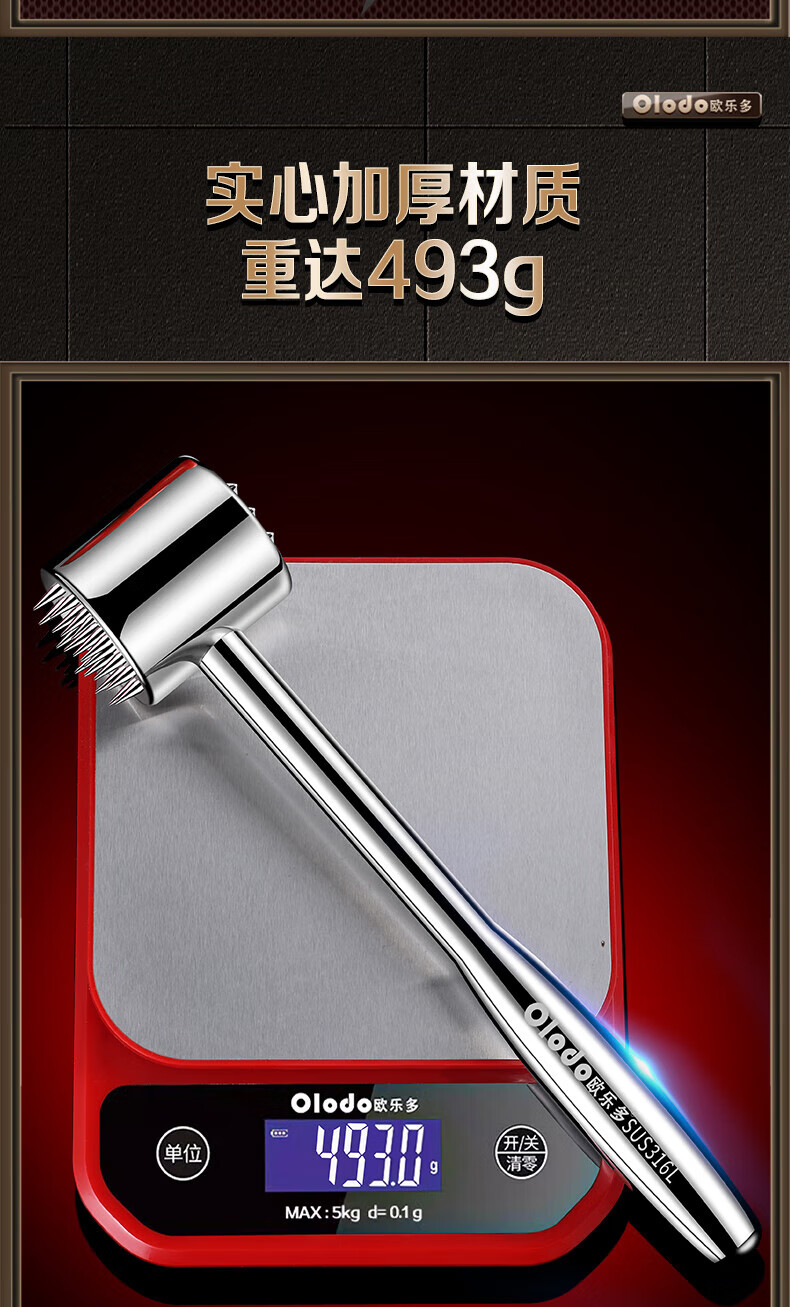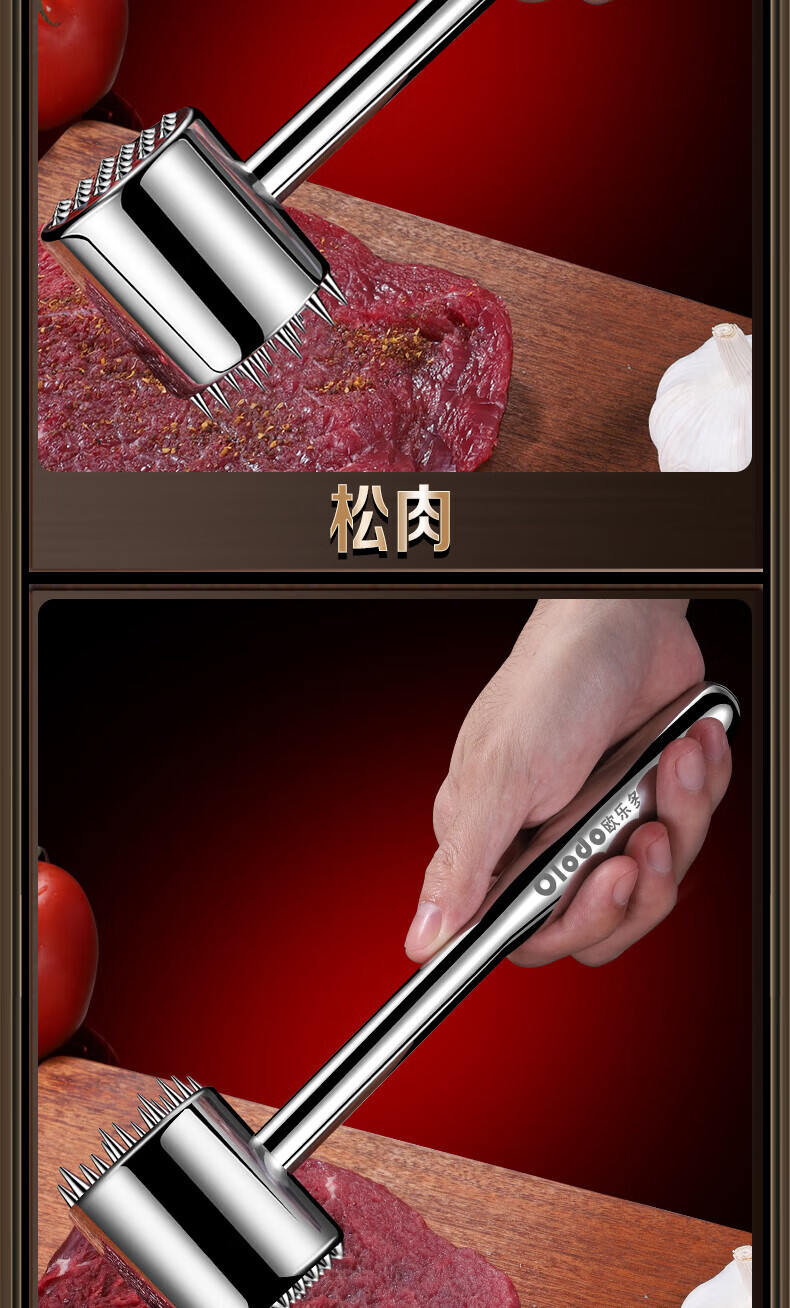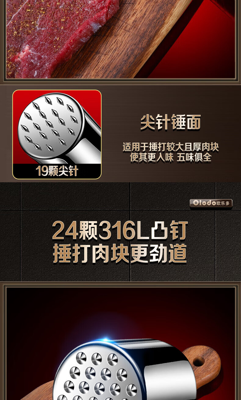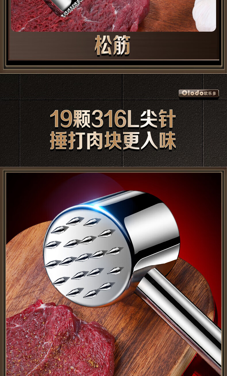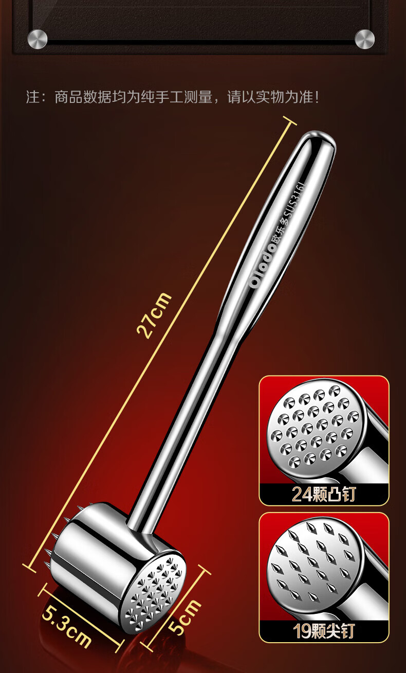 欧乐多(Olodo)316不锈钢肉锤牛排锤松肉锤松肉针双面肉锤加厚优质锤肉器敲肉锤 抗菌316L【19颗尖钉+24颗凸钉】