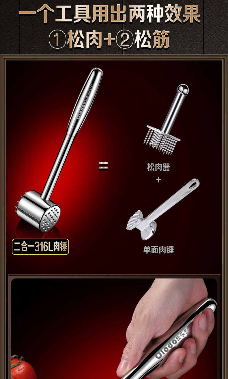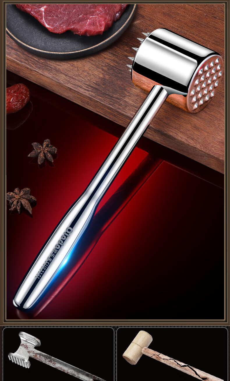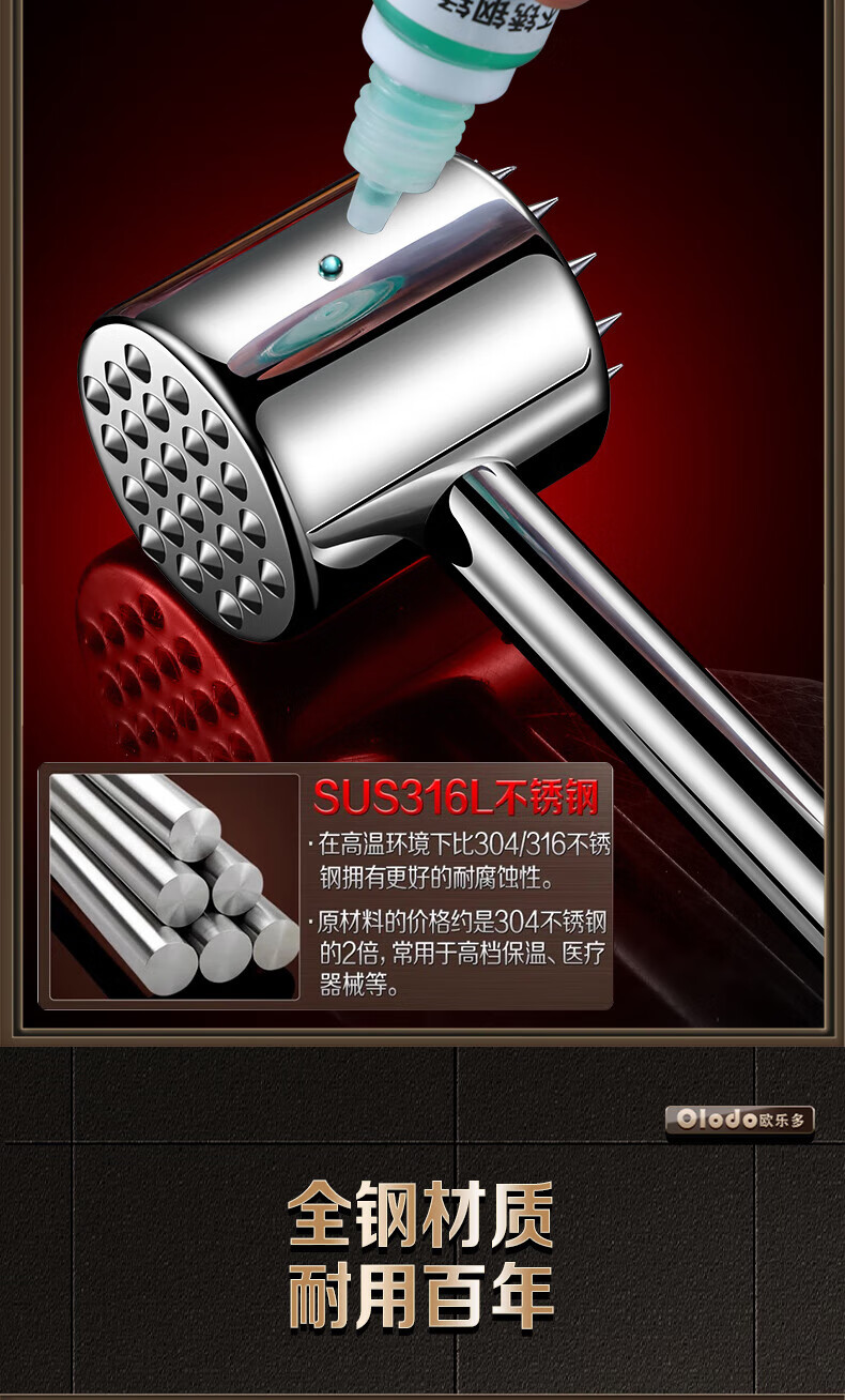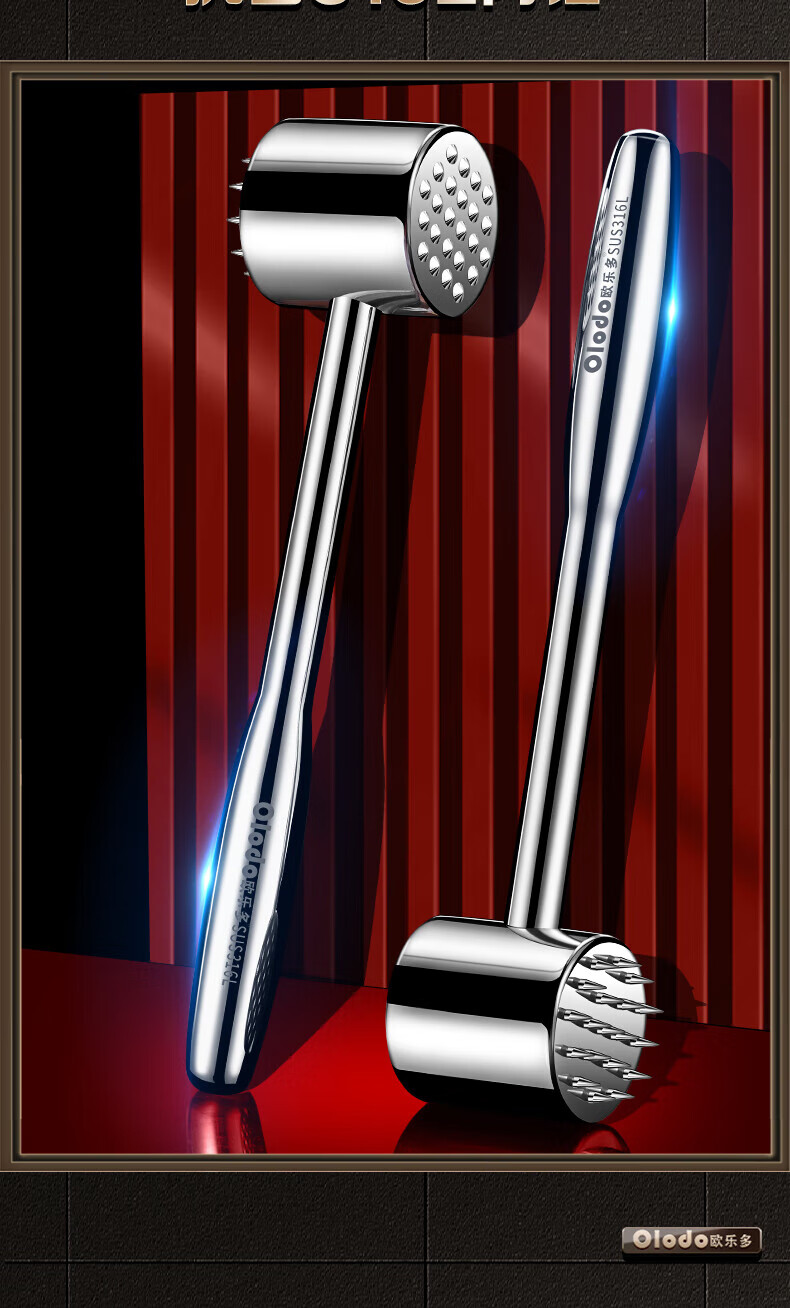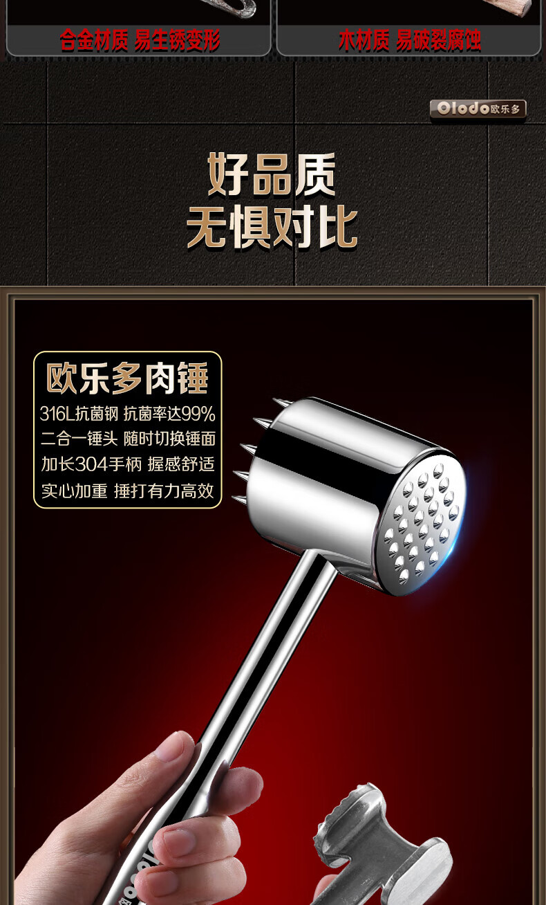 欧乐多(Olodo)316不锈钢肉锤牛排锤松肉锤松肉针双面肉锤加厚优质锤肉器敲肉锤 抗菌316L【19颗尖钉+24颗凸钉】