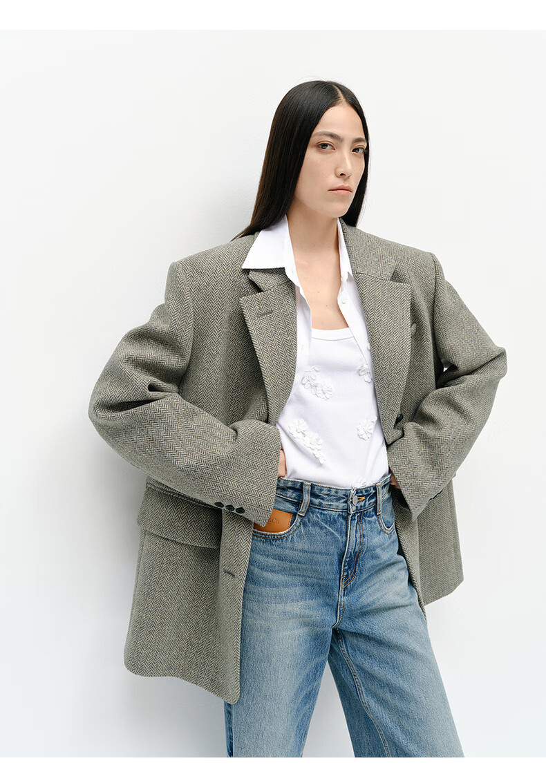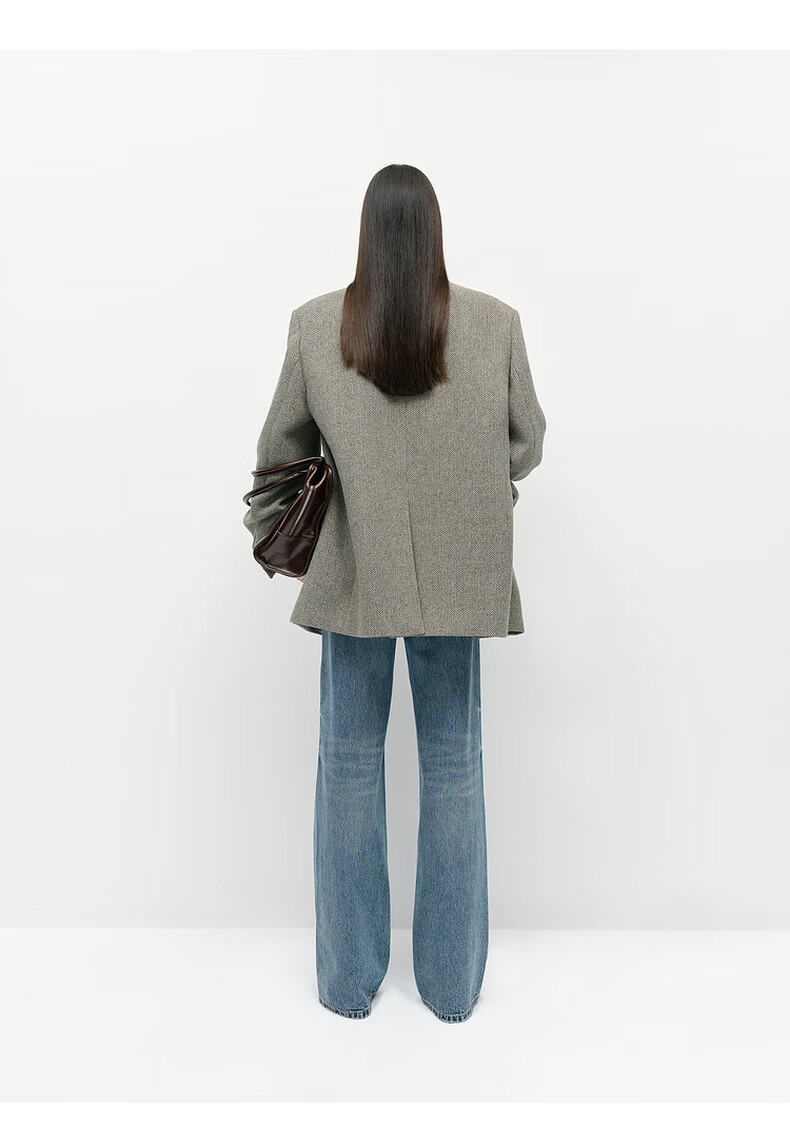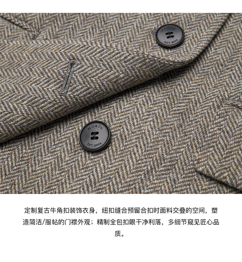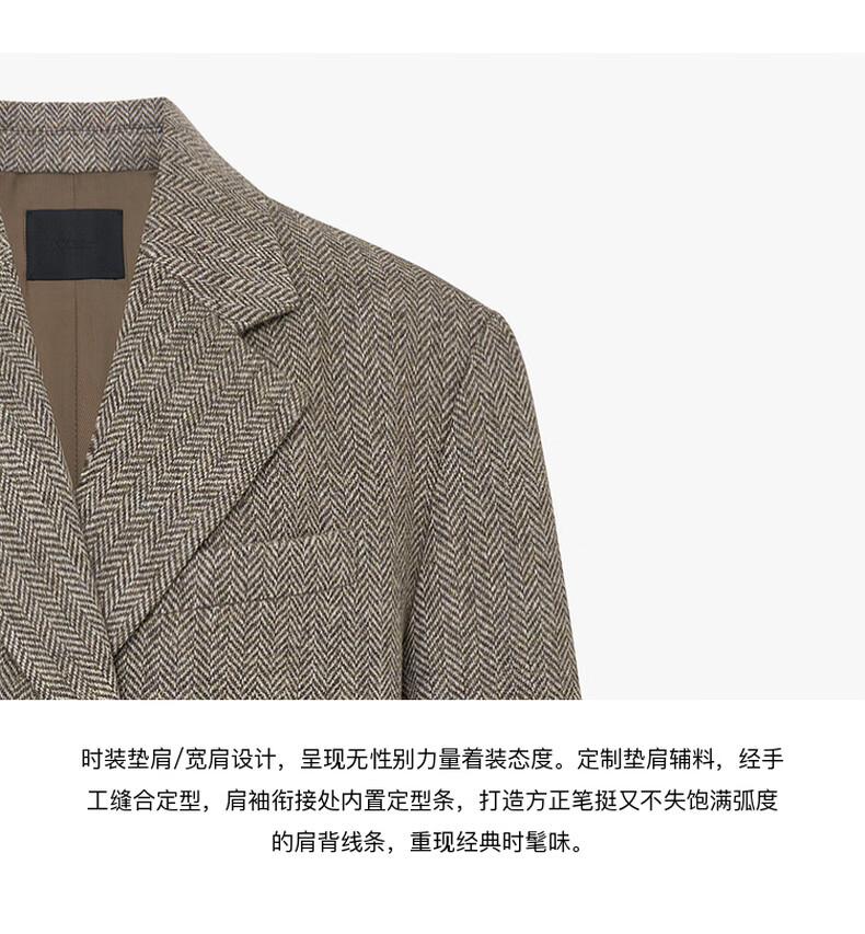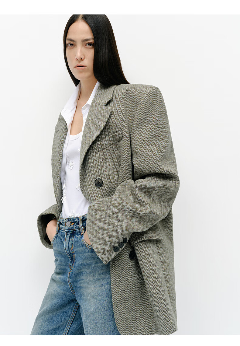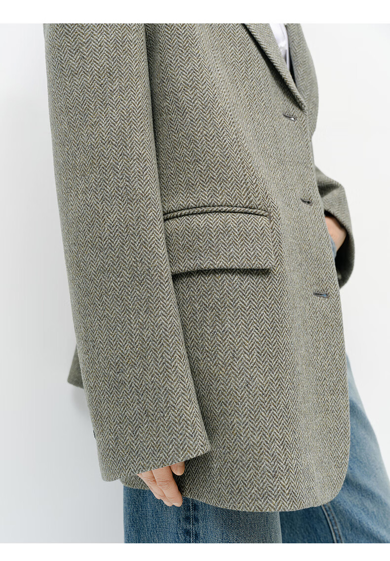 MO&Co. Suit Spring Retro Brown Green Herringbone Sheep Wool Padded Broad Shoulder Jacket MBE1BLA005 Green Mixed Color S