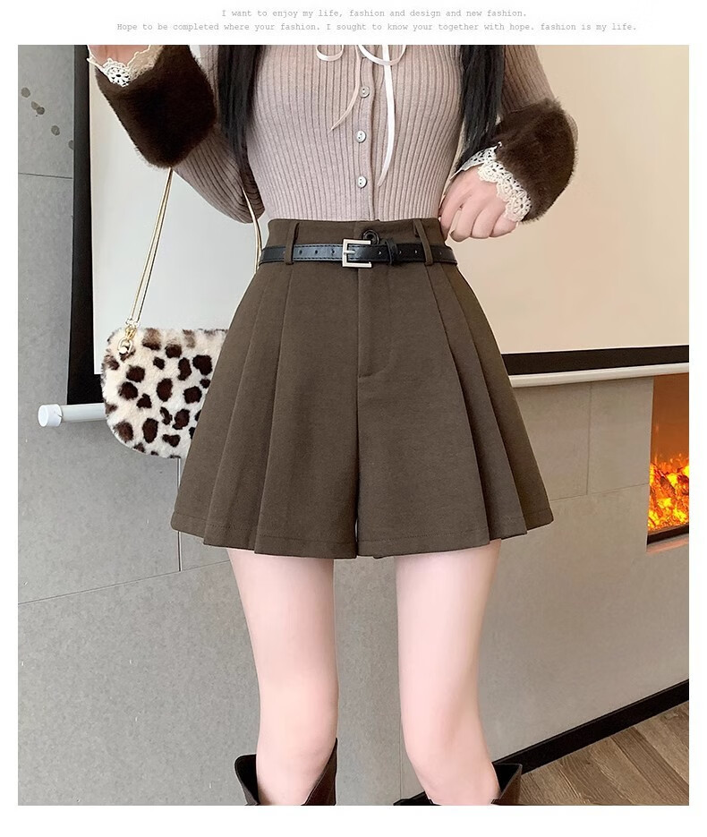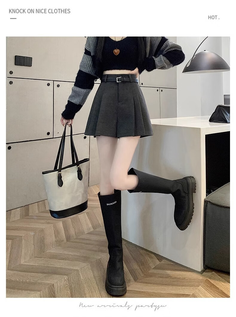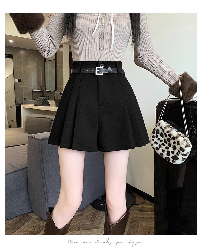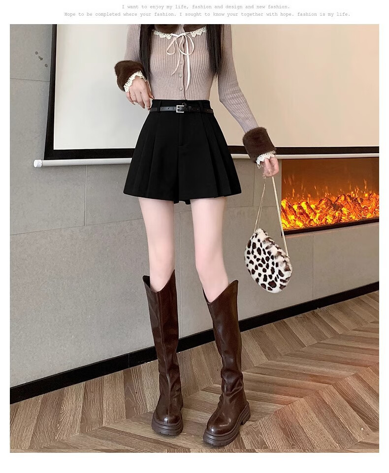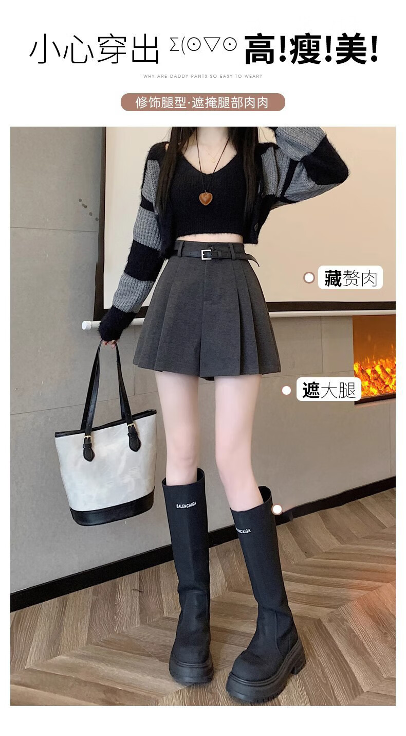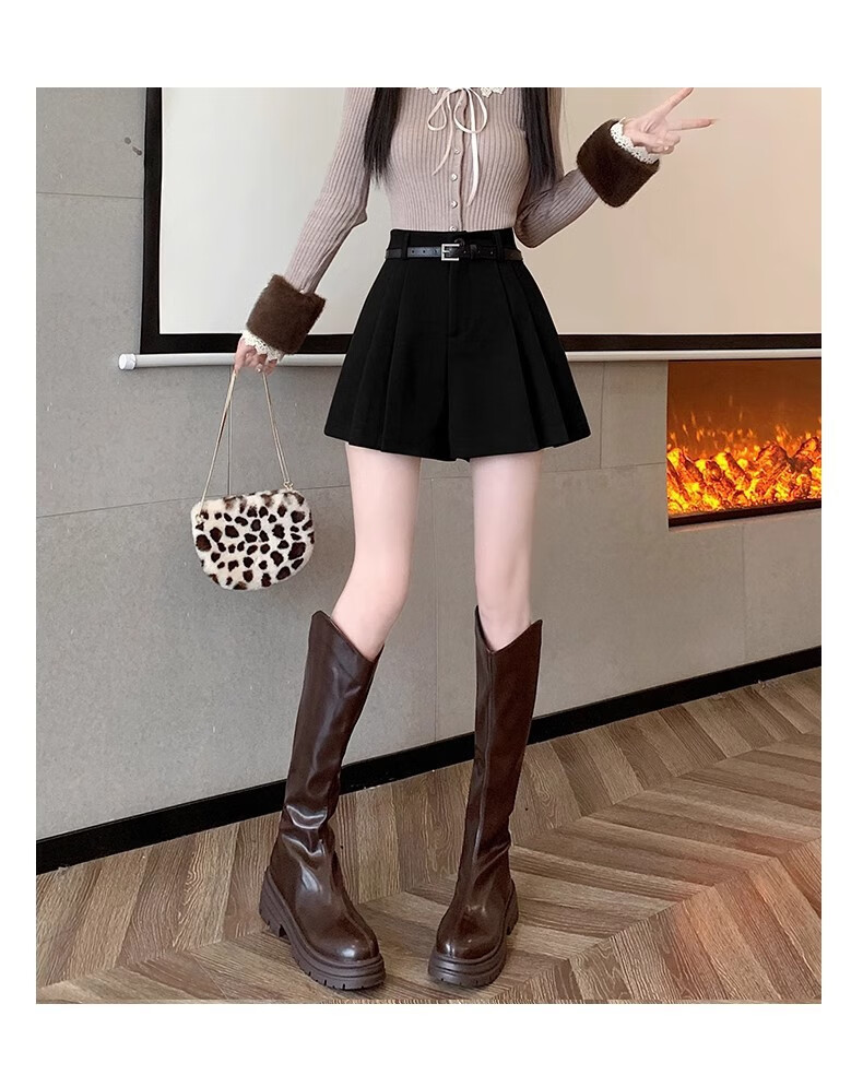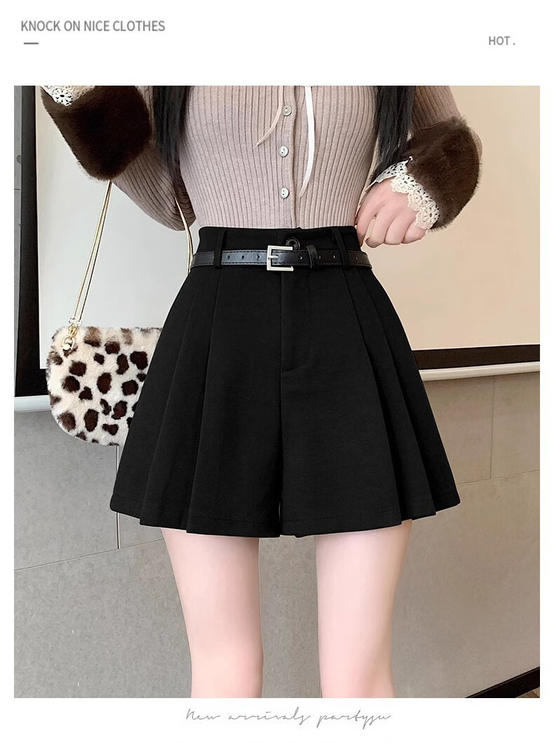 Hao'e black pleated woolen shorts for women in spring and autumn, versatile boot pants, high waisted, a-line, wide-leg casual pants, slimming, black without belt, L recommended 110-120 Jin Jin equals 0.5 kg