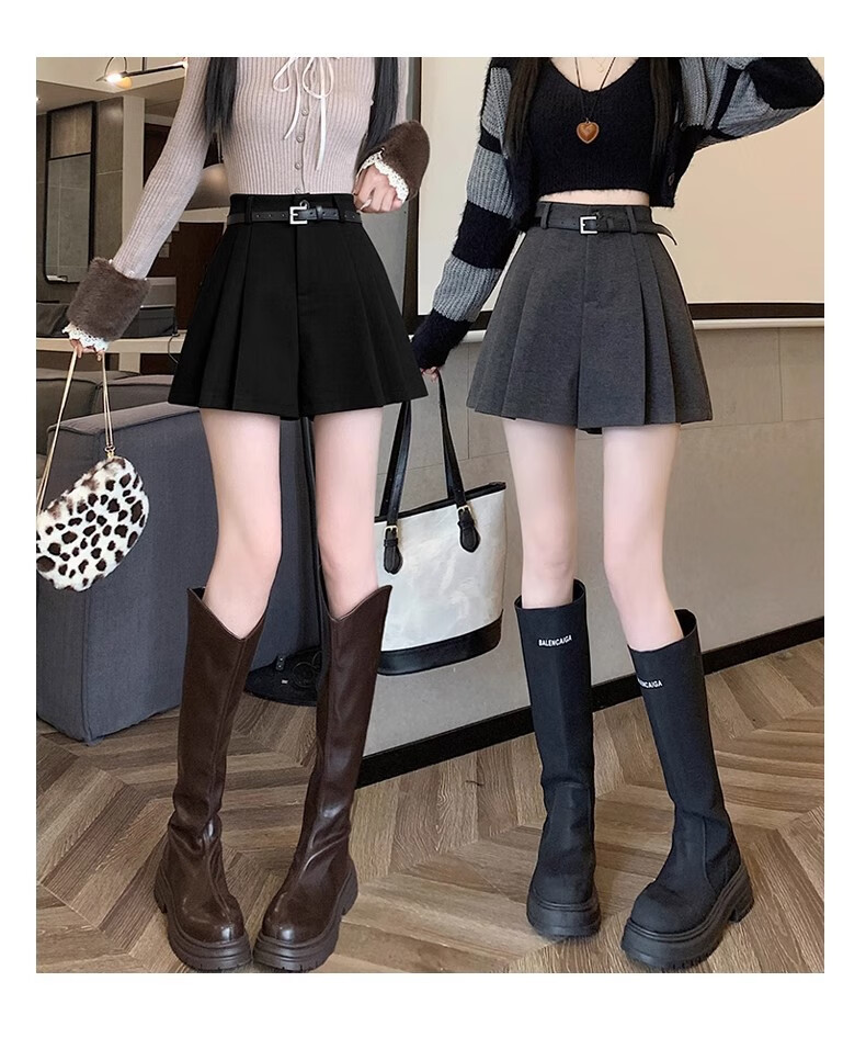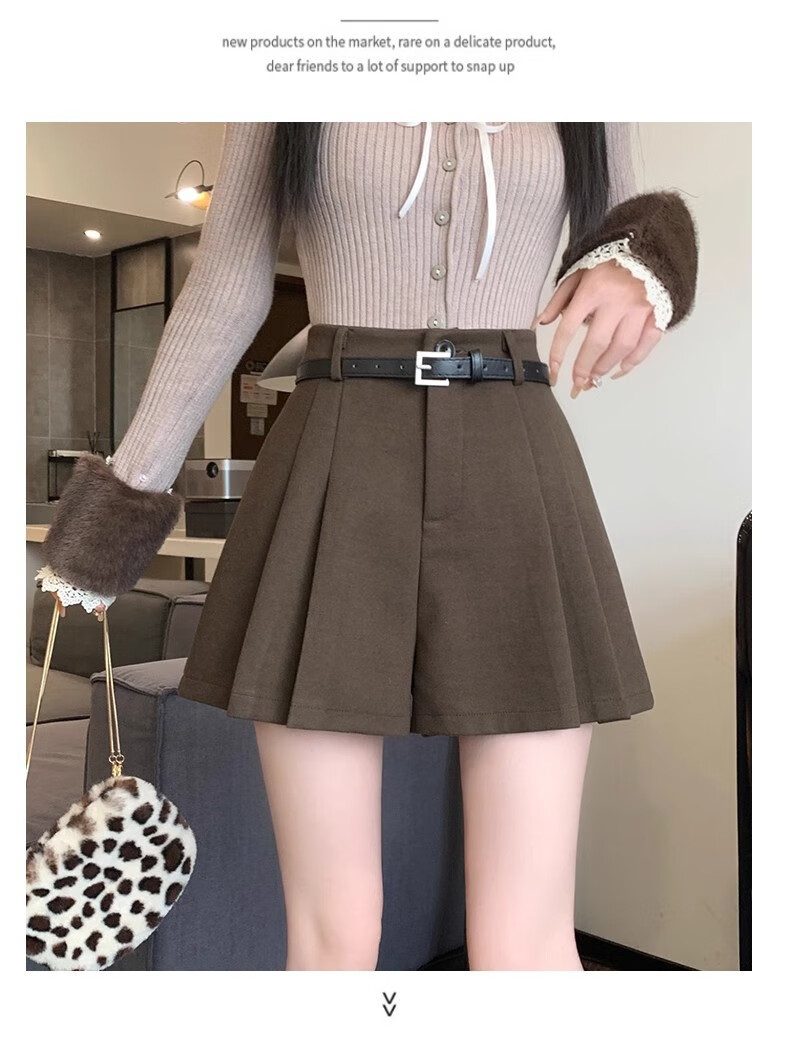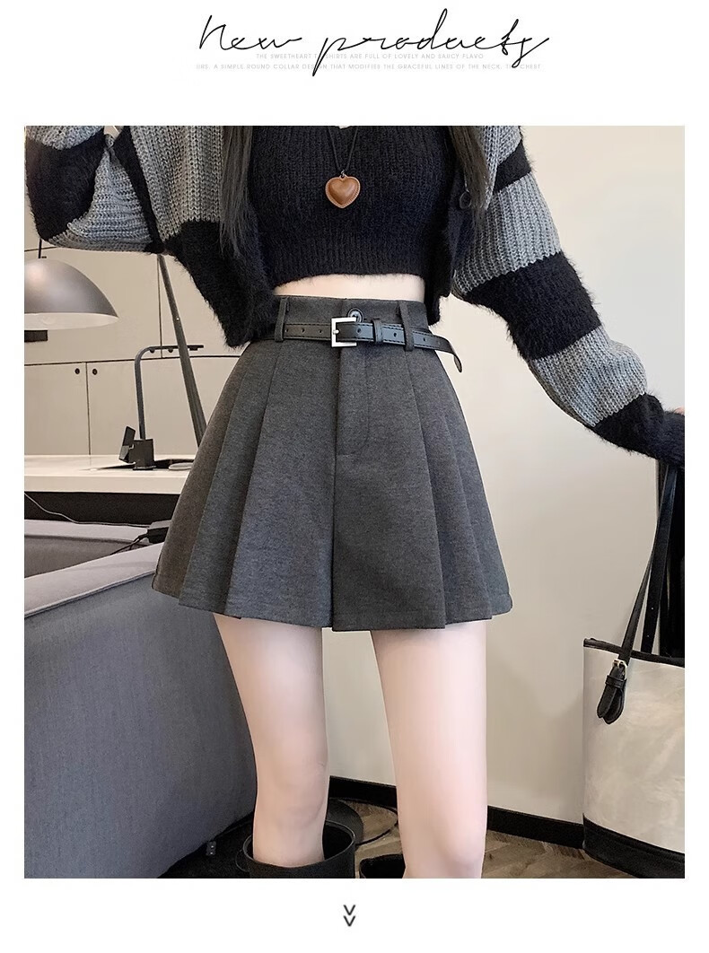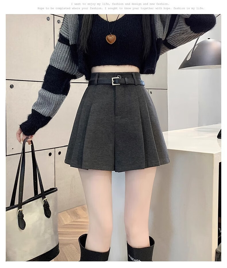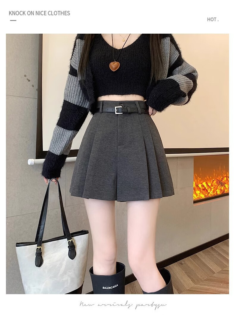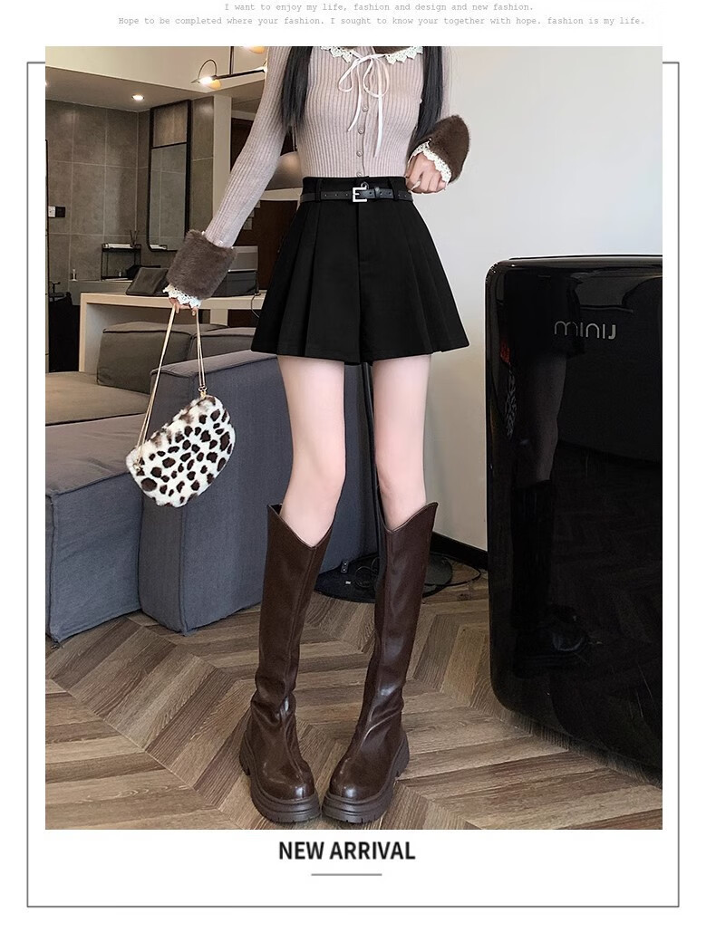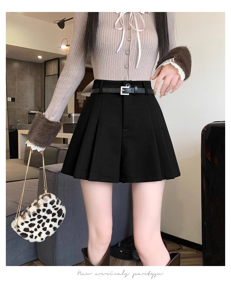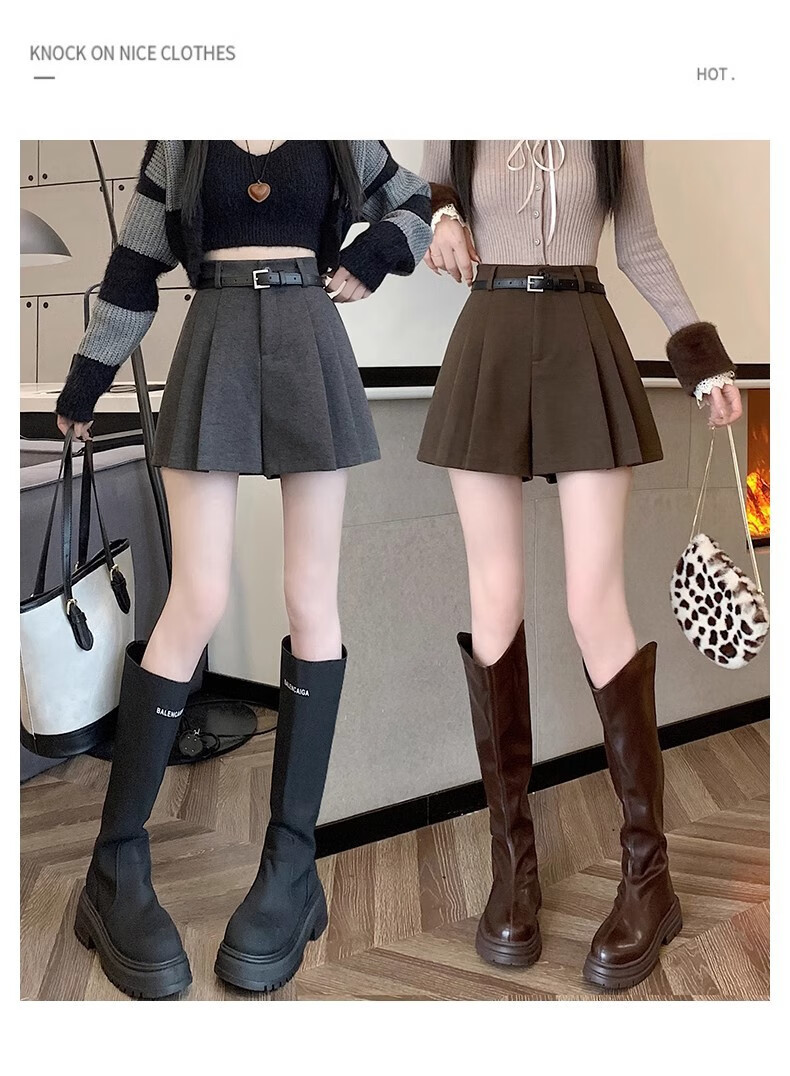 Hao'e black pleated woolen shorts for women in spring and autumn, versatile boot pants, high waisted, a-line, wide-leg casual pants, slimming, black without belt, L recommended 110-120 Jin Jin equals 0.5 kg