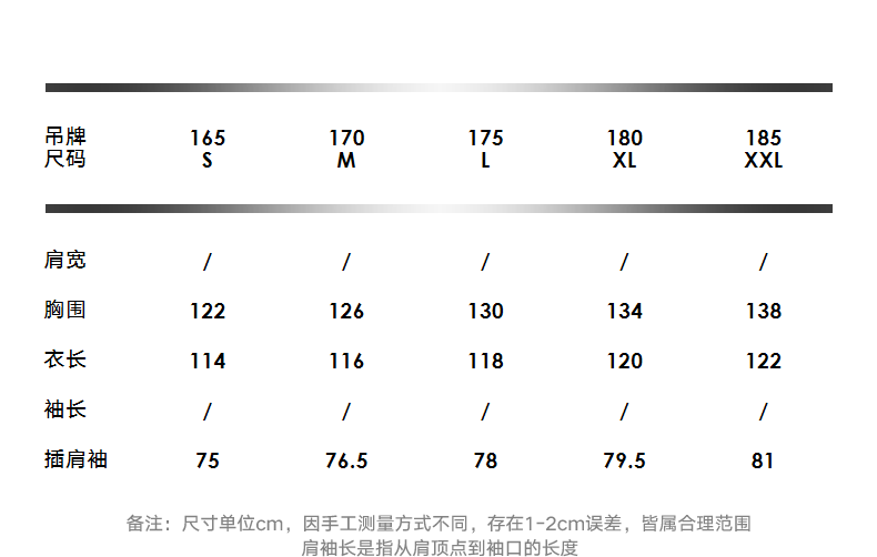 China (cm) 165 / 88-90 170 / 96-98 175 / 108-110 180 / 118-122 185 / 126-130
