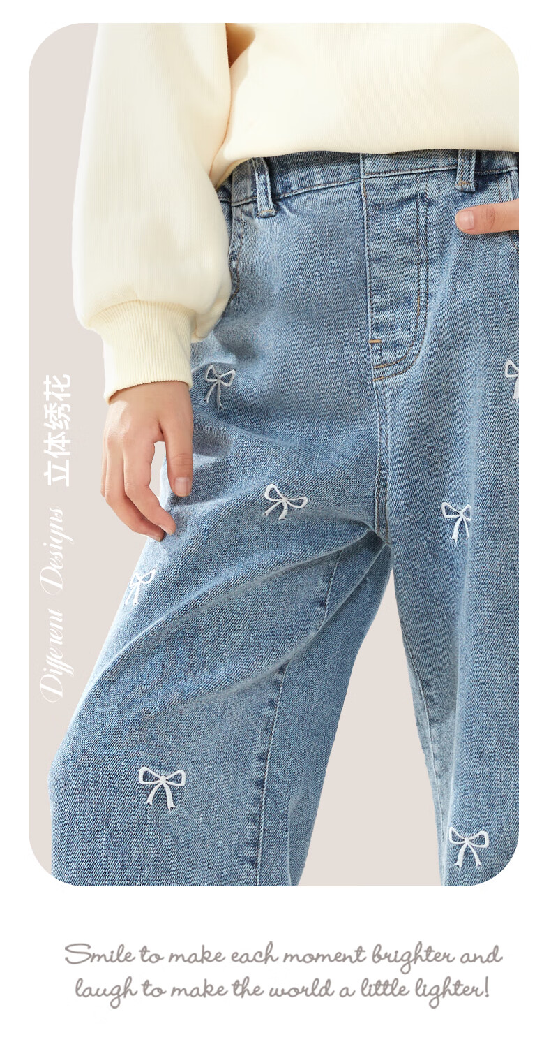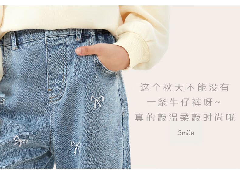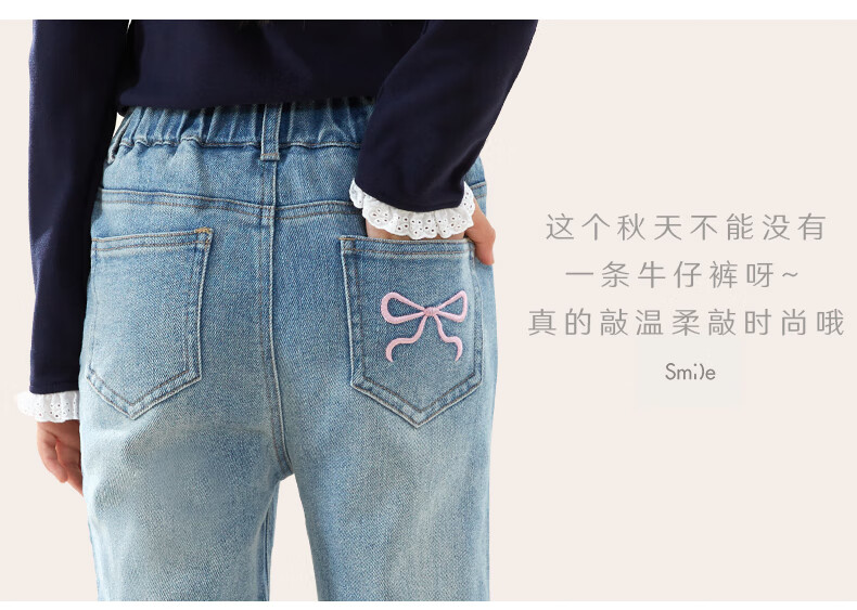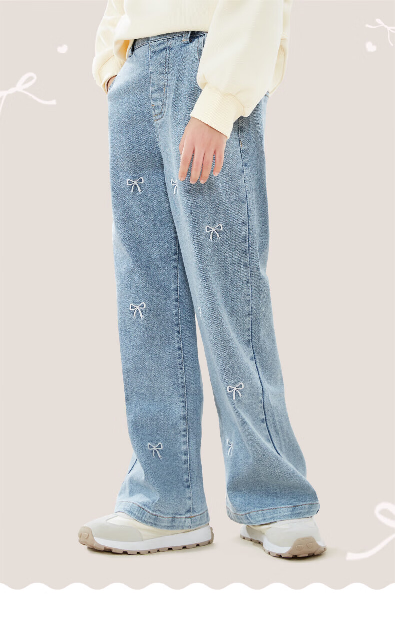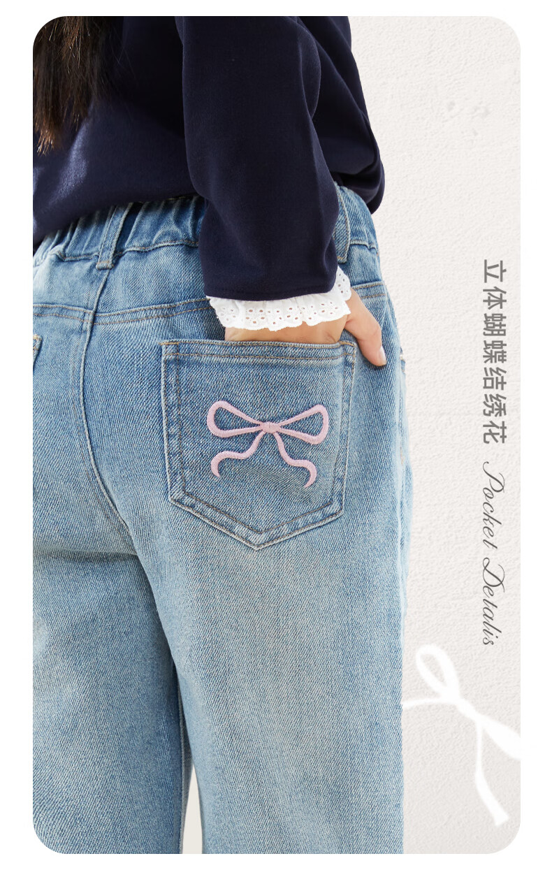 Domeowu Girls' Denim Flared Pants 25 New Autumn and Winter Children's Pants Medium and Big Children's Stretch Pants Bow Mid Blue 150