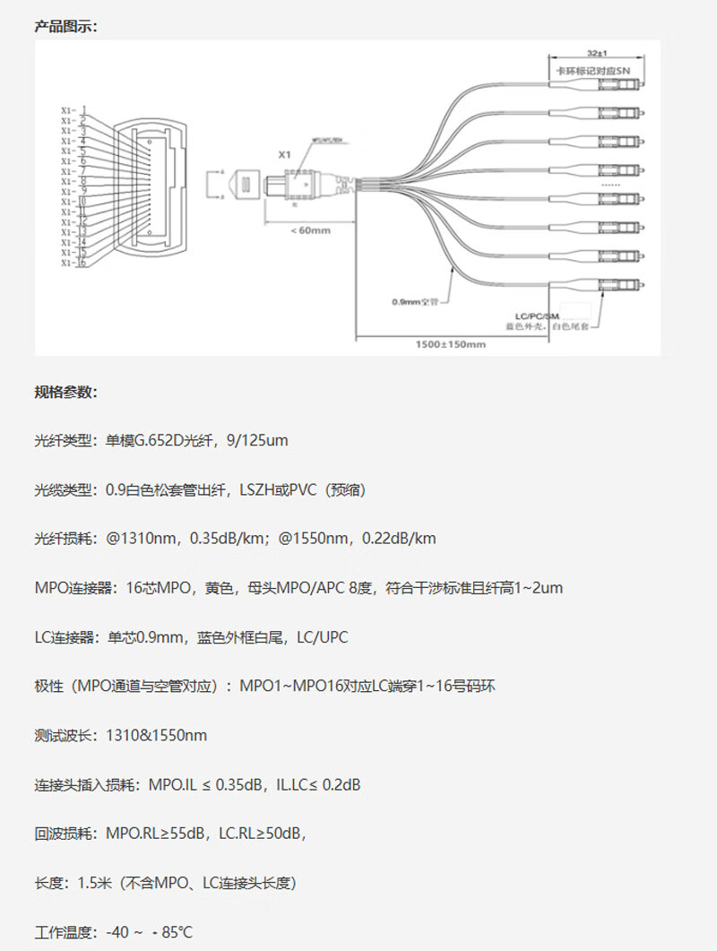 VCHUNG 1315-1.5m MPO16APC16xLC-UPC-G.652D fiber optic 21522LFA