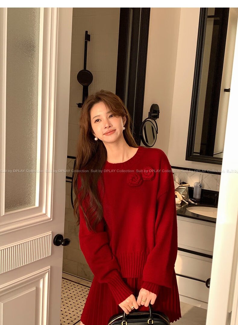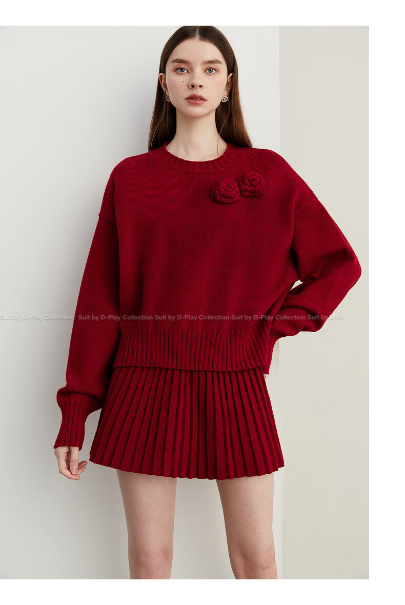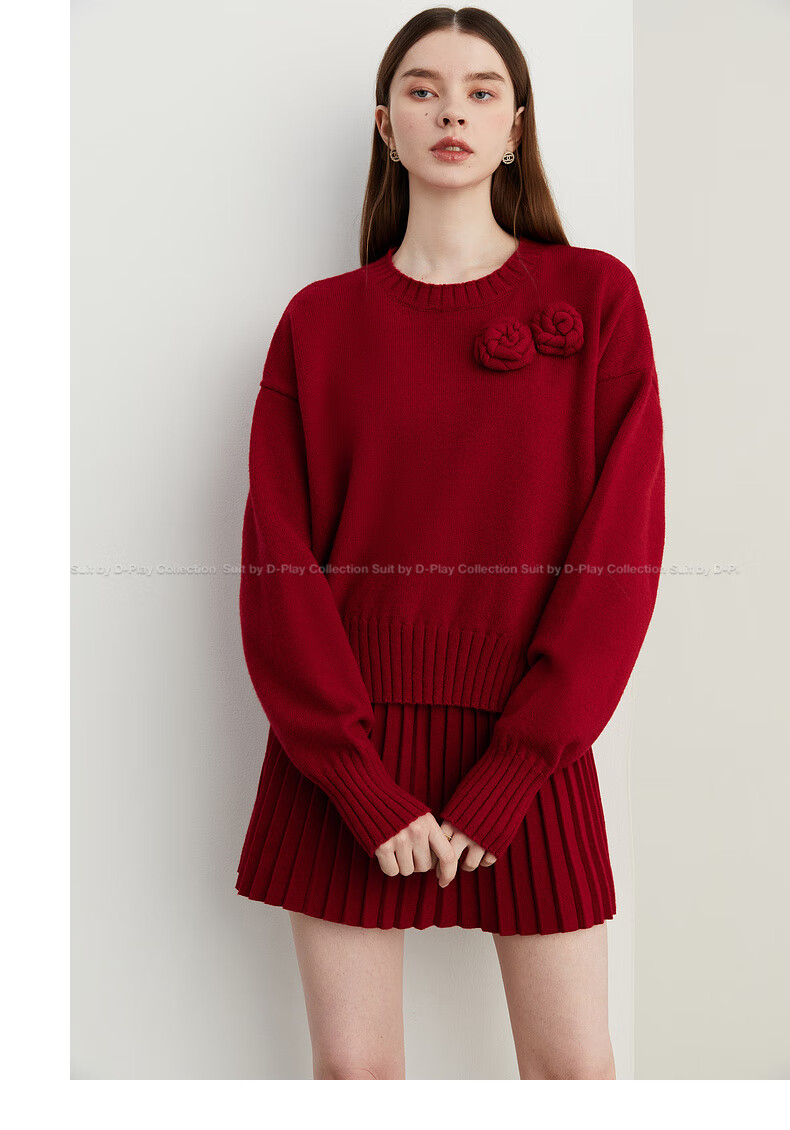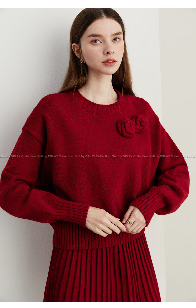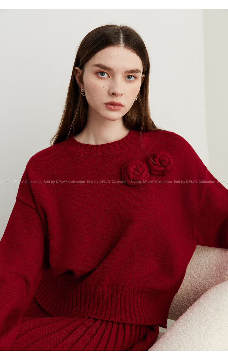 DPLAY2025 Autumn New Casual Red Round Neck Flower Design Sweater Knit Top Long Sleeve Women Ankora Red-Top XL