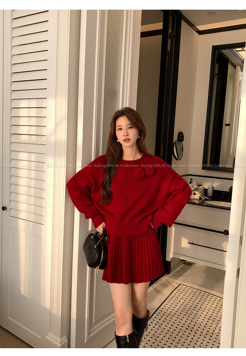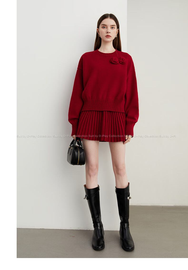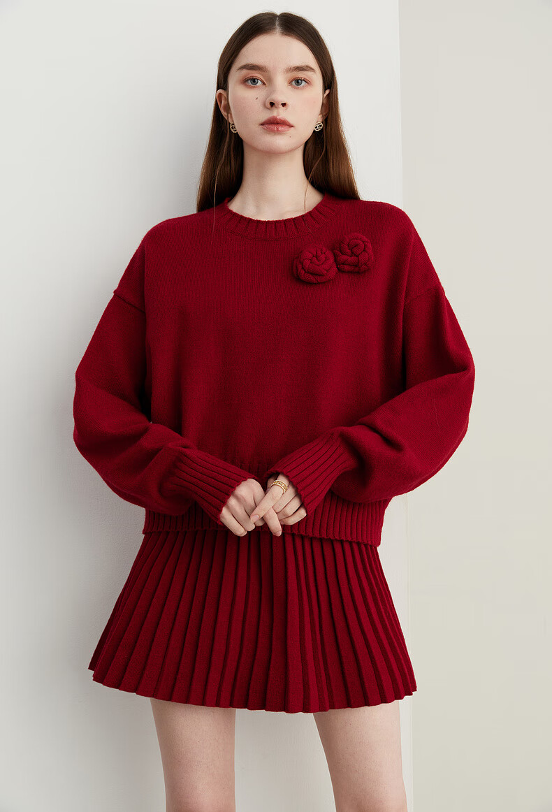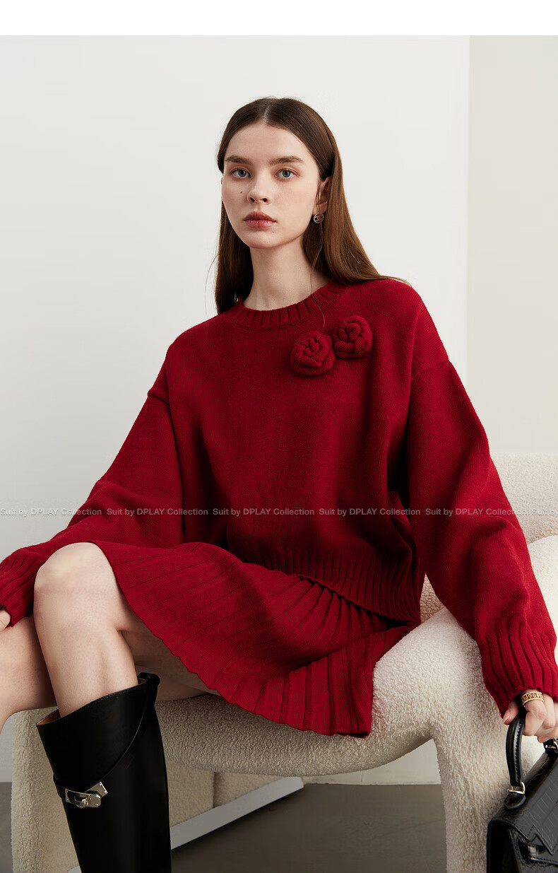 DPLAY2025 Autumn New Casual Red Round Neck Flower Design Sweater Knit Top Long Sleeve Women Ankora Red-Top XL