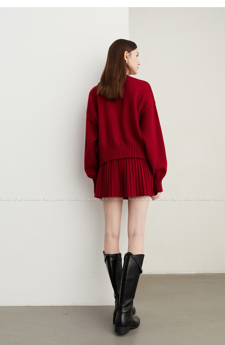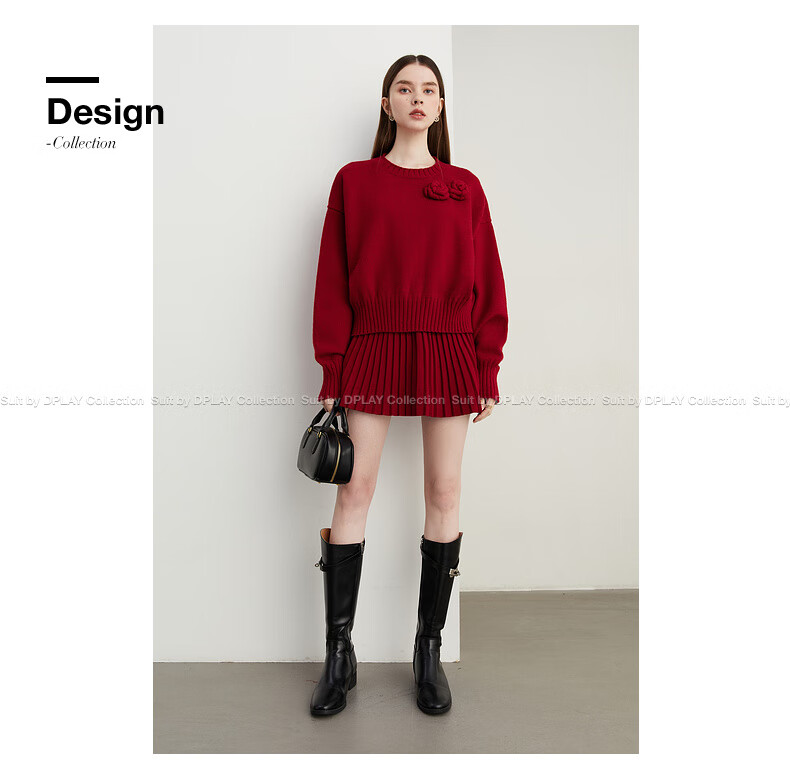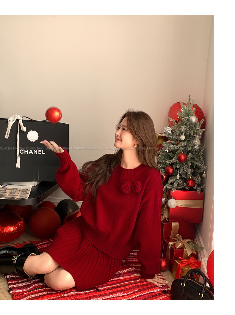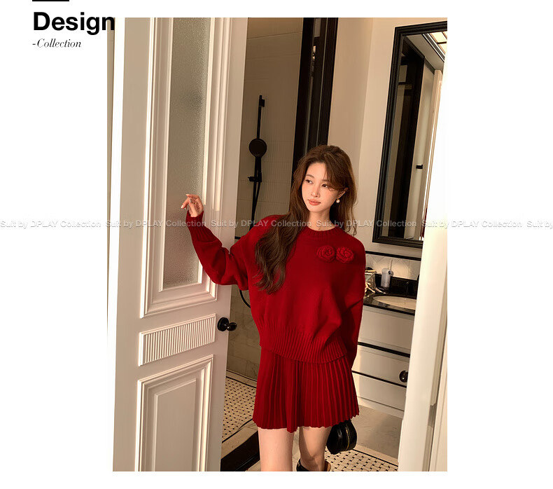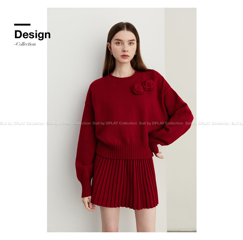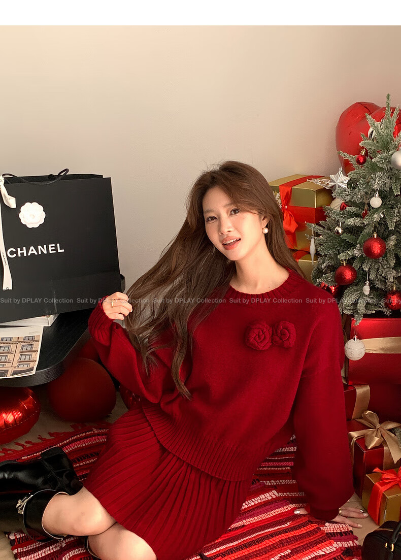 DPLAY2025 Autumn New Casual Red Round Neck Flower Design Sweater Knit Top Long Sleeve Women Ankora Red-Top XL