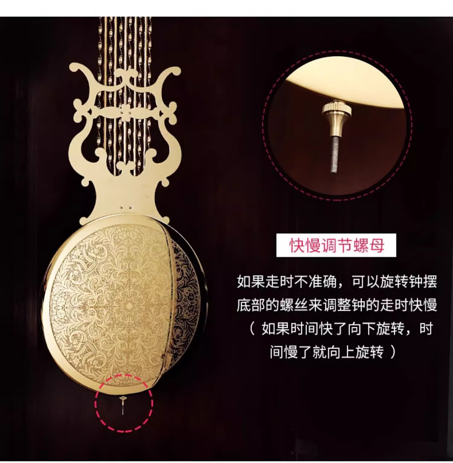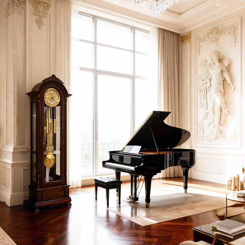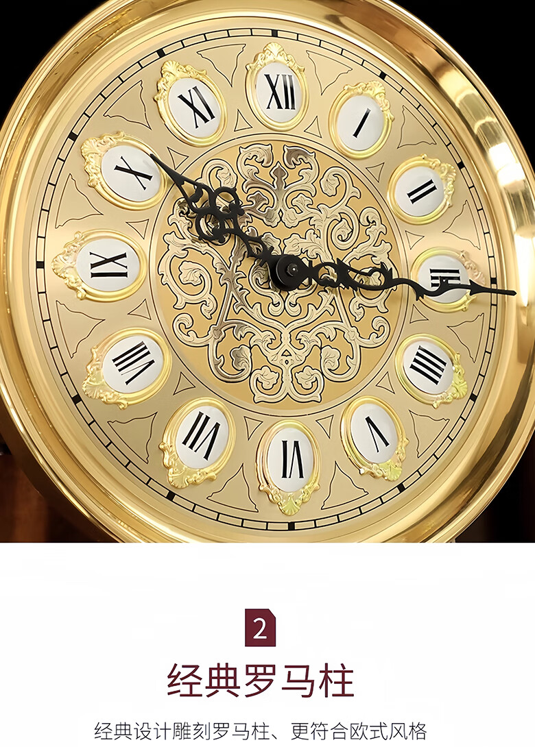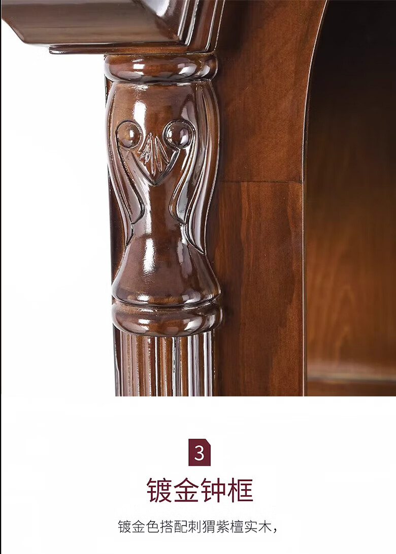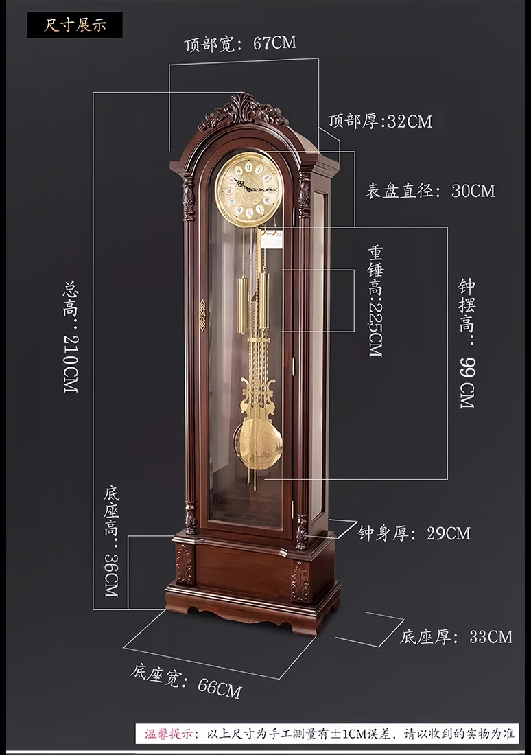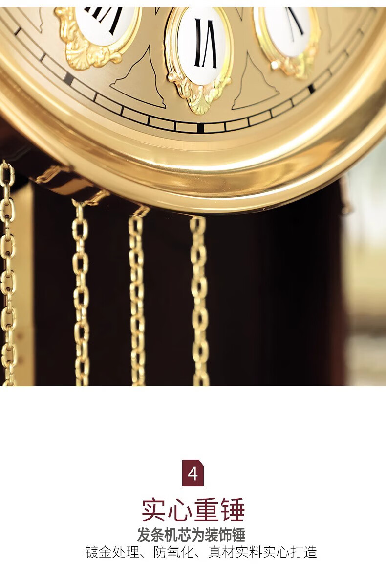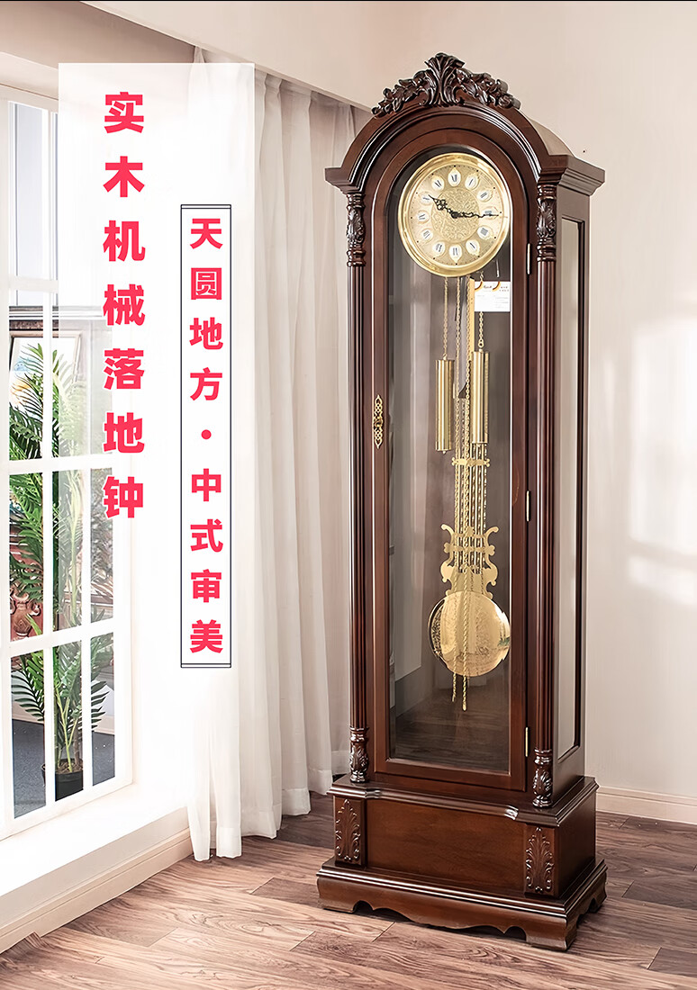 Honghe Tianyuan place solid wood floor clock with official hat for villa living room high-end pendulum clock and hall clock with flowers on the bottom. Mahogany color, basswood, pattern on the base. Polaris upgraded movement 40 days, sledgehammer swing more grand.