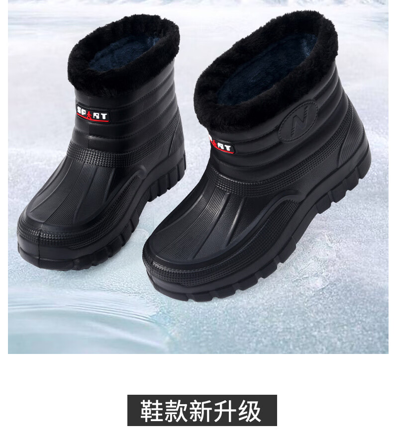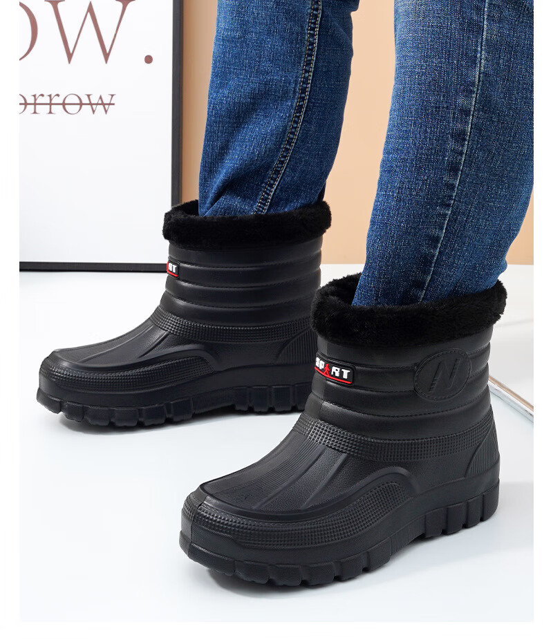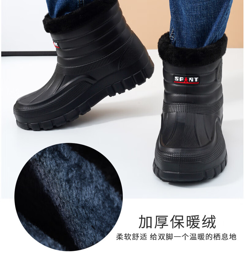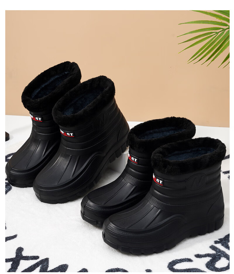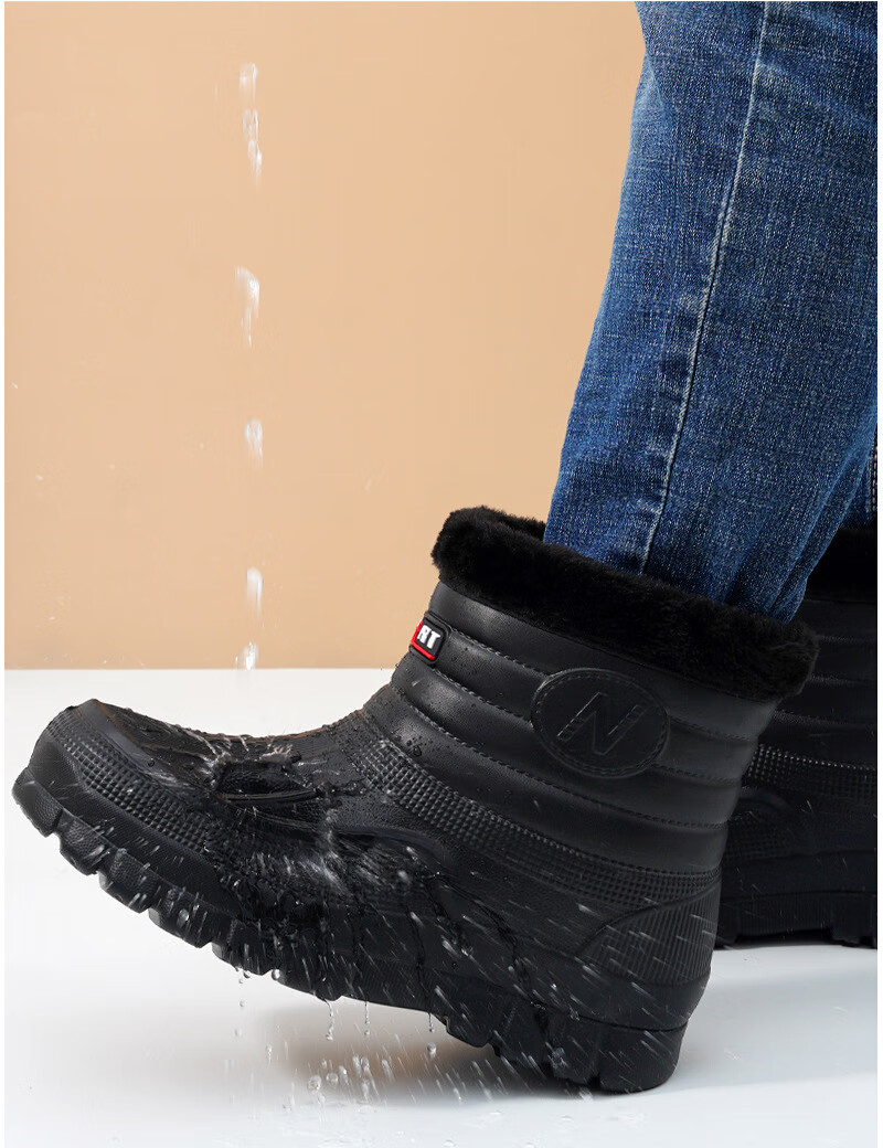 Plush velvet warm outdoor waterproof cotton shoes men's rain boots car wash room construction site labor protection wear-resistant mid-high water shoes snow boots 166 black 41