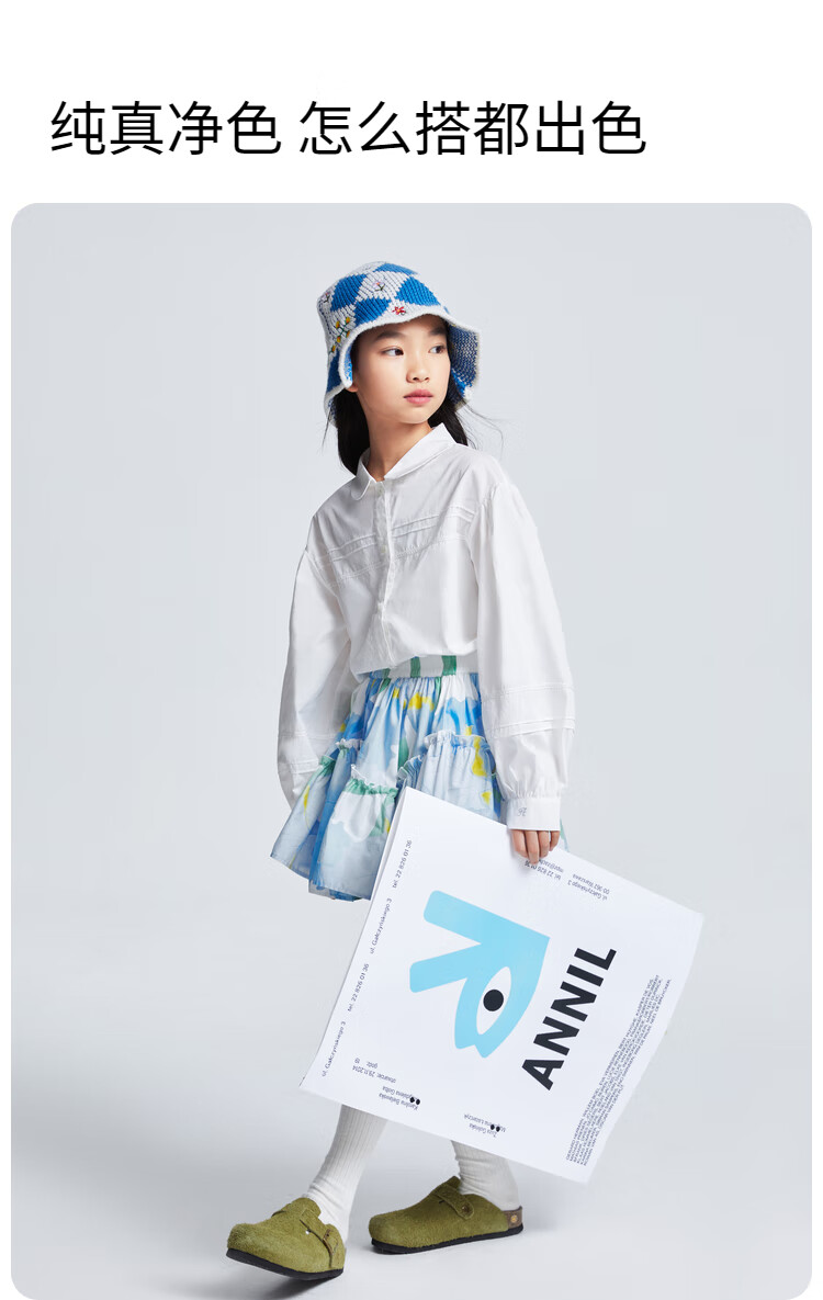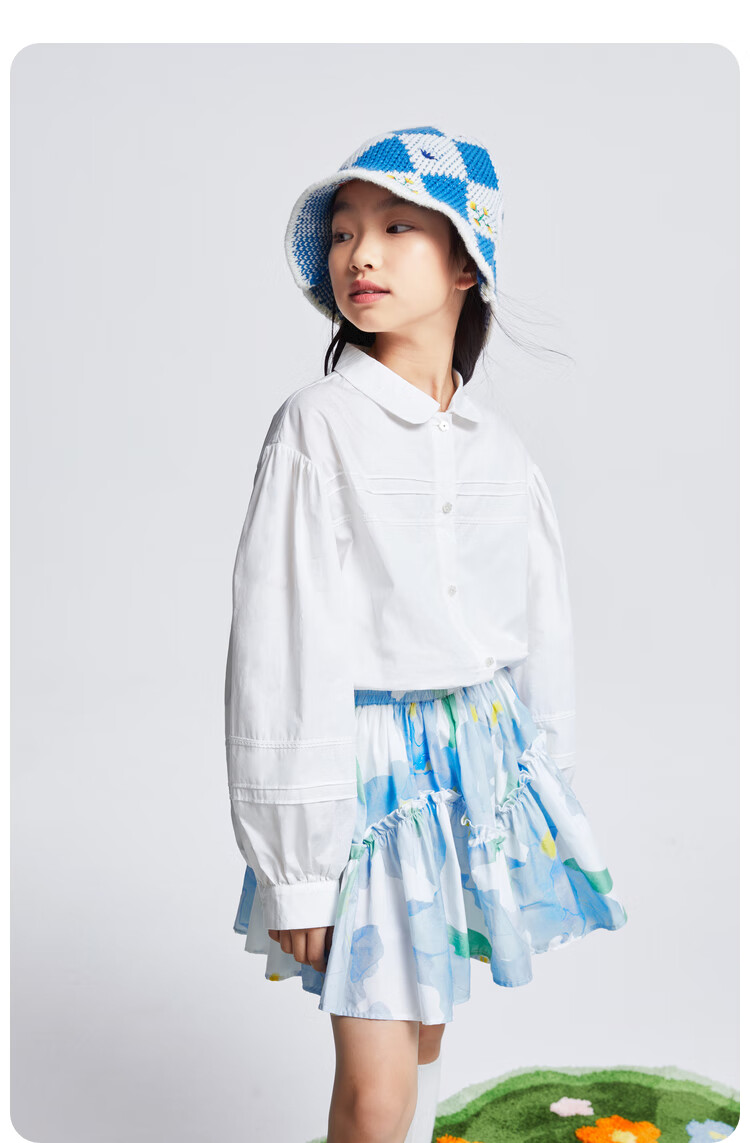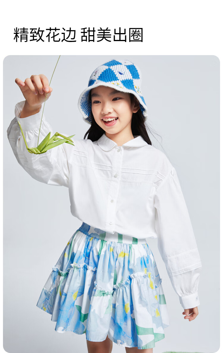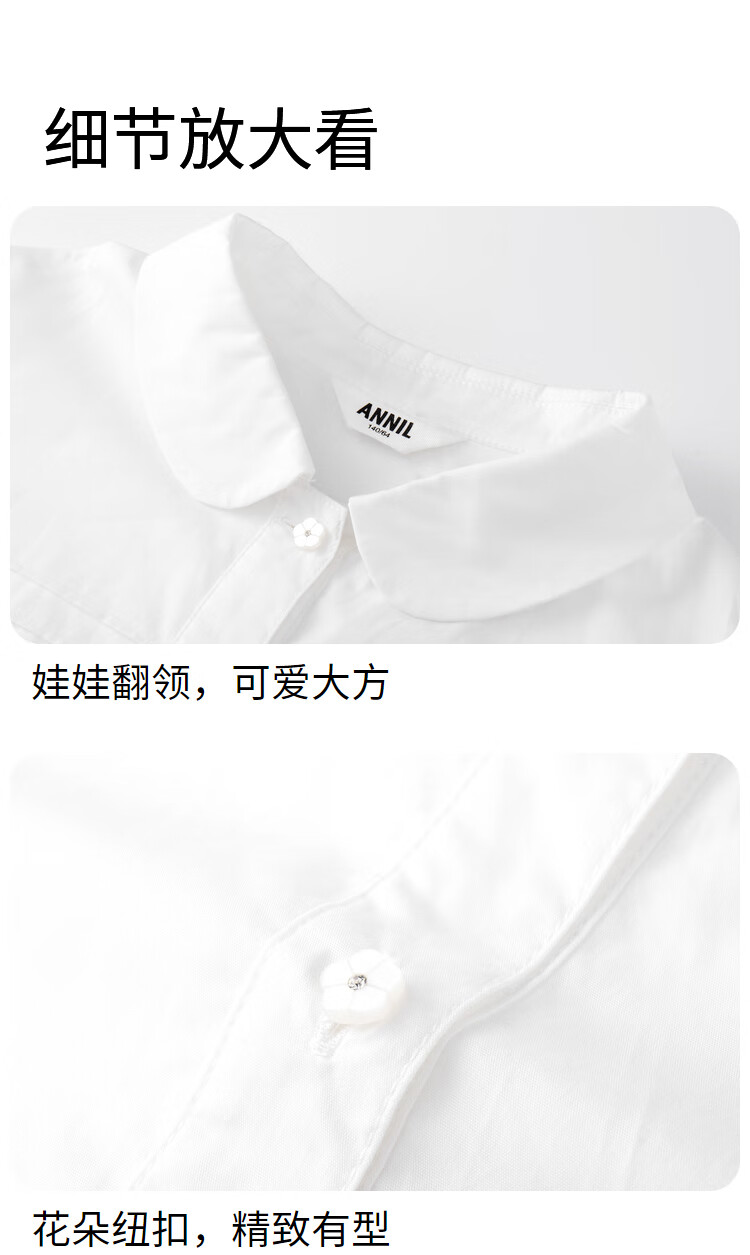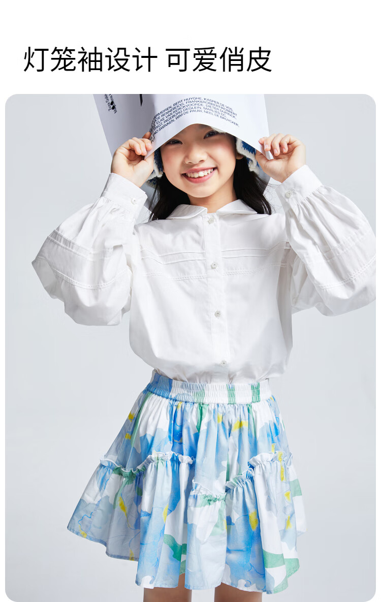 Anair girls' lapel long-sleeved cotton shirt 2025 spring new loose lantern sleeve white shirt off-white 120cm