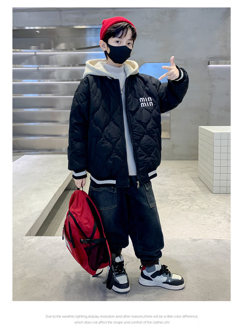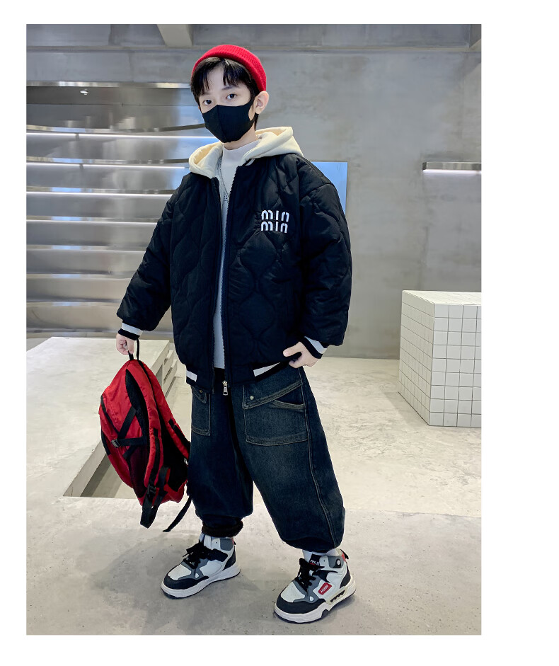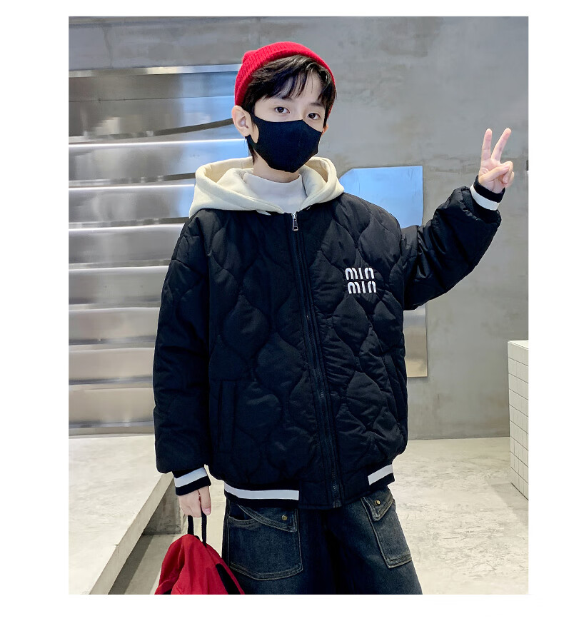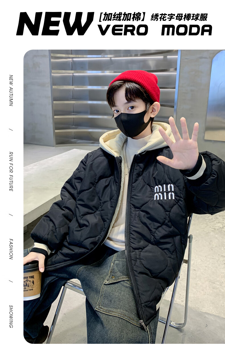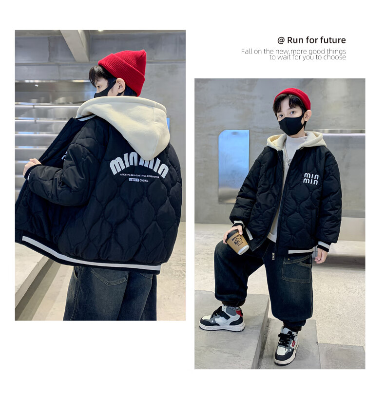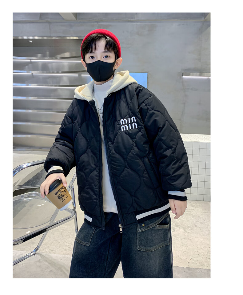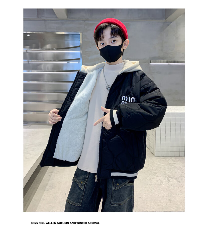 Monkey Brother Boys' Velvet Jacket 2024 New Medium and Large Boys' Thickened Baseball Jacket Hooded Children's Warm Internet Celebrity Jacket Black 150 cm