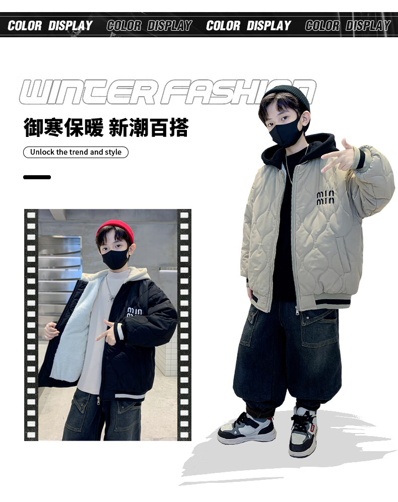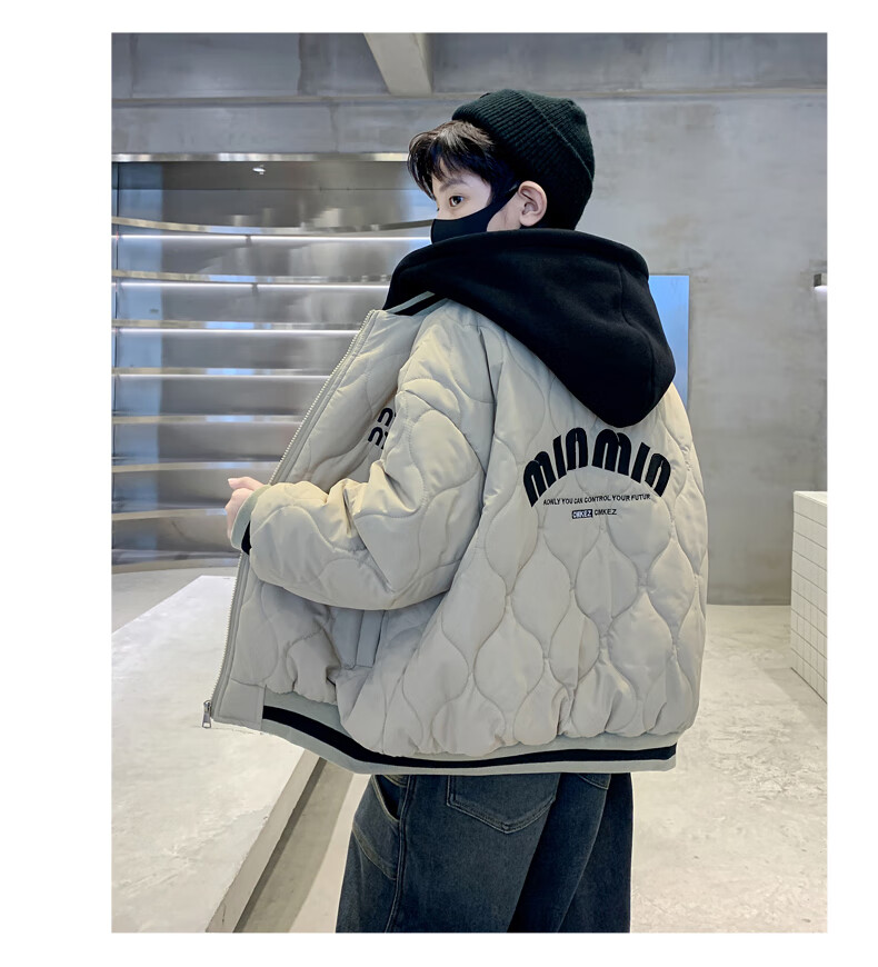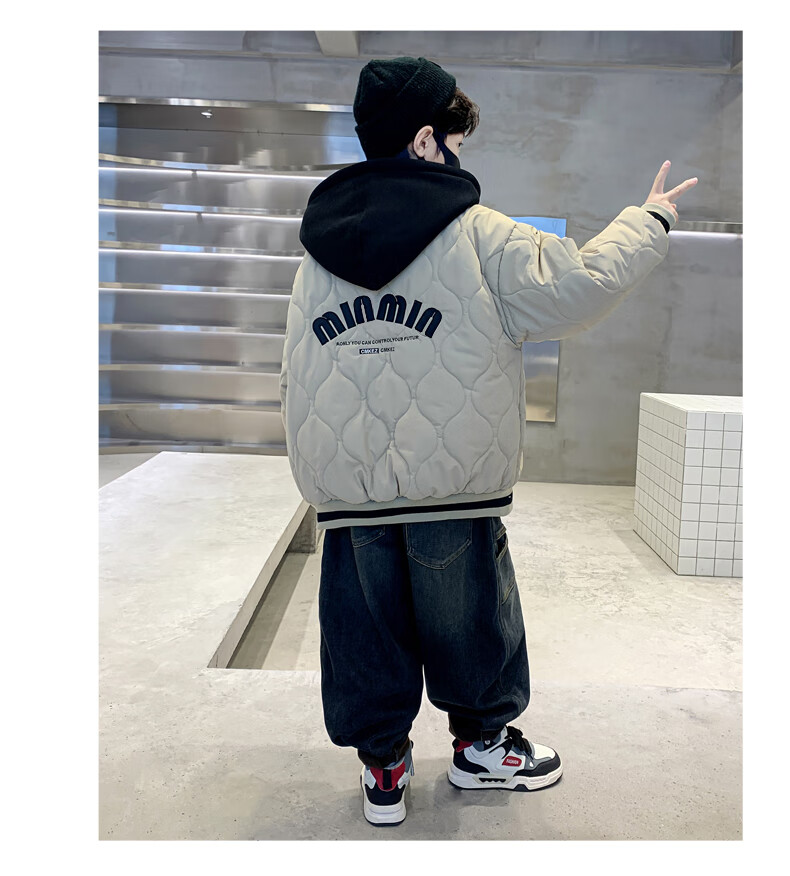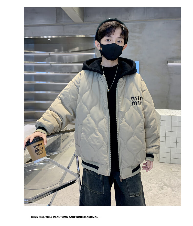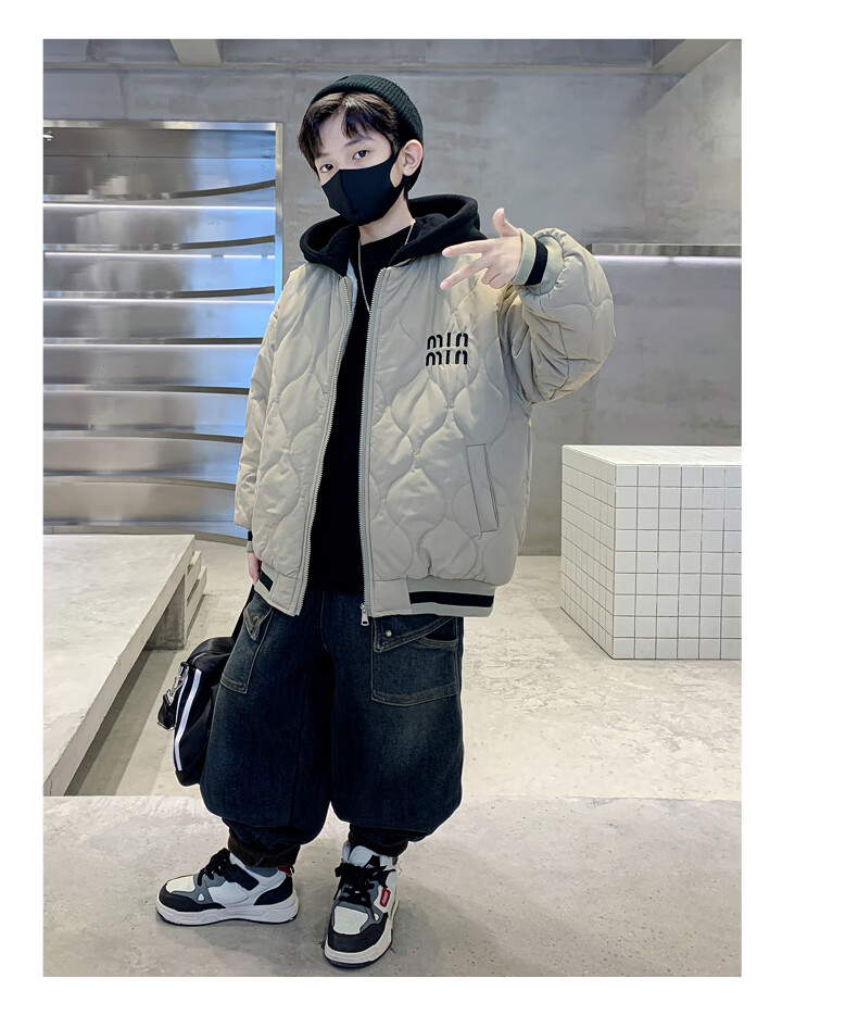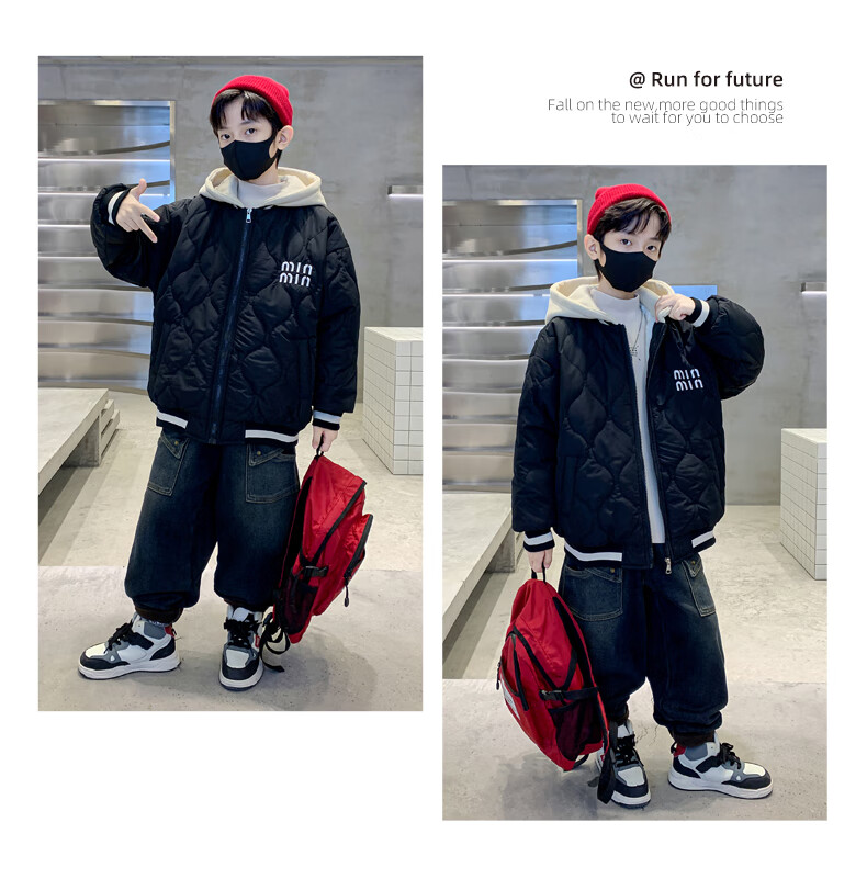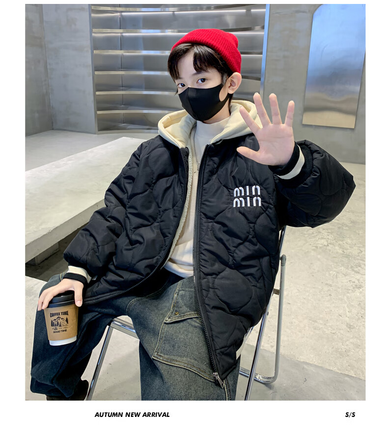 Monkey Brother Boys' Velvet Jacket 2024 New Medium and Large Boys' Thickened Baseball Jacket Hooded Children's Warm Internet Celebrity Jacket Black 150 cm