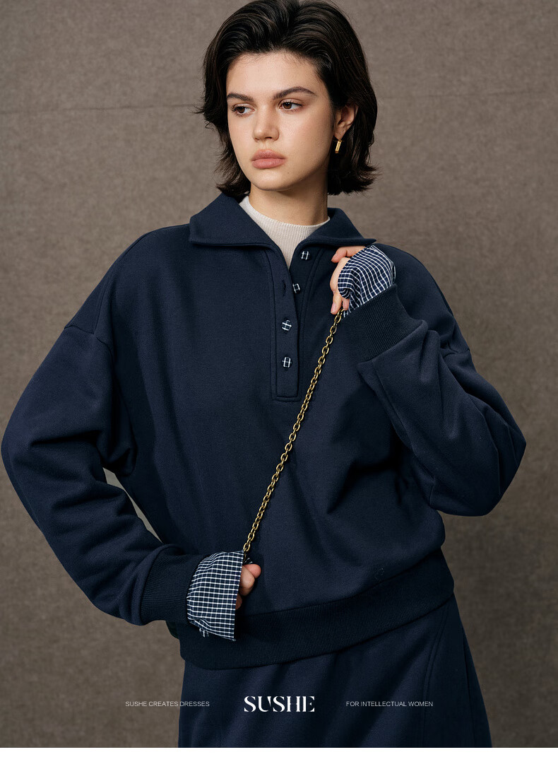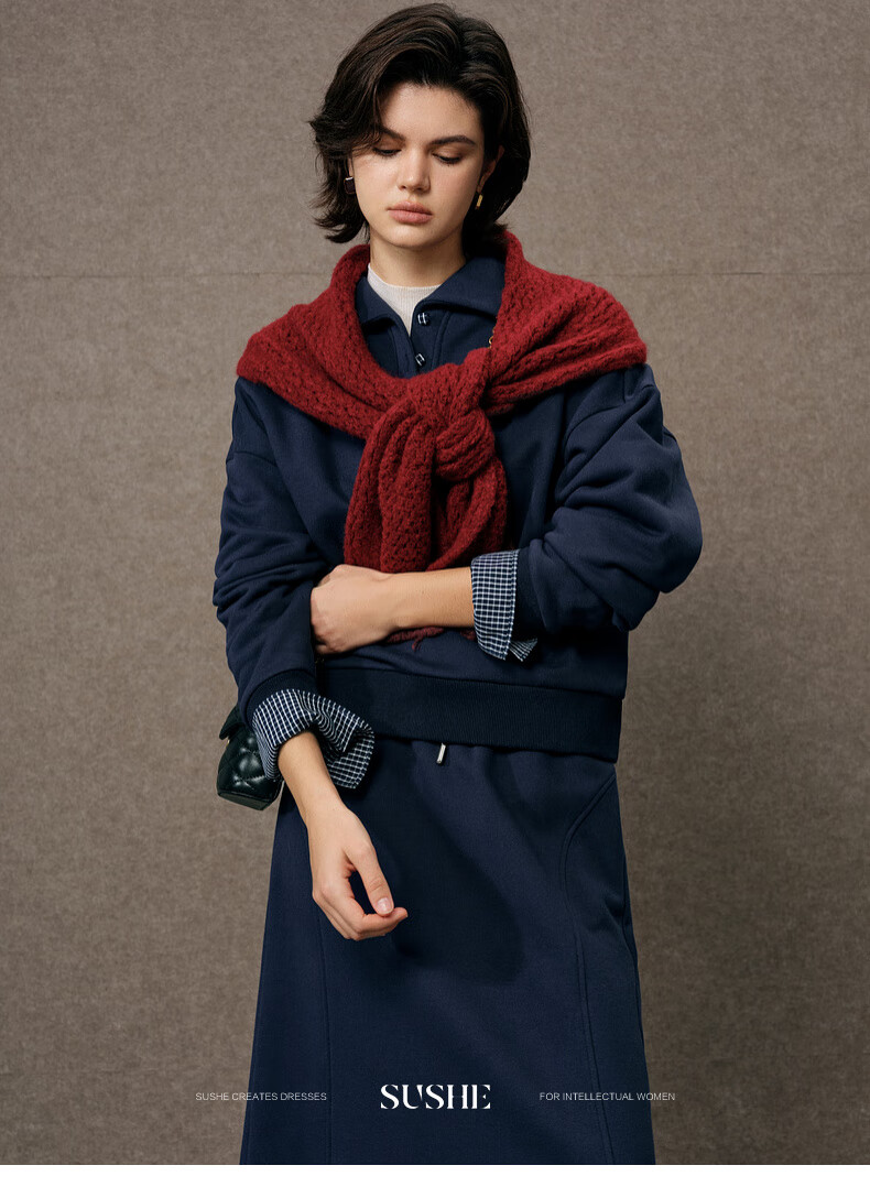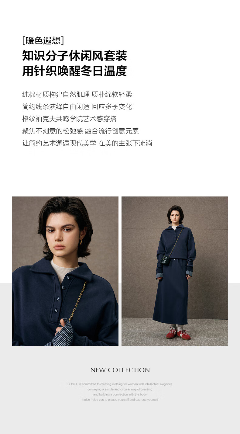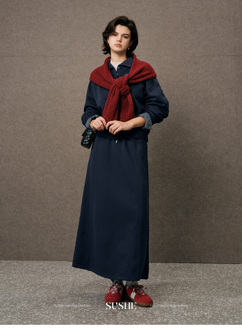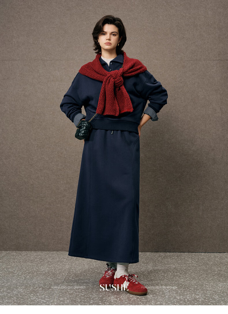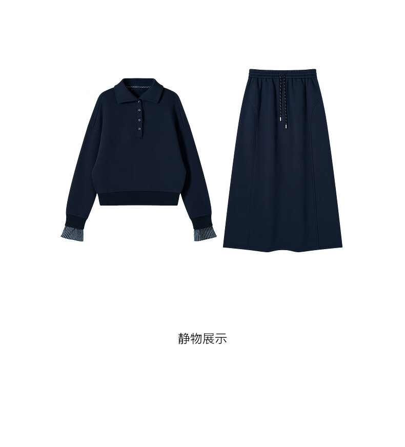 SUSHE Walden Intellectual Style Blue Polo Collar Top Elastic Straight Skirt Set Cyanyu Blue-Skirt S