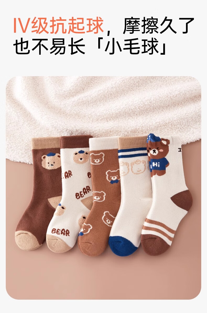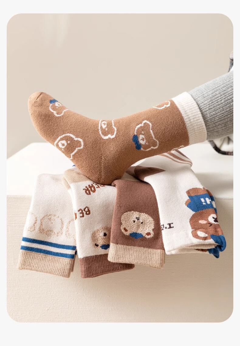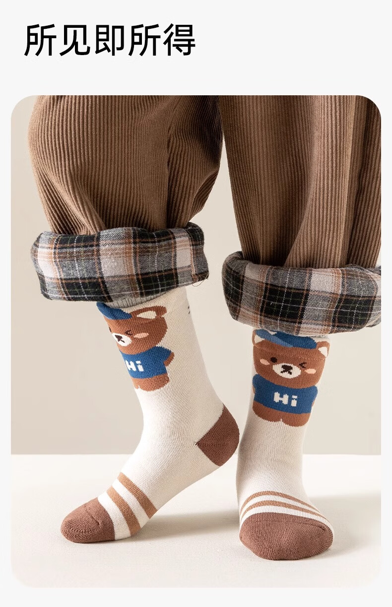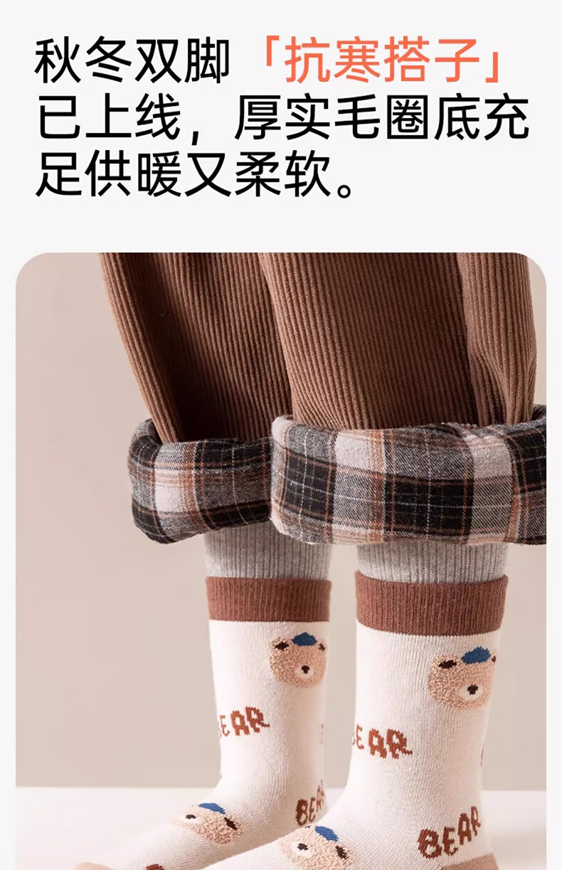 Cotton children's socks winter pure cotton boys plus velvet loop socks mid-calf socks baby autumn and winter thickened warm cotton socks H015-cute bear velvet thickened 5 pairs 1-3 years old -foot length 11-13CM shoe size 16-19