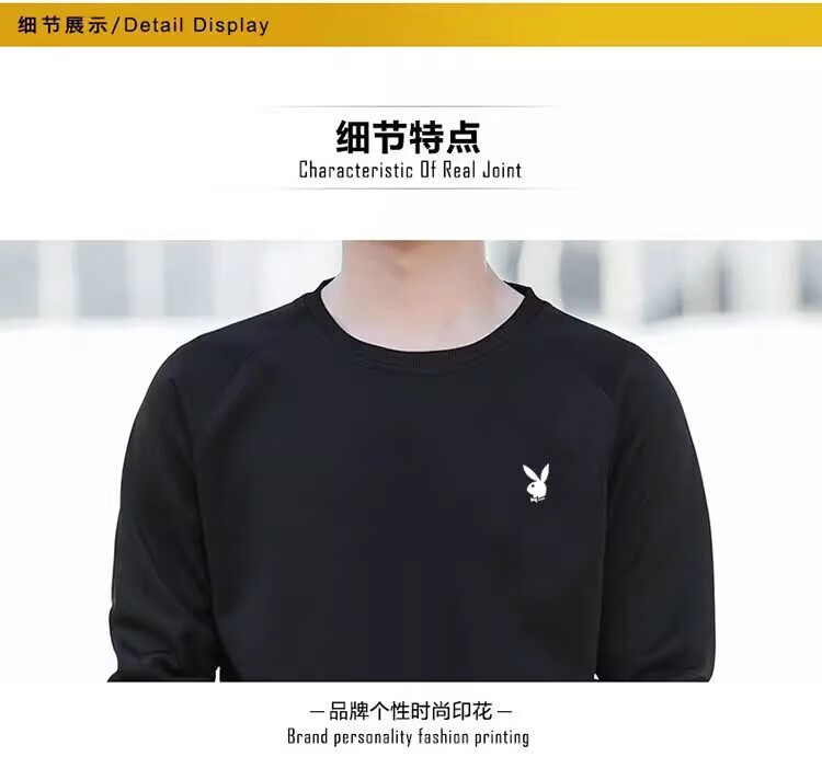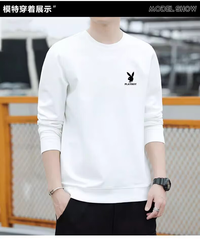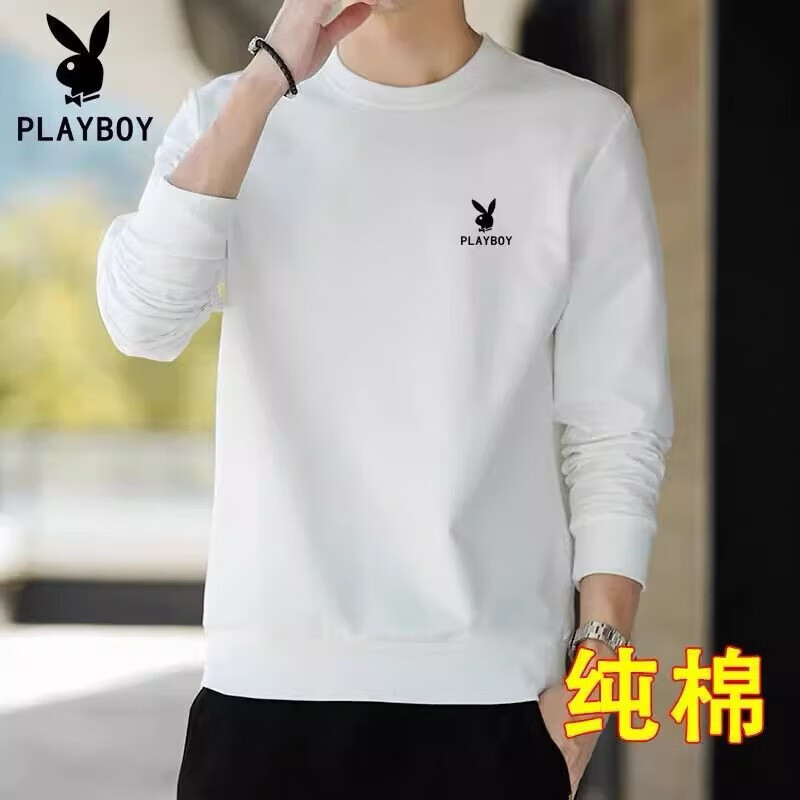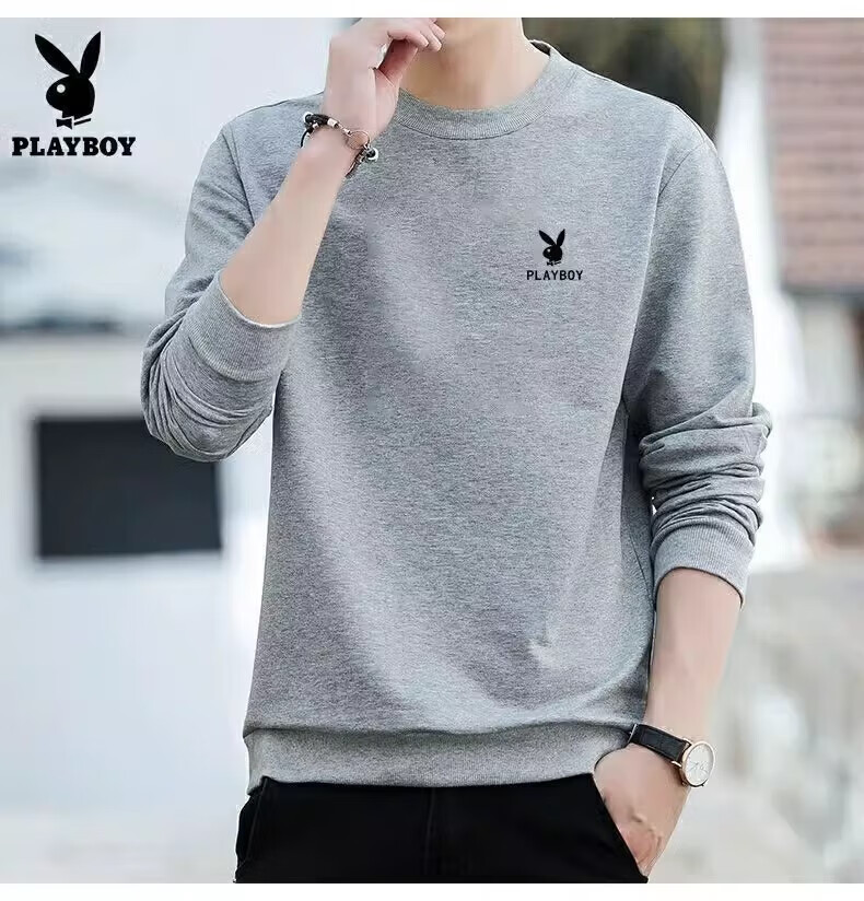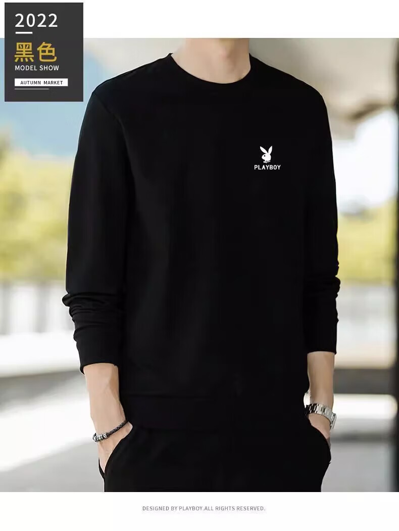 Playboy (PLAYBOY) men's sweatshirt long-sleeved tops plus velvet bottoming shirt men's spring and autumn new simple round neck pure cotton loose large size sweatshirt black regular style XL (recommended 115-125Jin Jin equals 0.5 kg)