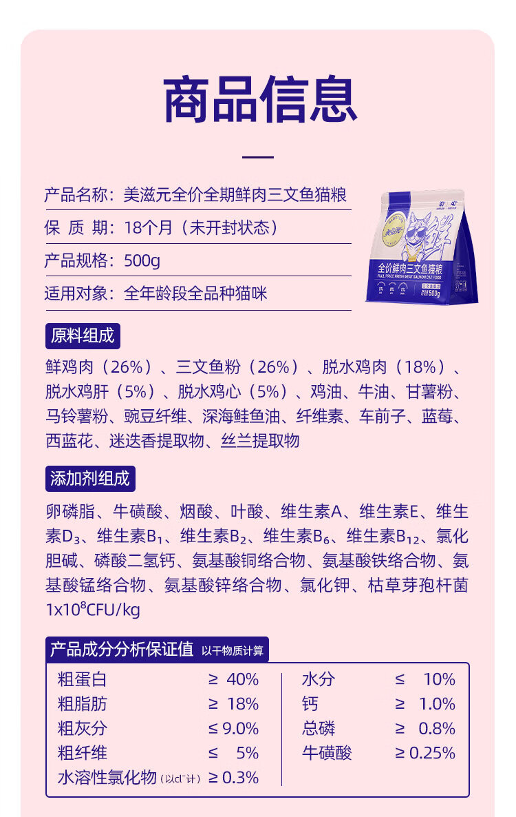 Meiziyuan Gold Label Salmon Cat Food Sample Pack 500g Fresh Meat Grain-Free Kittens and Adult Cats Full Stage Experience Pack Fresh Meat Squab Baked Cat Food 500g
