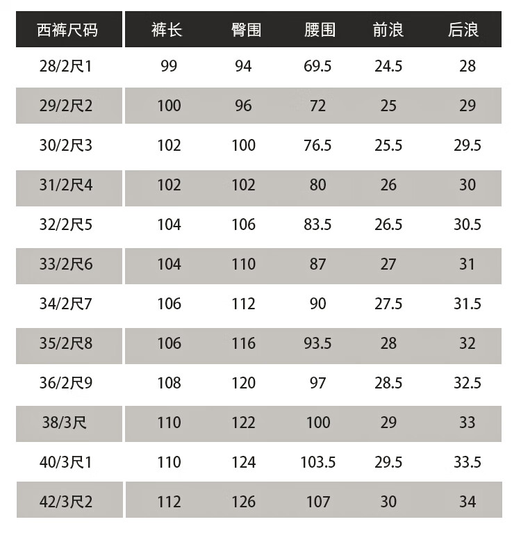 Outseam (cm) 99 cm 101.5 cm 104 cm 106.5 cm 109 cm