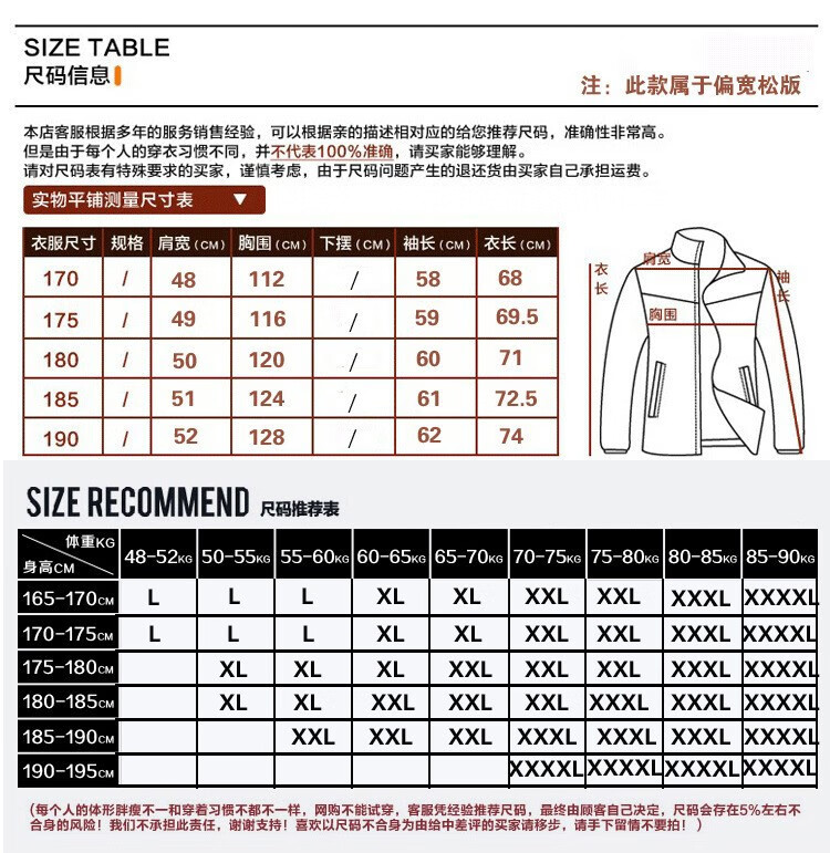 China (cm) 165 / 88-90 170 / 96-98 175 / 108-110 180 / 118-122 185 / 126-130