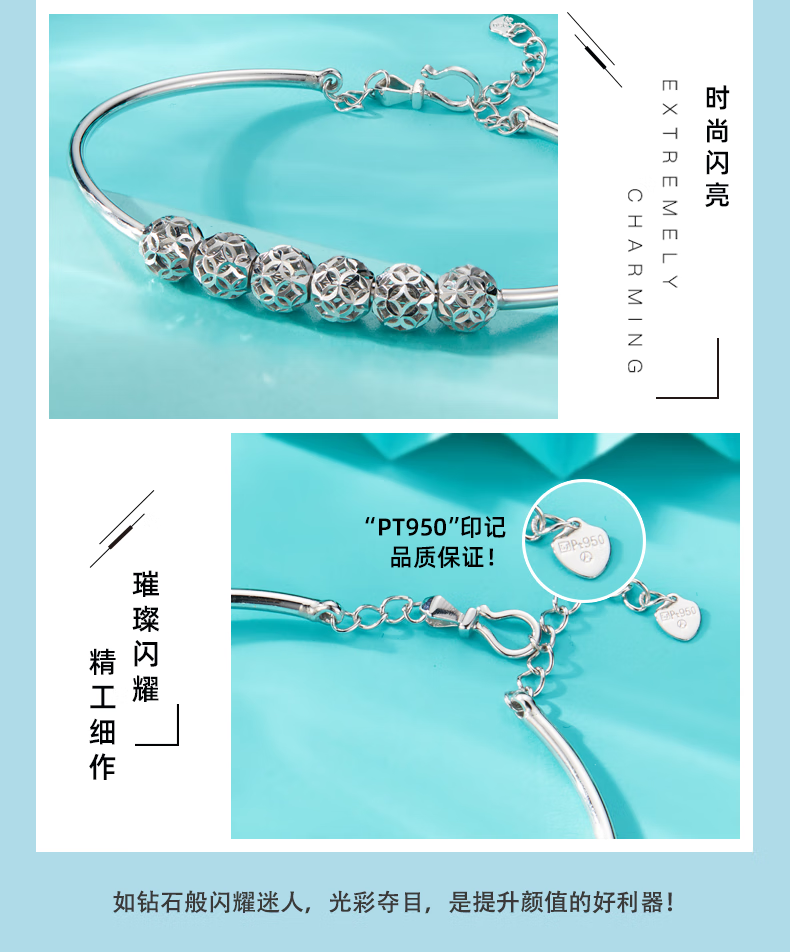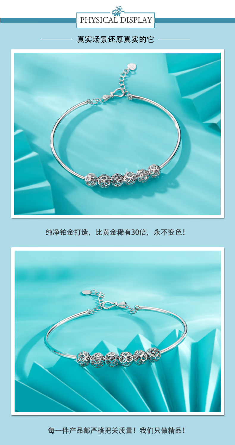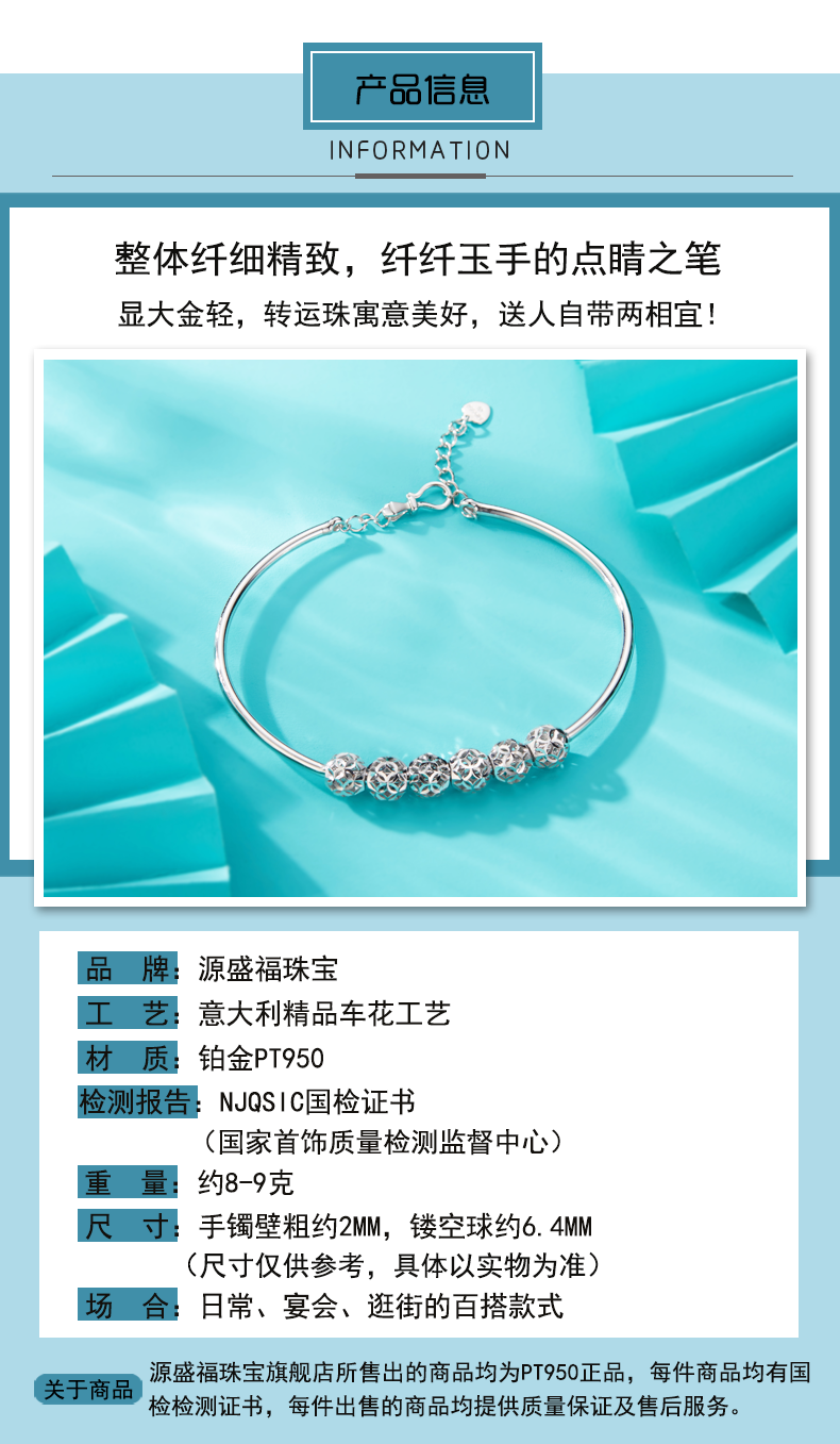 Yuan Shengfu's new PT950 high-quality fashionable hollow ball platinum bracelet, genuine platinum transfer beads, women's hand jewelry, 7.82g, 14-15.5CM