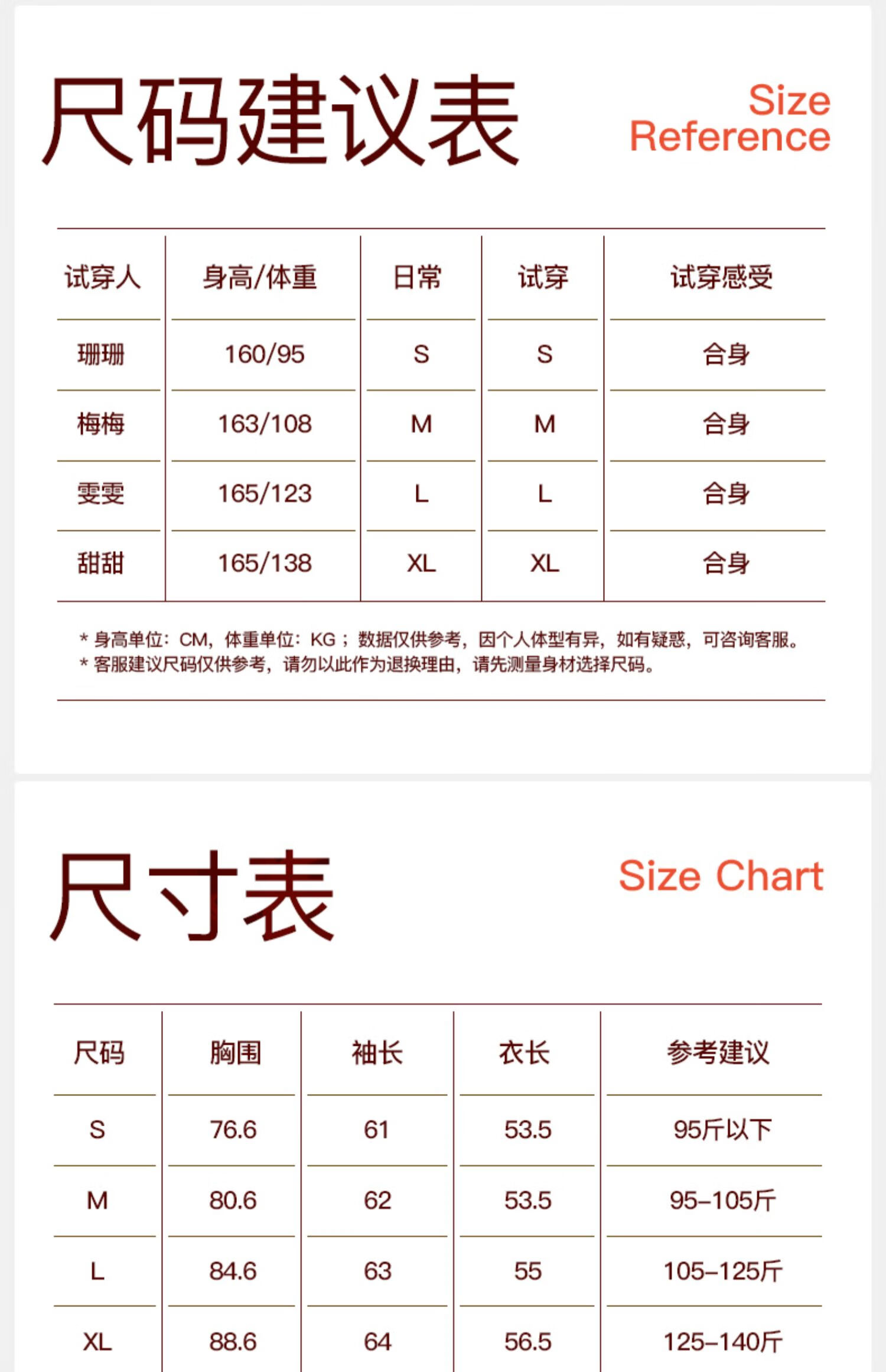 China (cm) 160-165/84-86 165-170 / 88-90 167-172 / 92-96 168-173 / 98-102 170-176 / 106-110
