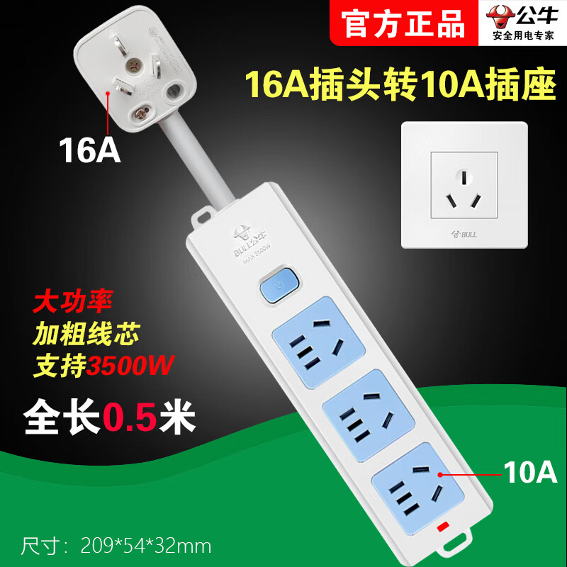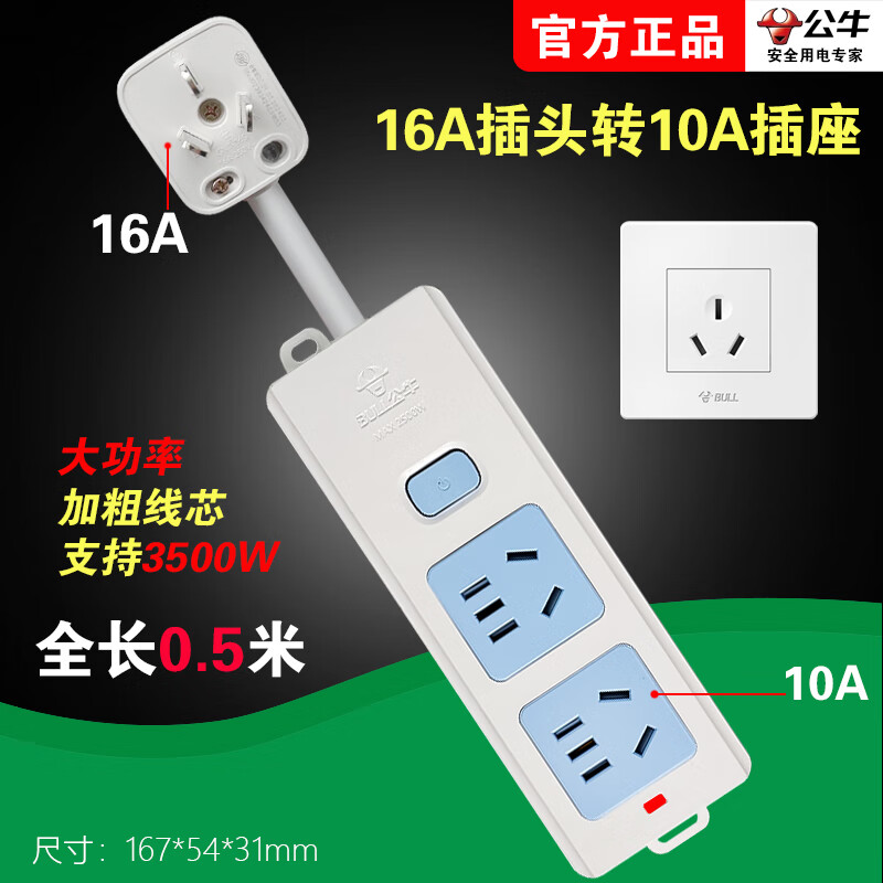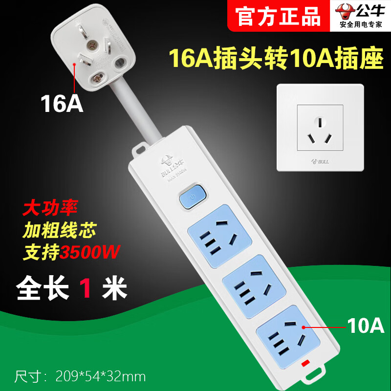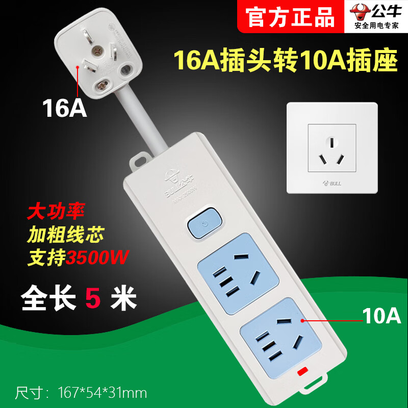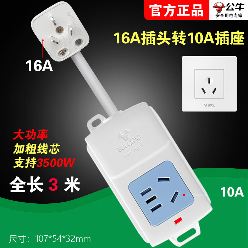 Bull 16A to 10A air conditioning jack to ordinary jack conversion socket drag strip with line plug-in board 1/2/3 meters customized 16A to 10A one plug 2 meters (2500W) Bull socket Bull copper wire (Bull set)