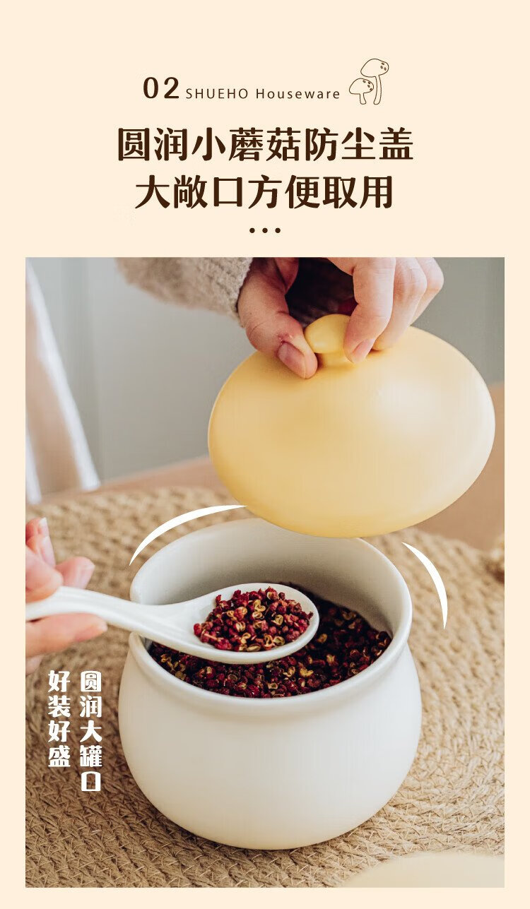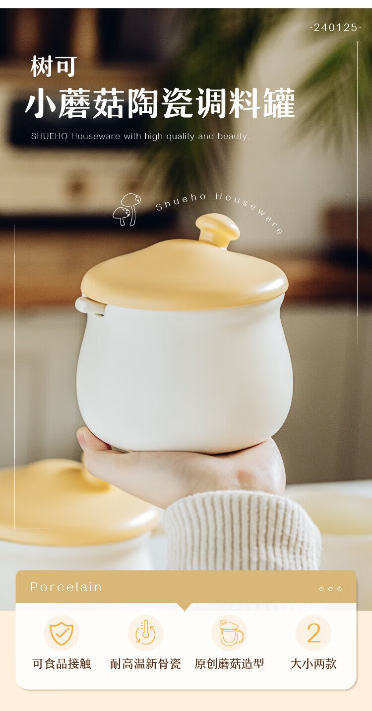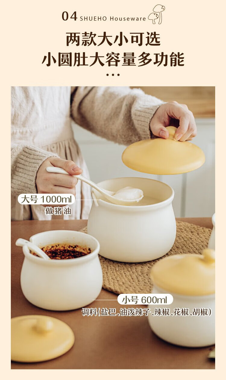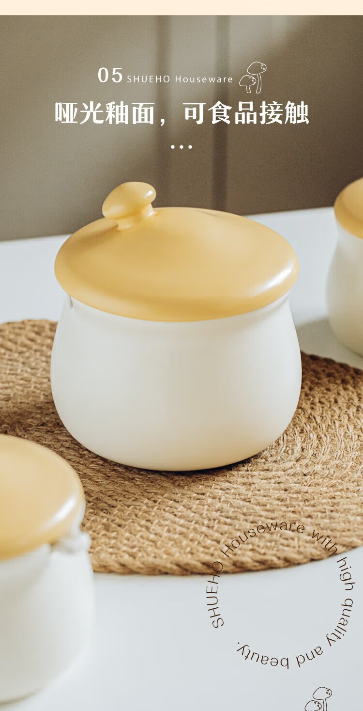 Shuke small mushroom lard jar home kitchen high temperature resistant ceramic chili spice storage seasoning meat and oil box mini size 370ml can be filled with salt, sugar