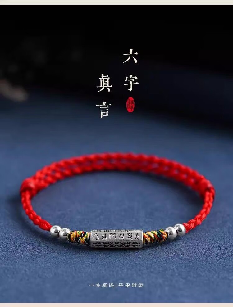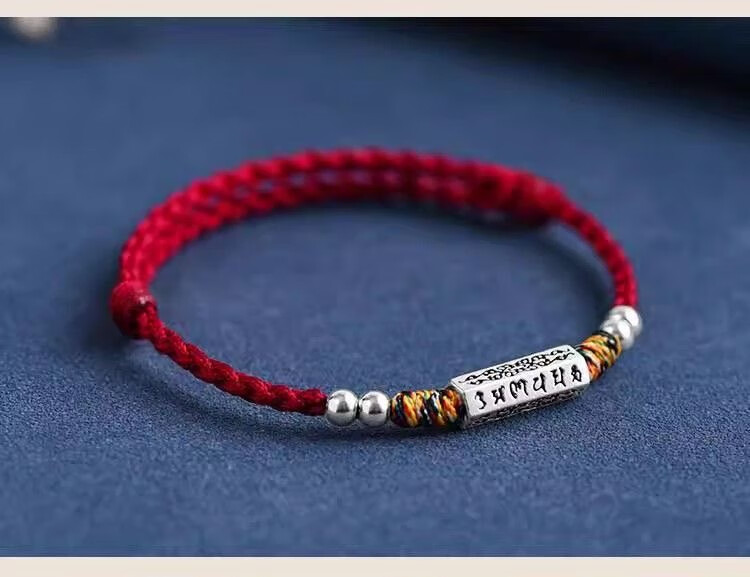 Tibetan silver six-character mantra for couples, red rope bracelet and anklet, good luck for men and women, Tibetan colorful braided bracelet for gift, safe red and silver six-character mantra bracelet