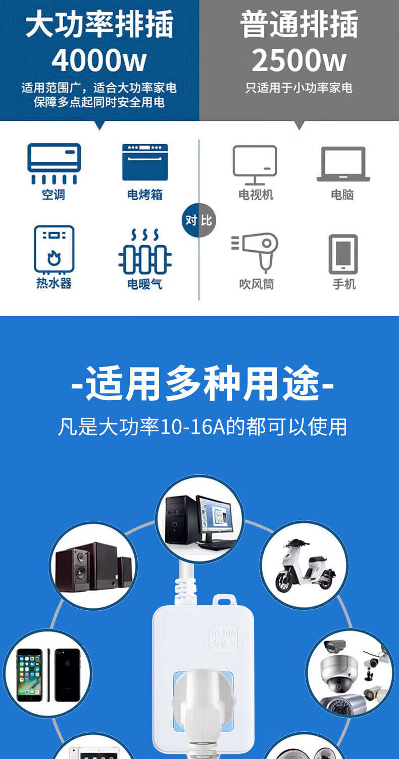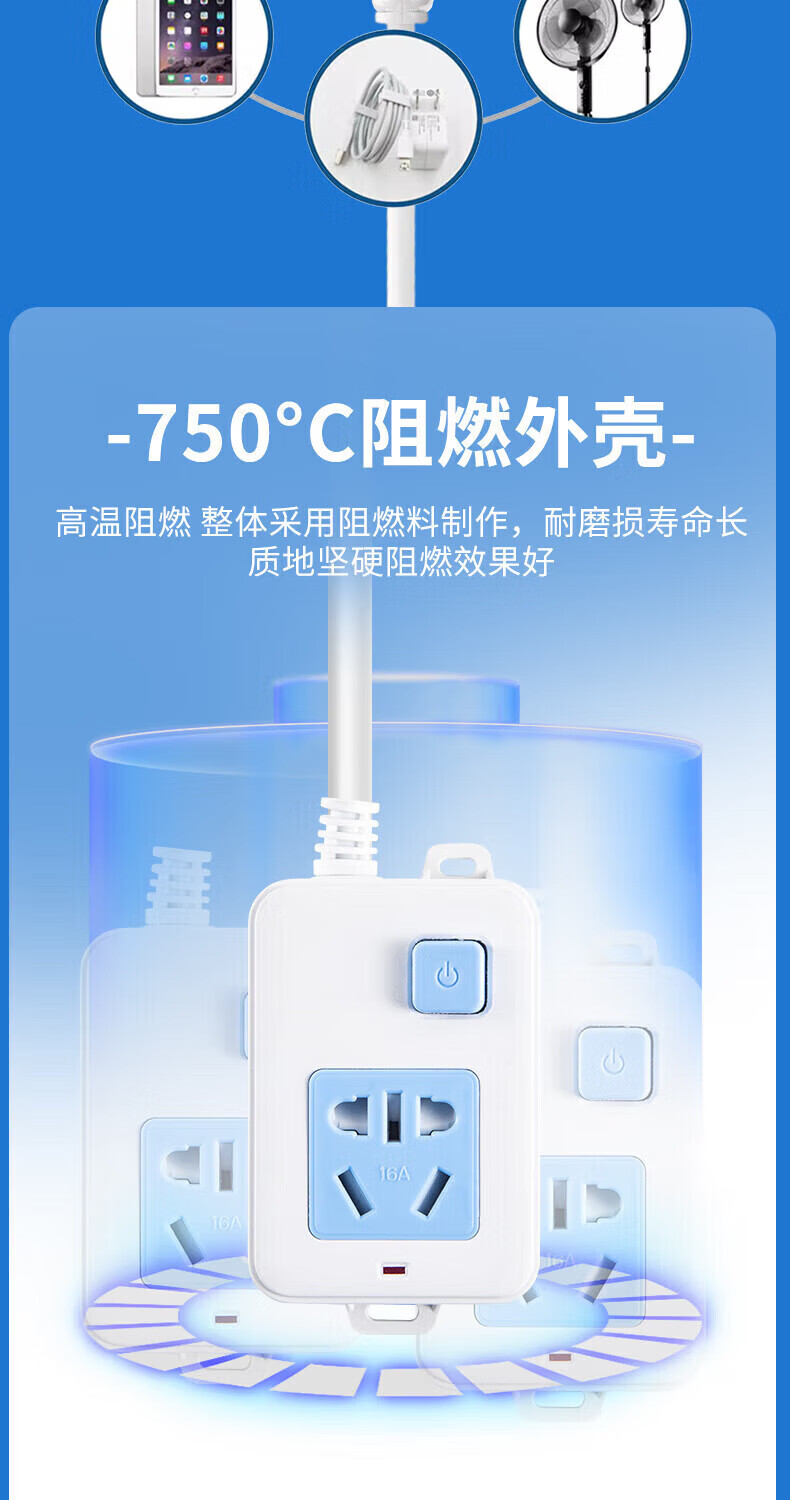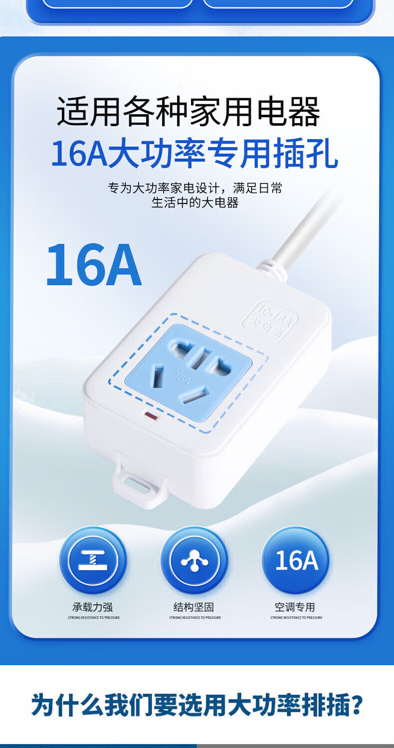 Bull (BULL) same style high power 16A air conditioning socket pure copper power strip with wire strip plug into long wire strip blue and white with switch and plug wire total length 1 meter