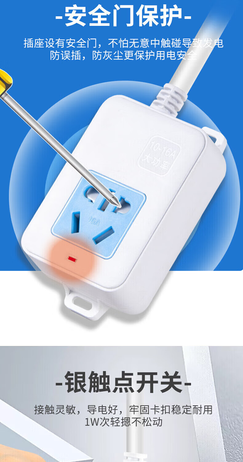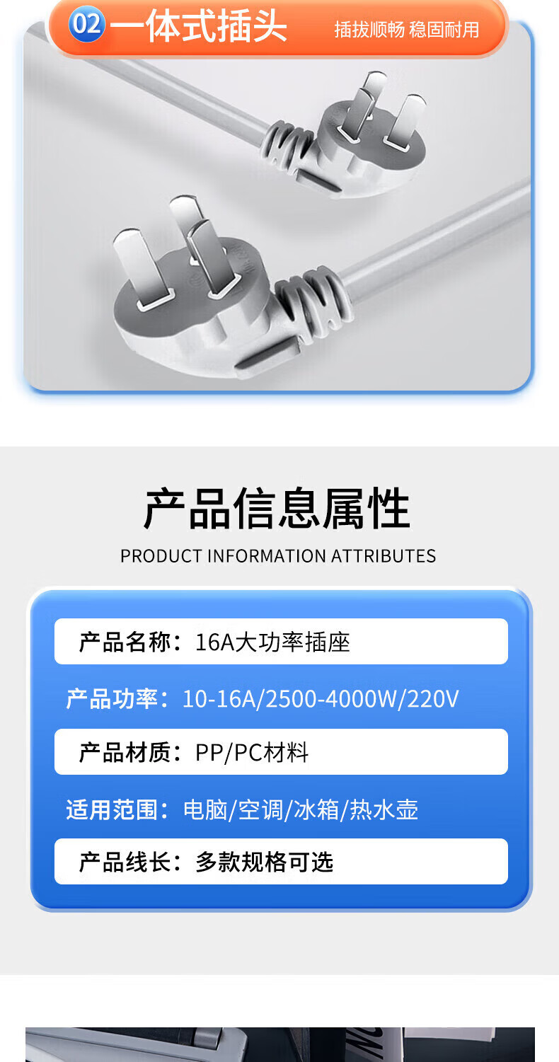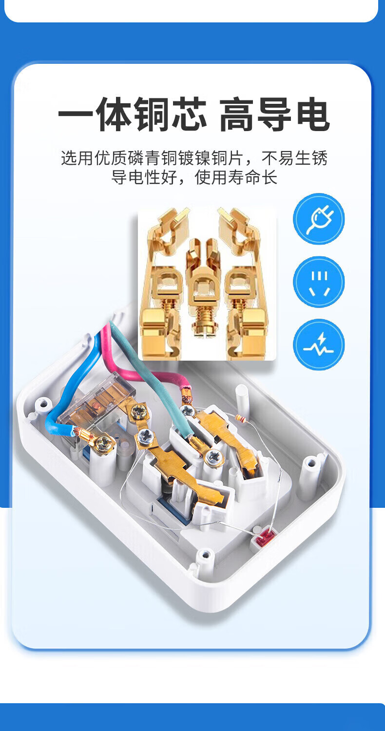Bull (BULL) same style high power 16A air conditioning socket pure copper power strip with wire strip plug into long wire strip blue and white with switch and plug wire total length 1 meter