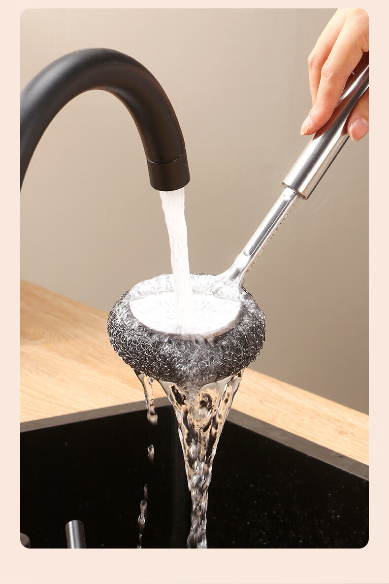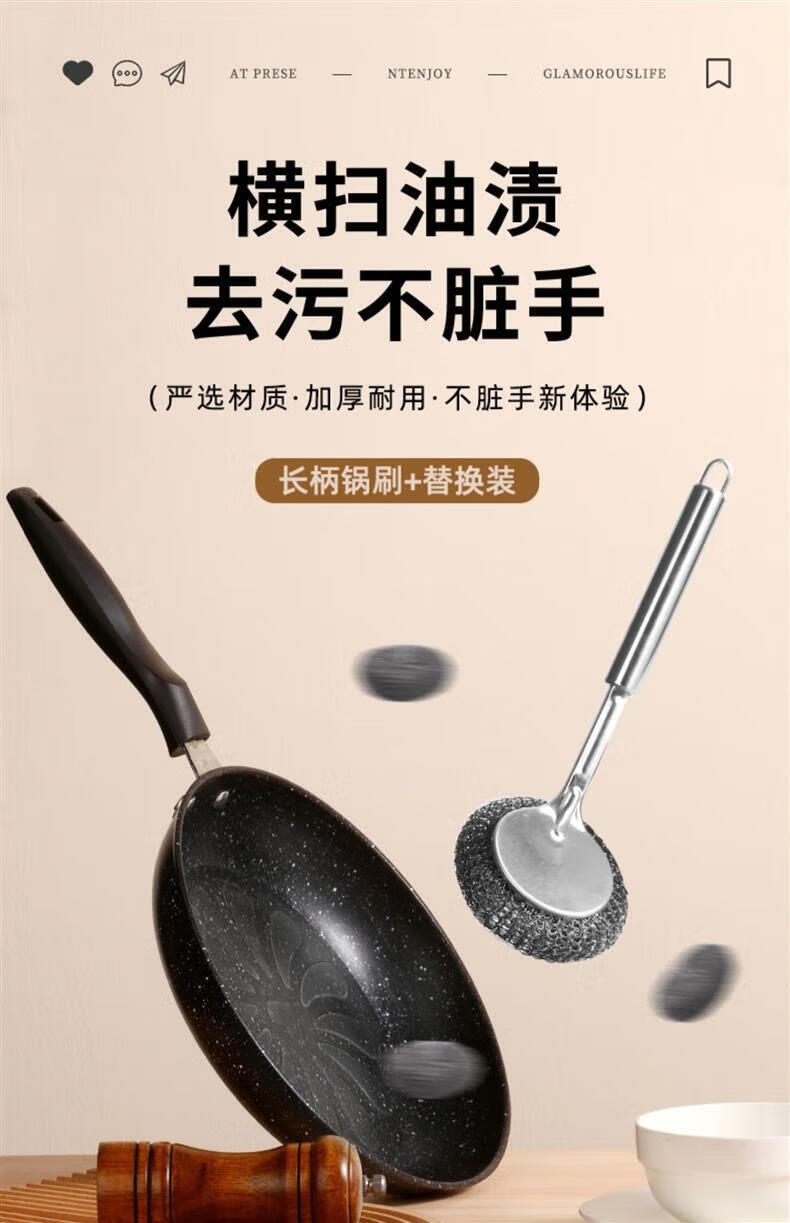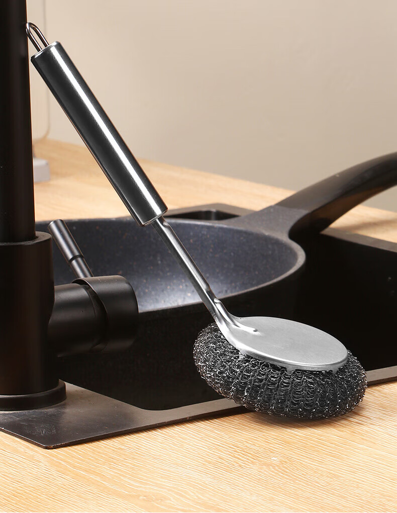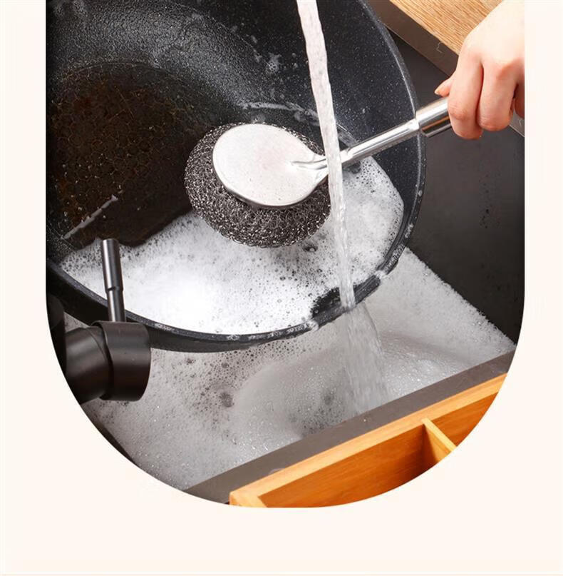 Stainless steel pot brush long handle pot washing brush household cleaning brush large steel wire ball with handle decontamination pot brush artifact stainless steel pot brush 1 pack + 1 spare brush head