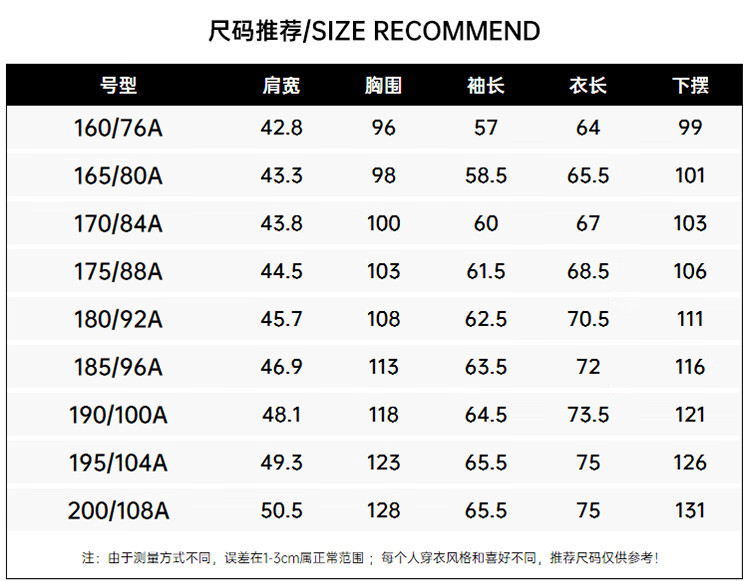 China (cm) 160-165/84-86 165-170 / 88-90 167-172 / 92-96 168-173 / 98-102 170-176 / 106-110