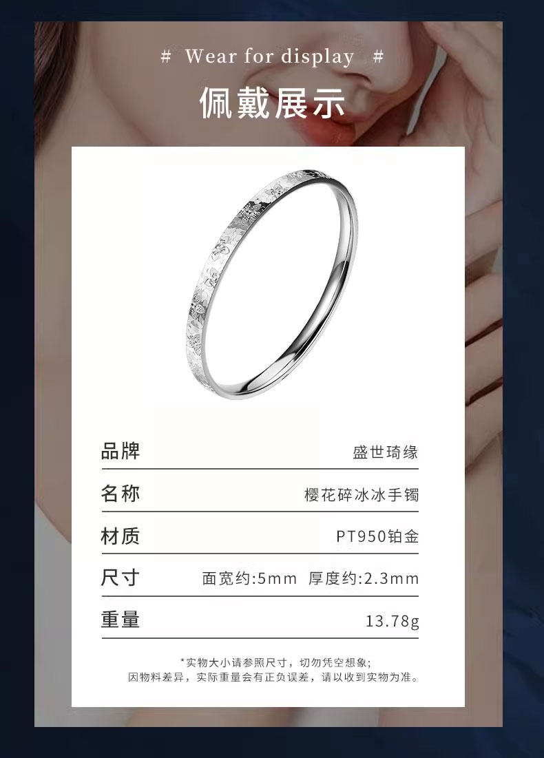 Shengshi Qiyuan (SHENGSHIQIYUAN) platinum bracelet for women pt950 pure platinum platinum bracelet for women semi-solid new crushed ice bracelet bracelet bracelet inner diameter 54mm weight 17g thick about 5mm