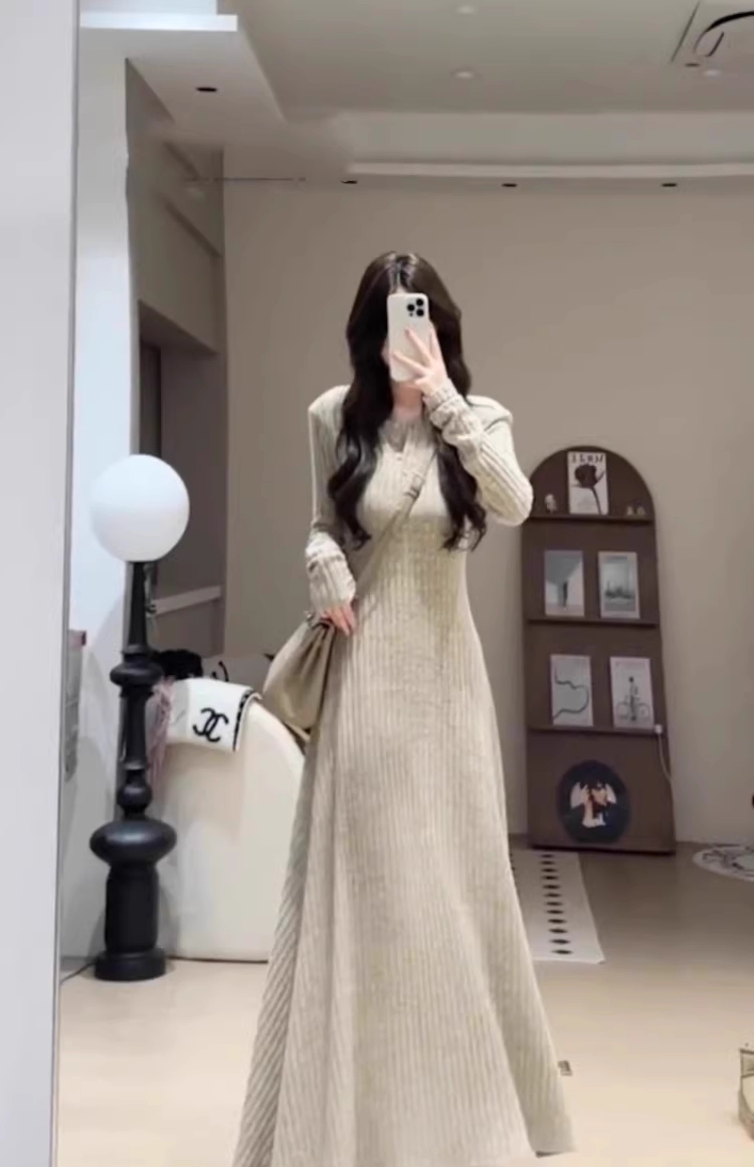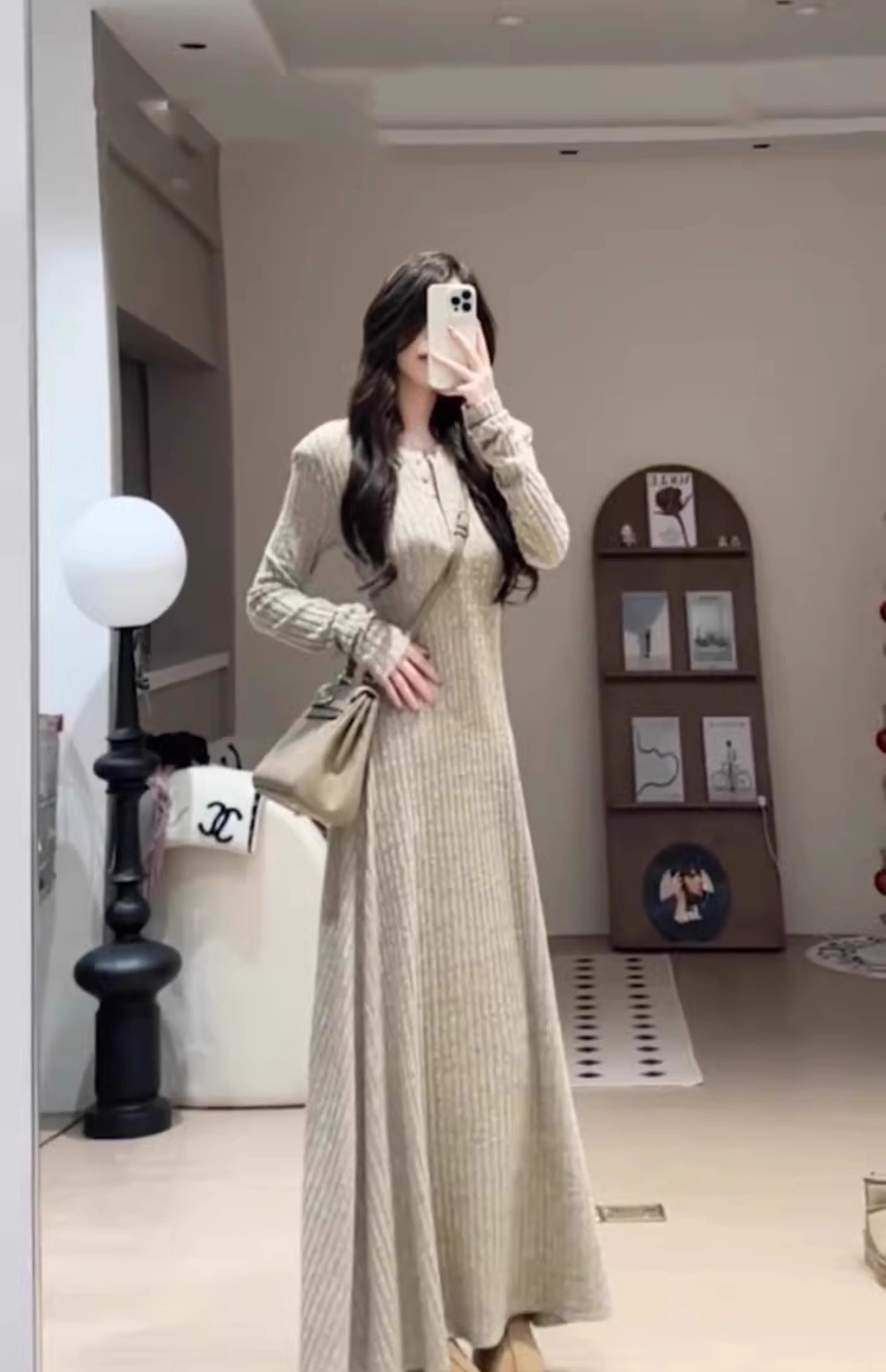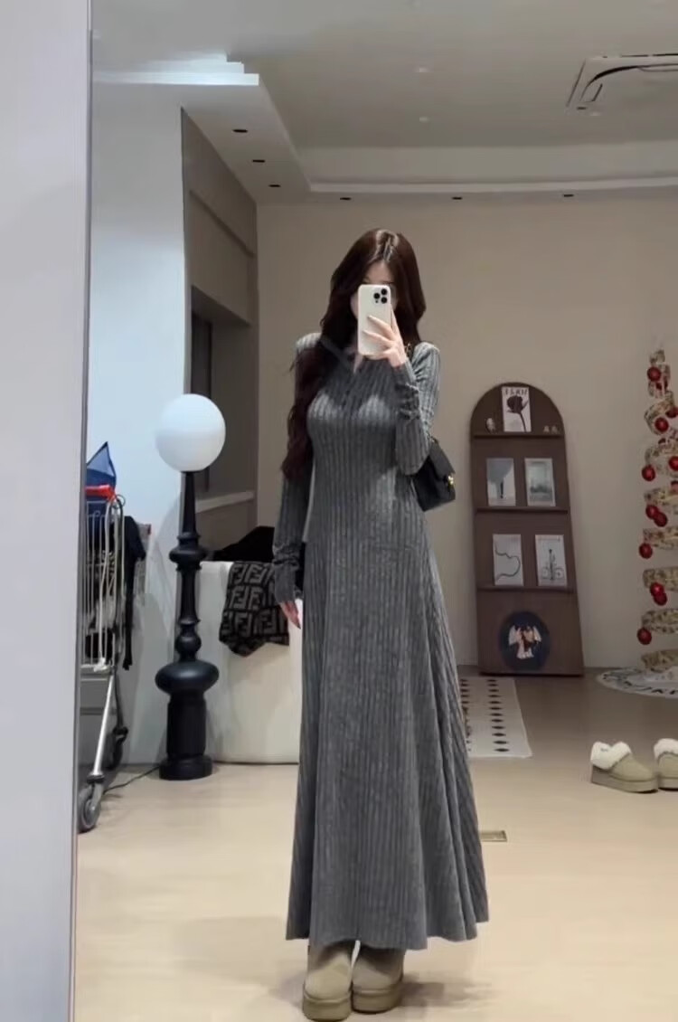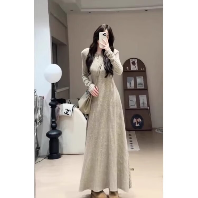 Hao'e's gentle, lazy, high-end knitted dress, spring and autumn temperament long skirt, slim waist and slimming long skirt, oatmeal color M