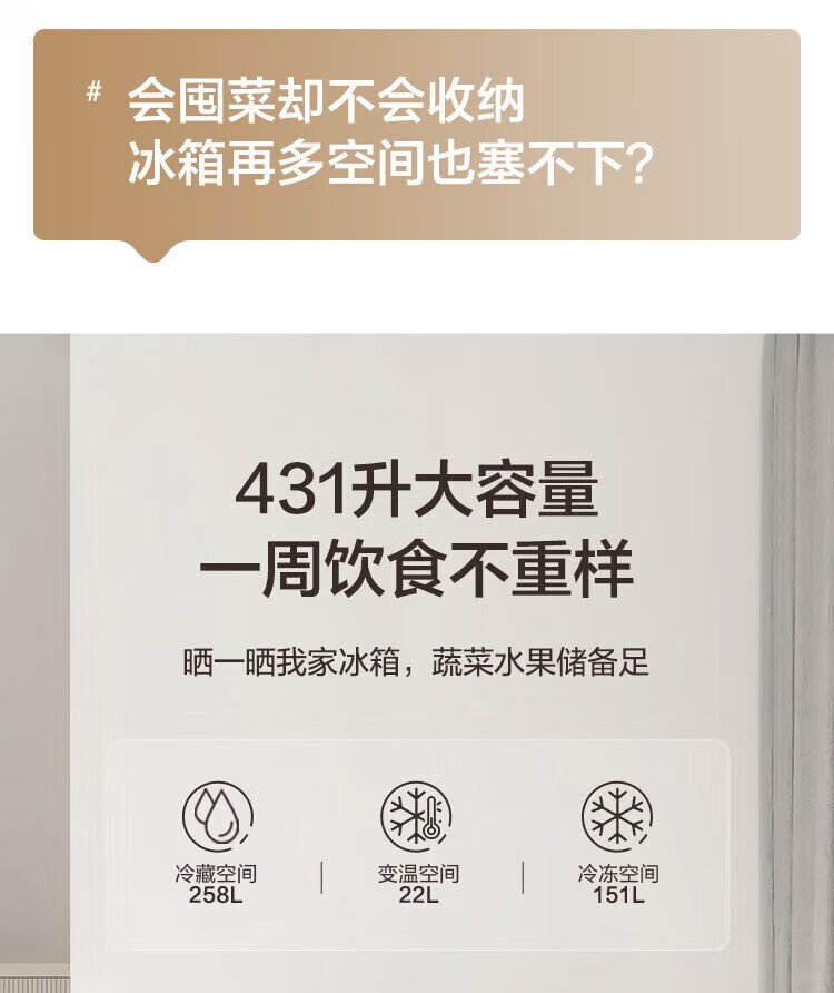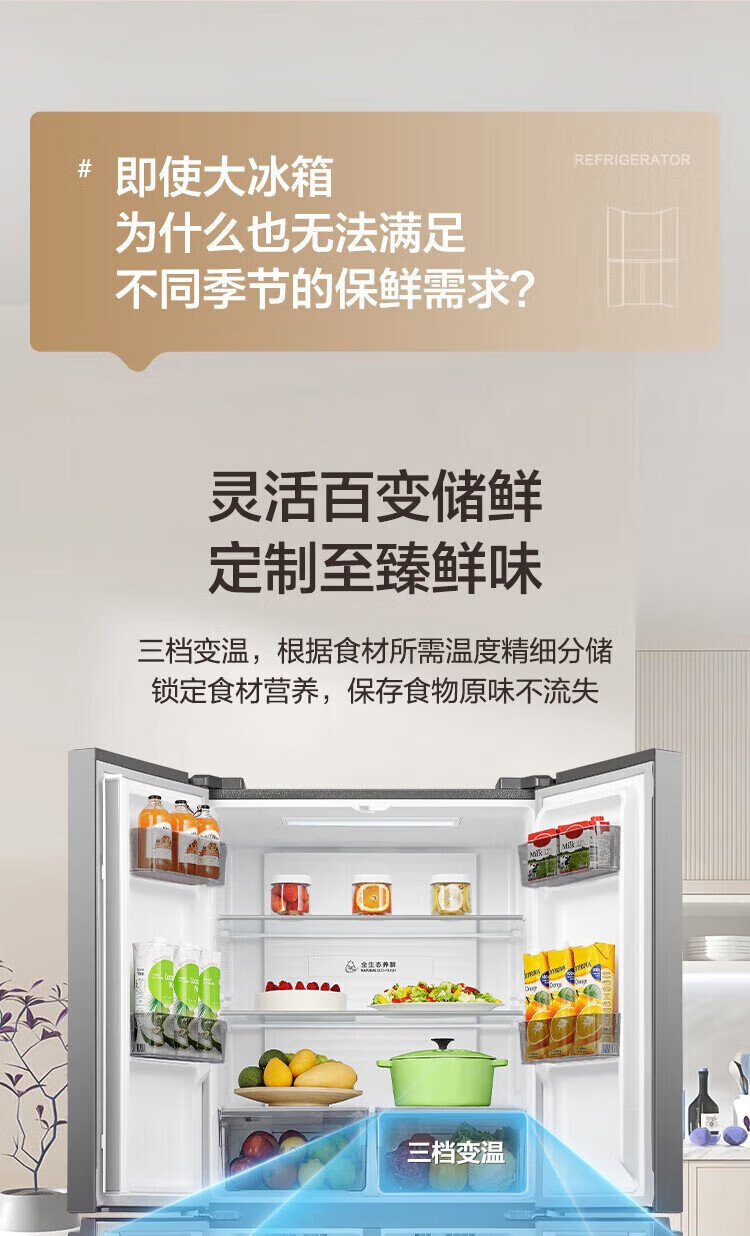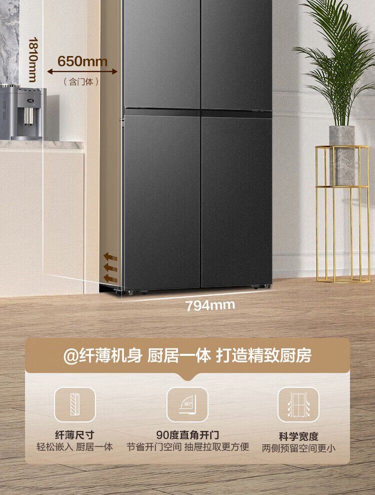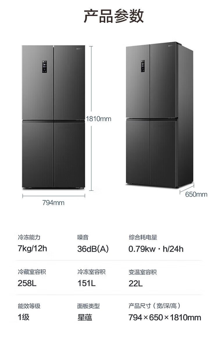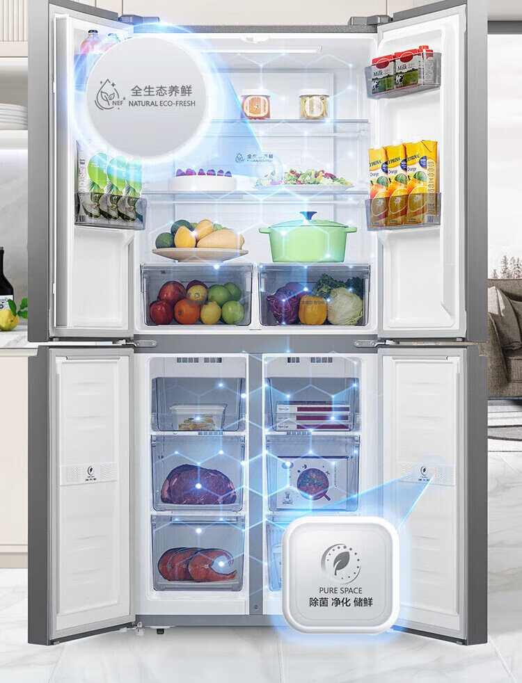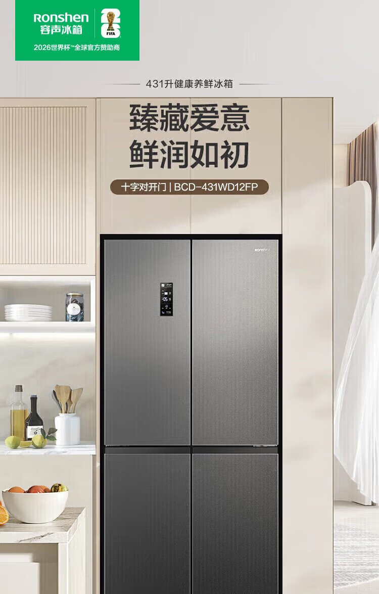 Rongsheng 431 liter cross-door first-class energy efficiency ultra-thin variable frequency air-cooled frost-free large capacity energy-saving low-noise household four-door cross-door refrigerator 20% national subsidy BCD-431WD12FP Xingyun