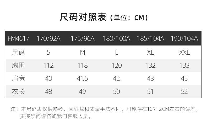 China (cm) 165 / 88-90 170 / 96-98 175 / 108-110 180 / 118-122 185 / 126-130
