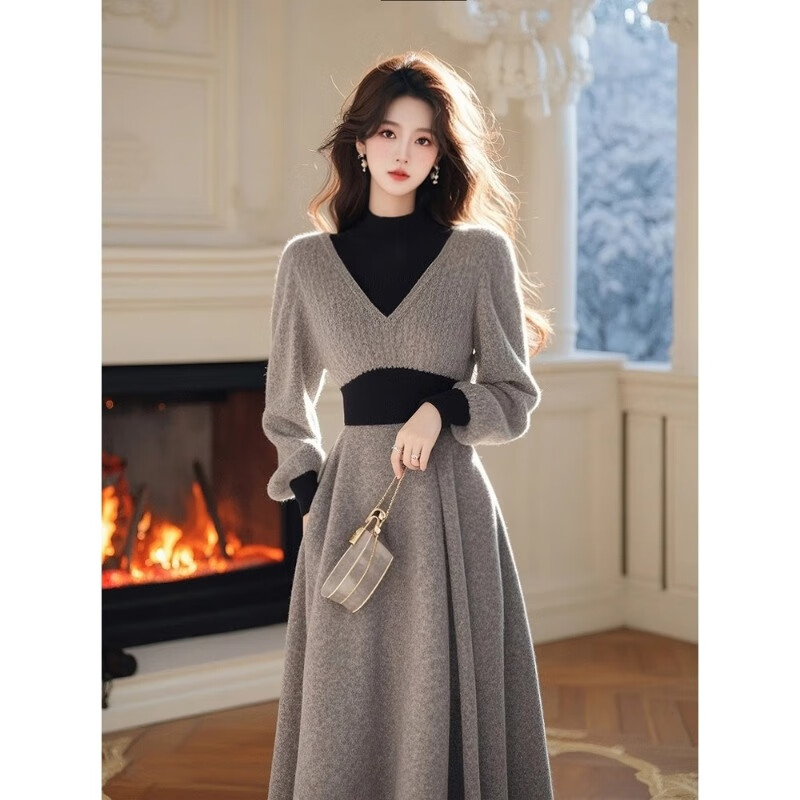 Yanxun Gray High Collar Knitted Dress Women's 2025 Winter High-Quality Super Nice-looking Waist Wrap Long Skirt Gray M