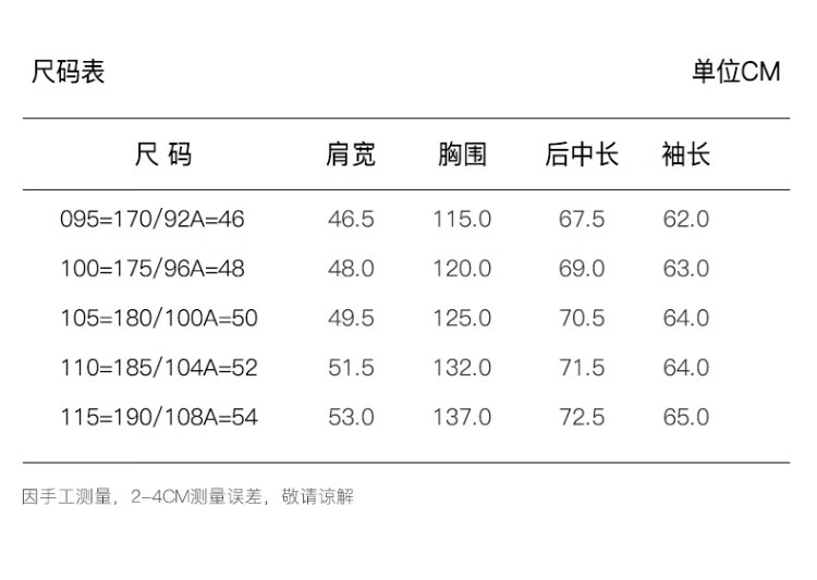 China (cm) 160-165/84-86 165-170 / 88-90 167-172 / 92-96 168-173 / 98-102 170-176 / 106-110