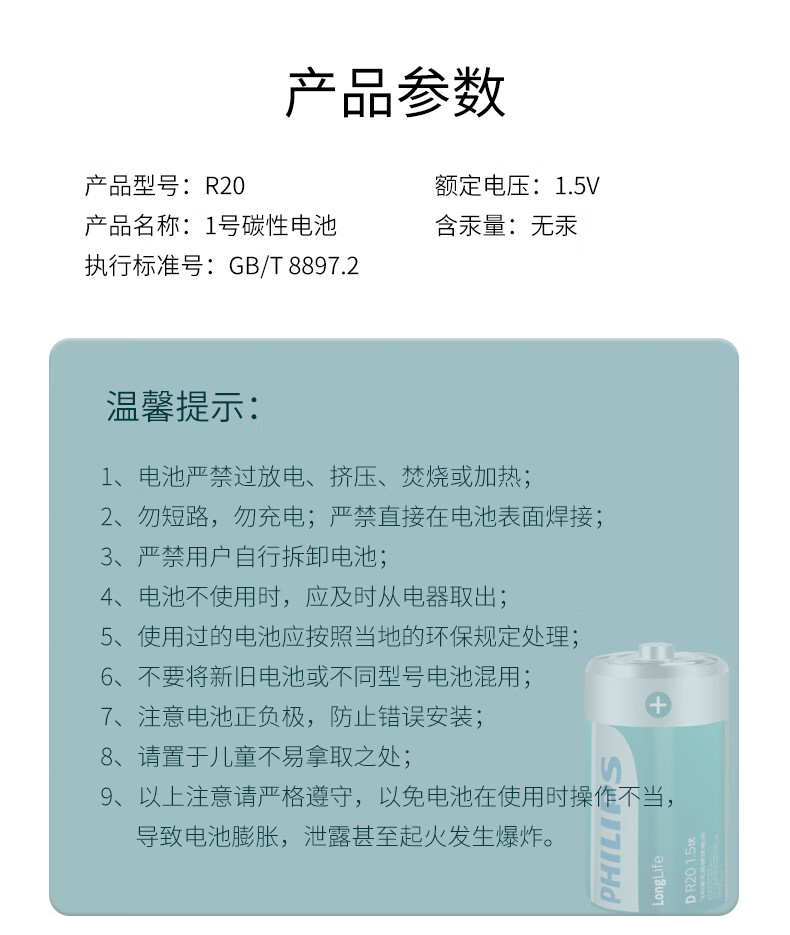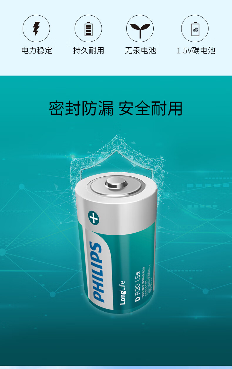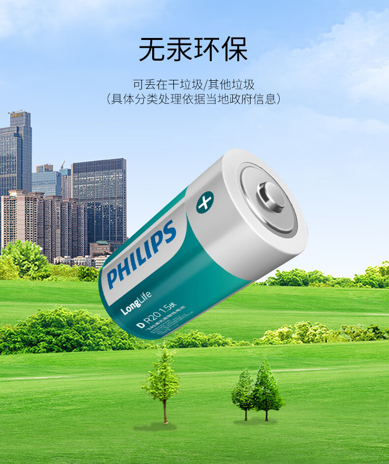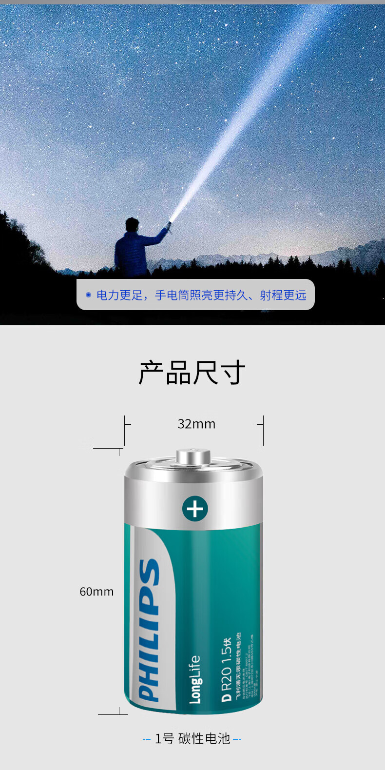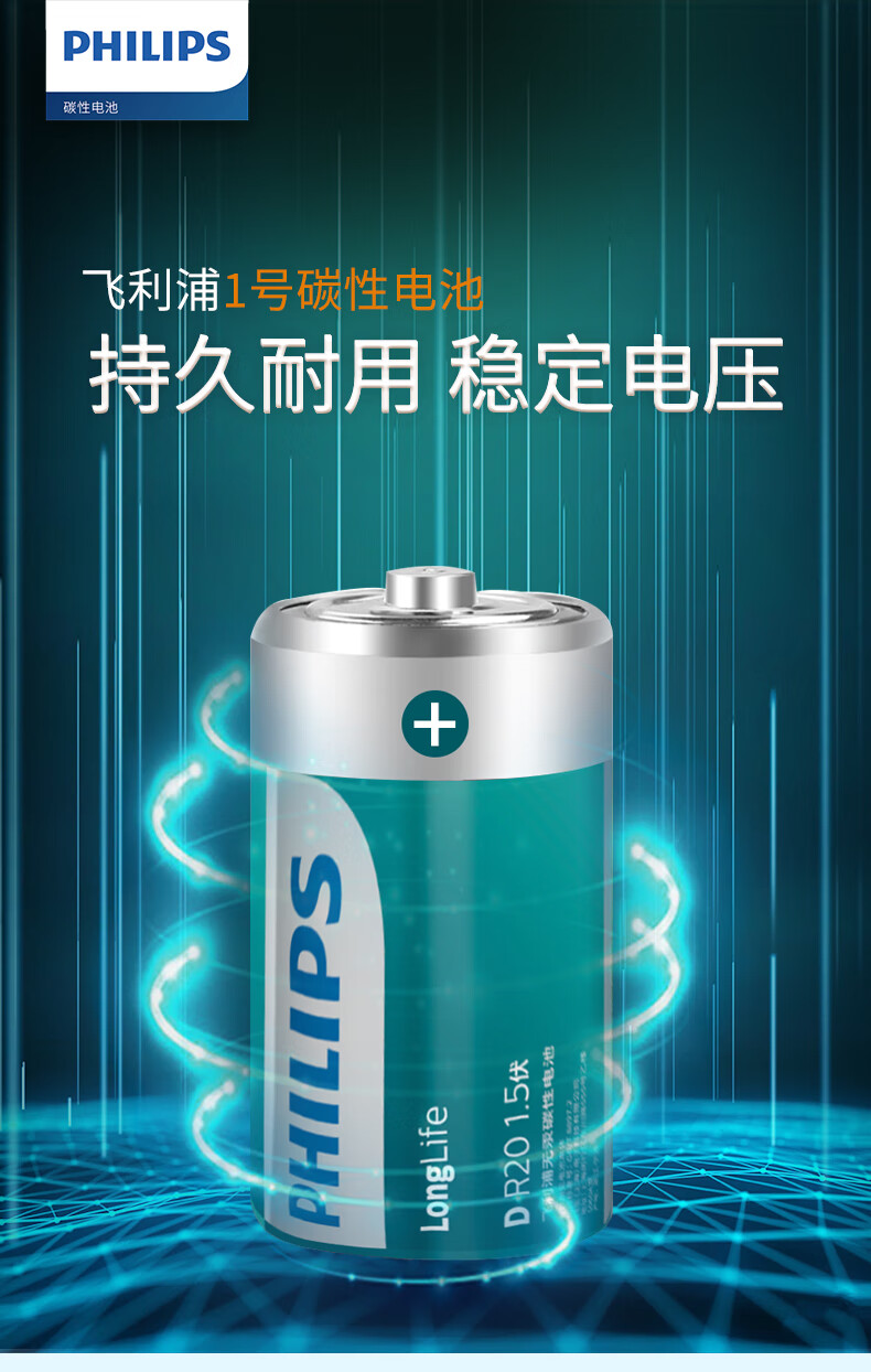 Philips Carbon Gas Stove Battery Large No. 1 Battery Suitable for Water Heater/Gas Stove/Flashlight/Radio/Electronic Organ No. 1 Battery R20 Philips Carbon No. 1 Battery 2 Blister